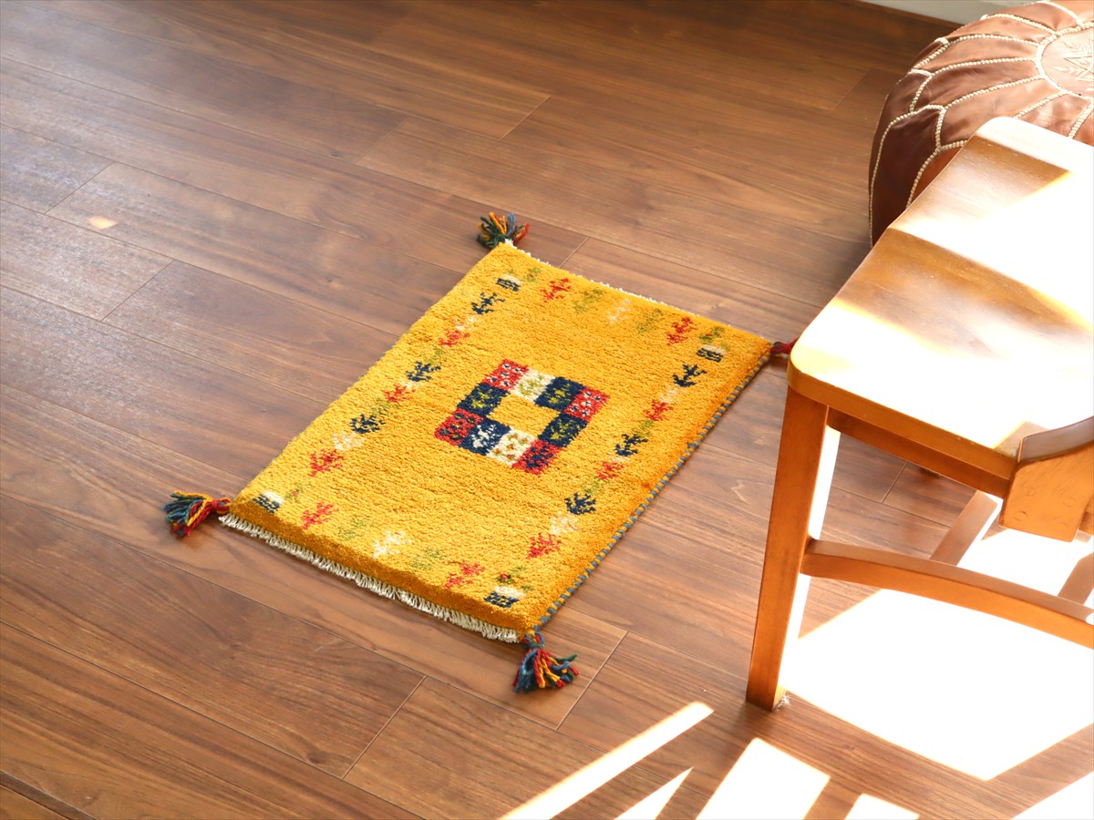 Key:ギャッベ,ギャベ,一点もの 現品販売 ラグ,ウール製,イラン,手織り,じゅうたん,絨毯,座布団, イエロー オレンジ 黄色 草木染, ガラタバザール Gabbeh, Handmade, Hand knotted, Tribal rug, Iran carpet, Wool, Natural Dye,