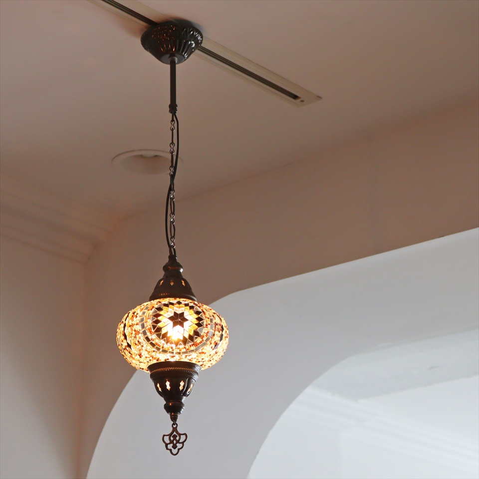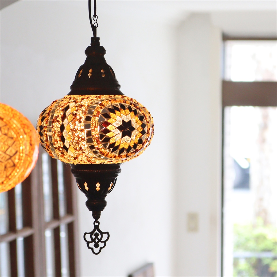 - トルコランプ モザイクランプ ペンダントランプ 直径16cm アンバー