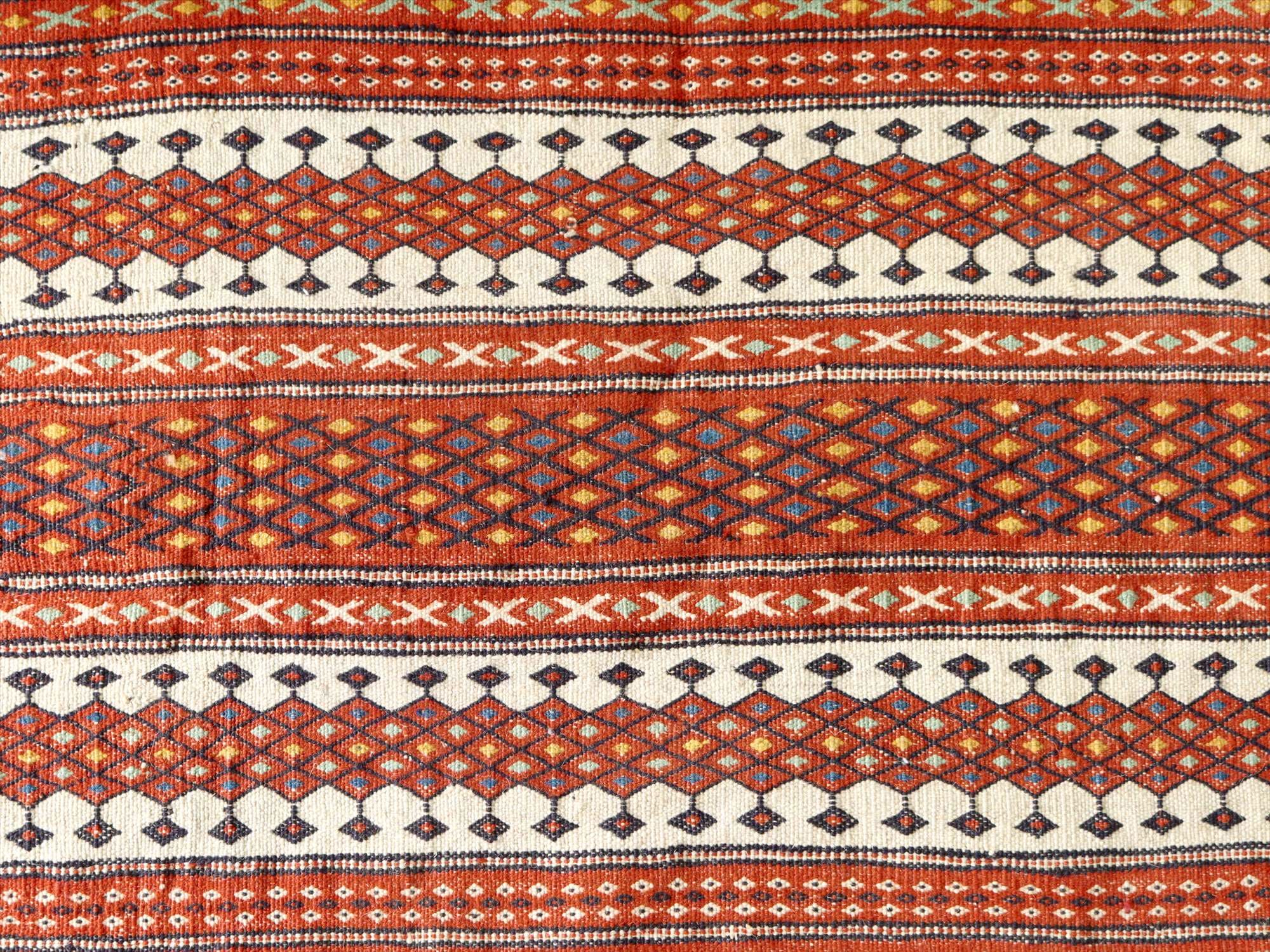 刺繍のようなスザンニ織りのキリム イラン東北部カラート 200×145cm 暖色系のボーダー