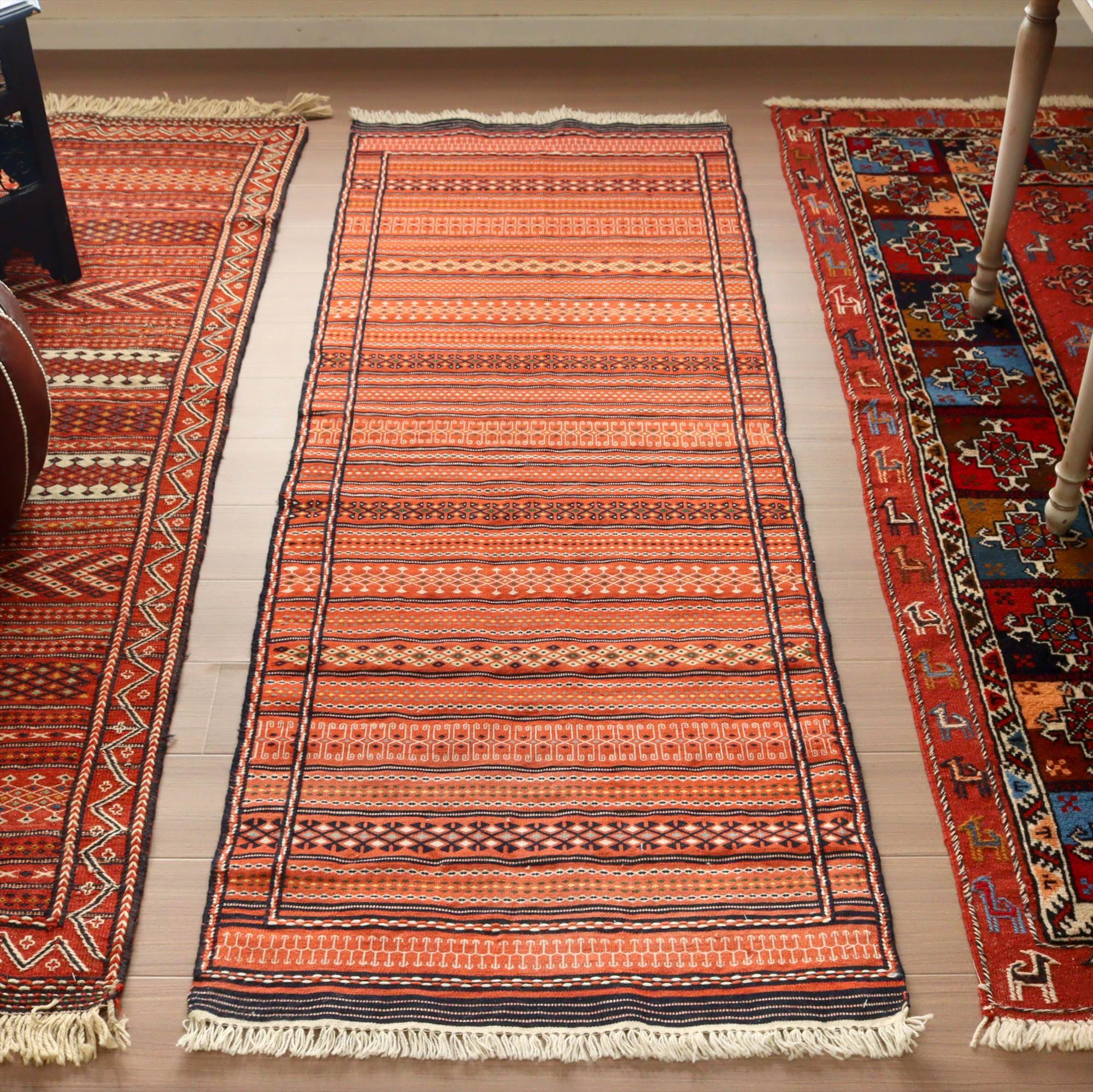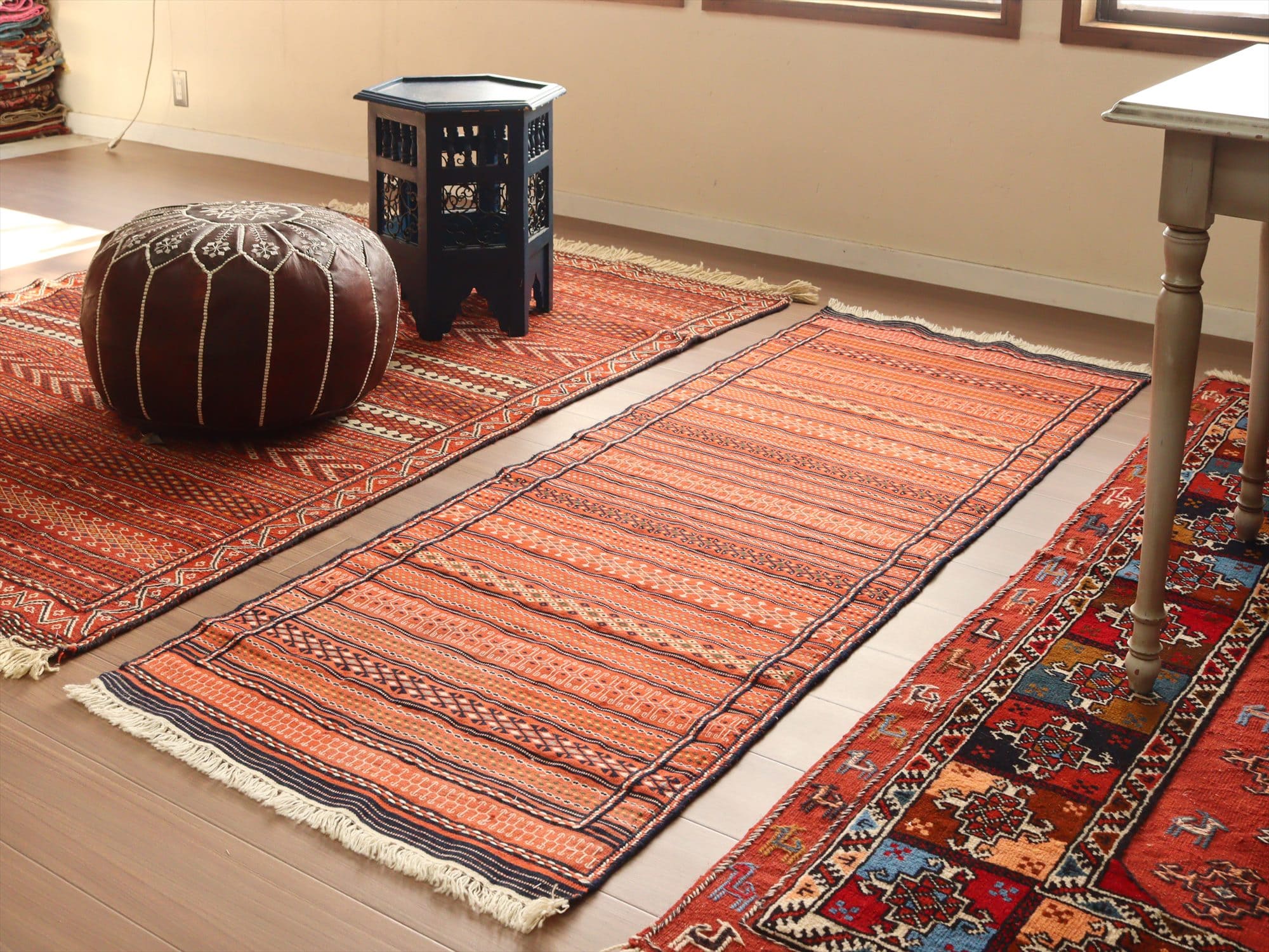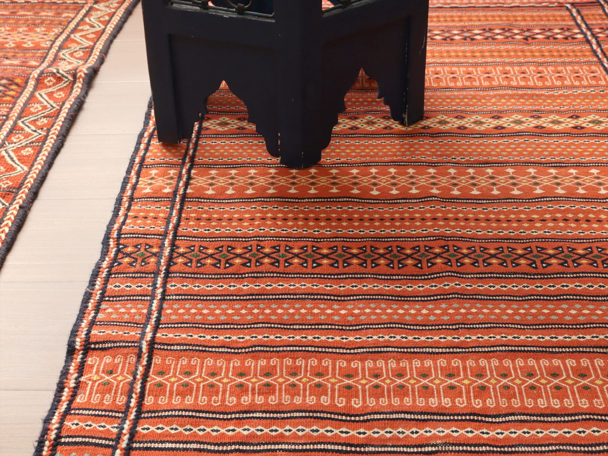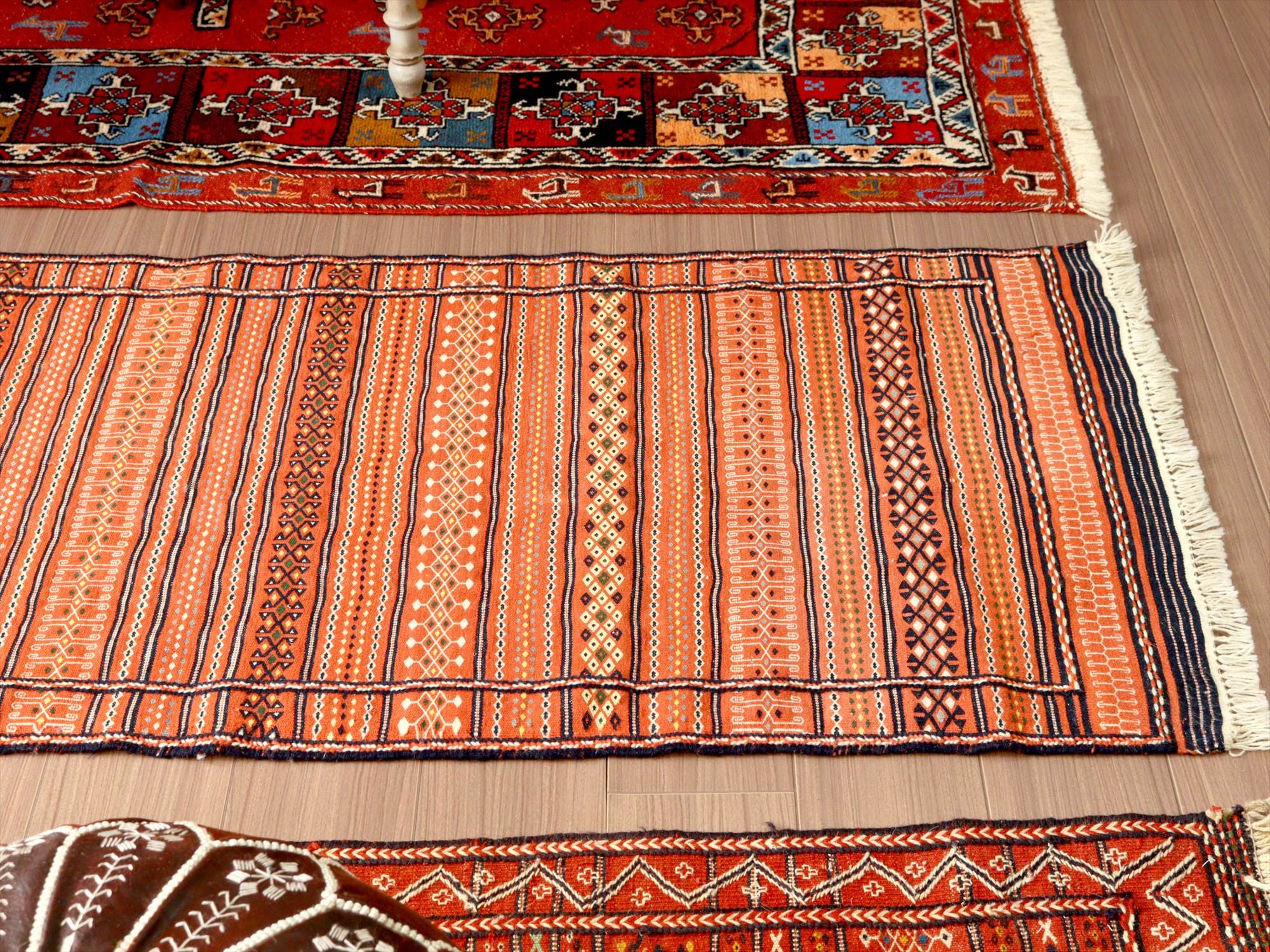 - 刺繍のようなスザンニ織りのキリム イラン東北部カラート 198×72cm 幾何学模様のボーダーデザイン