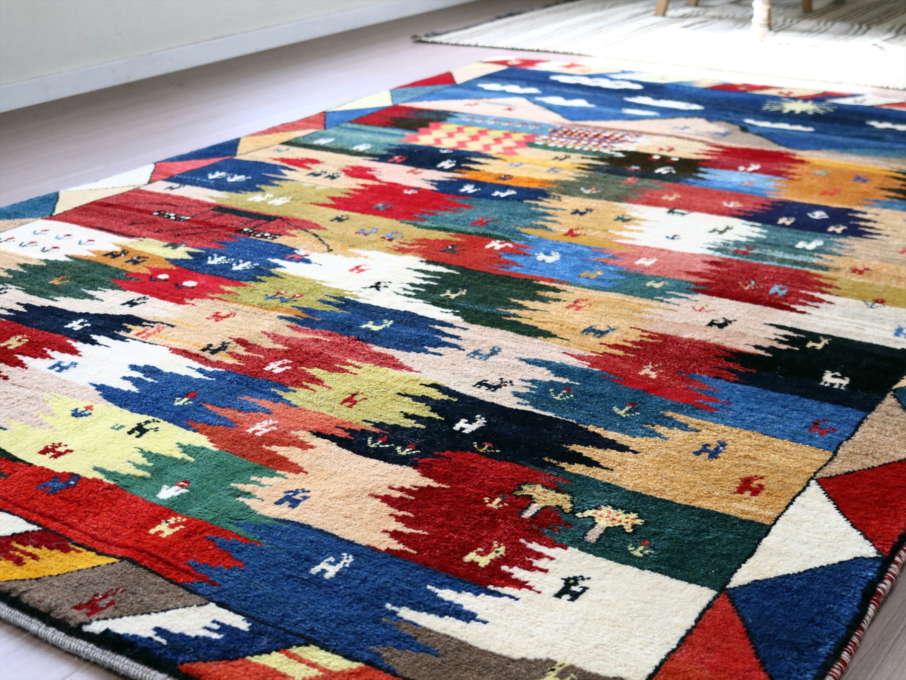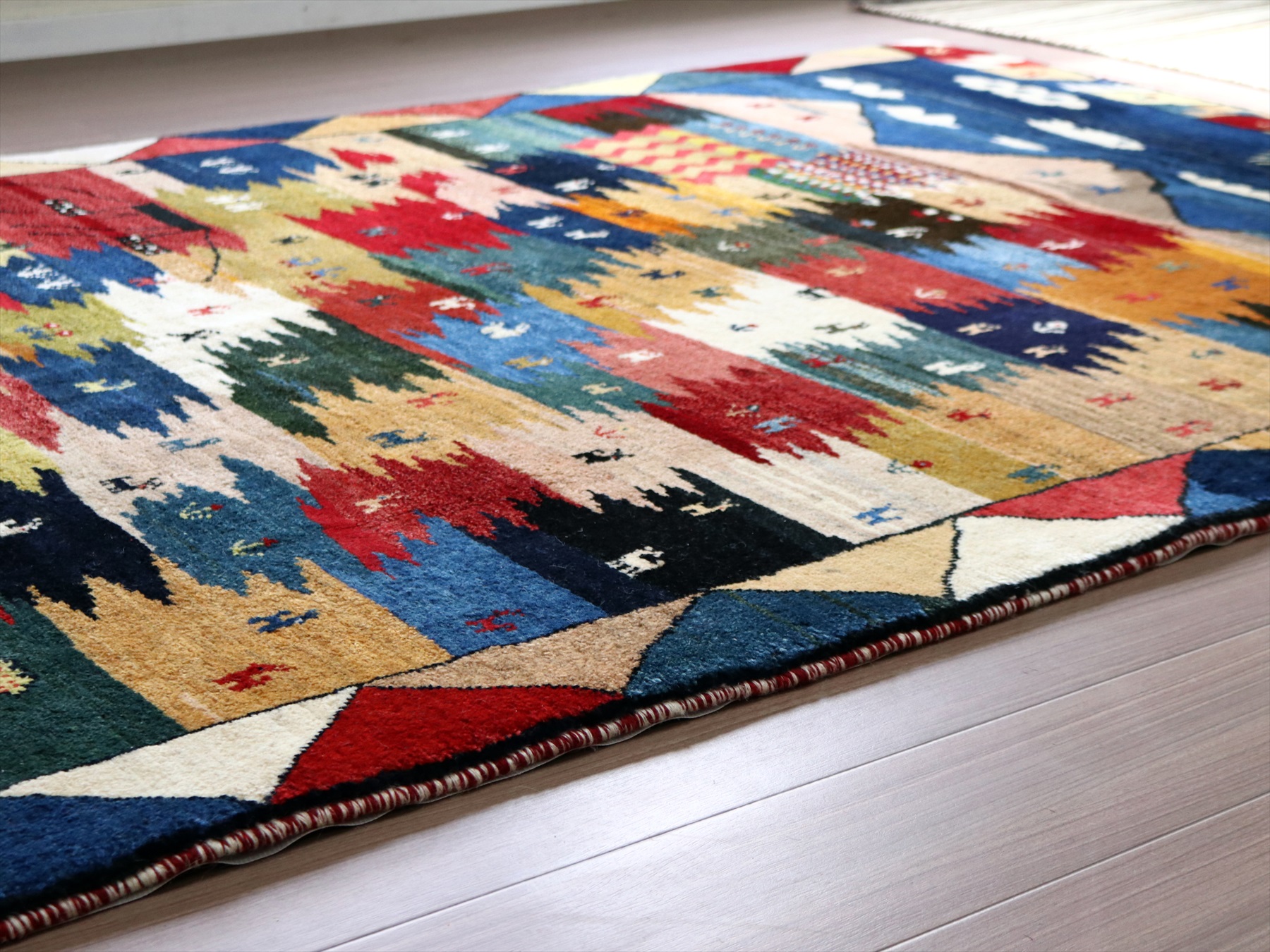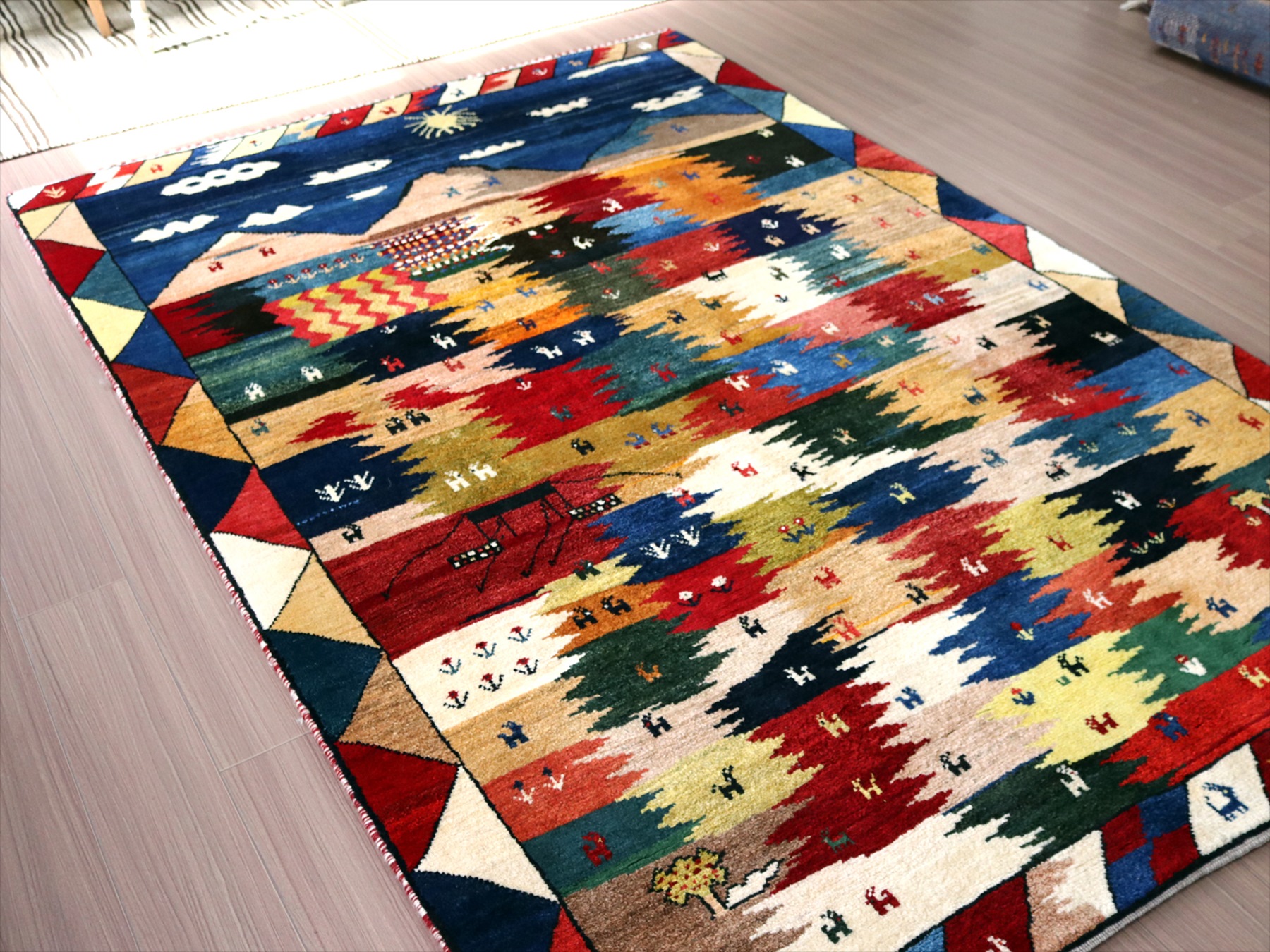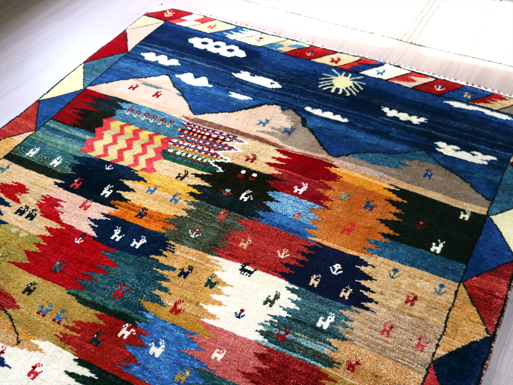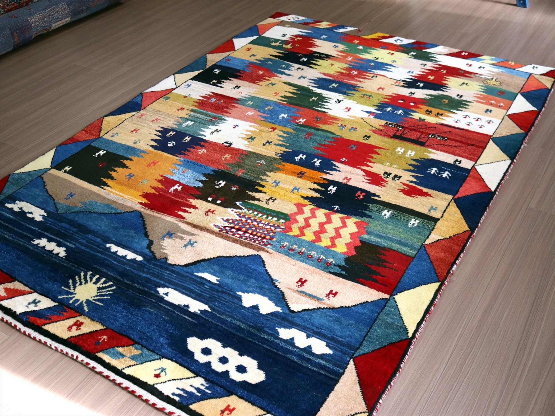 ユニークな色使いでカシュカイ族の生活風景が織られた1枚。太陽や空、生活に使うテント、山々も表現されています。インパクトが大きく目を引くこと間違いなしです。