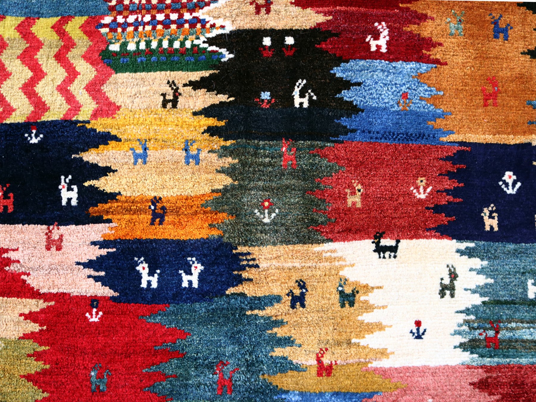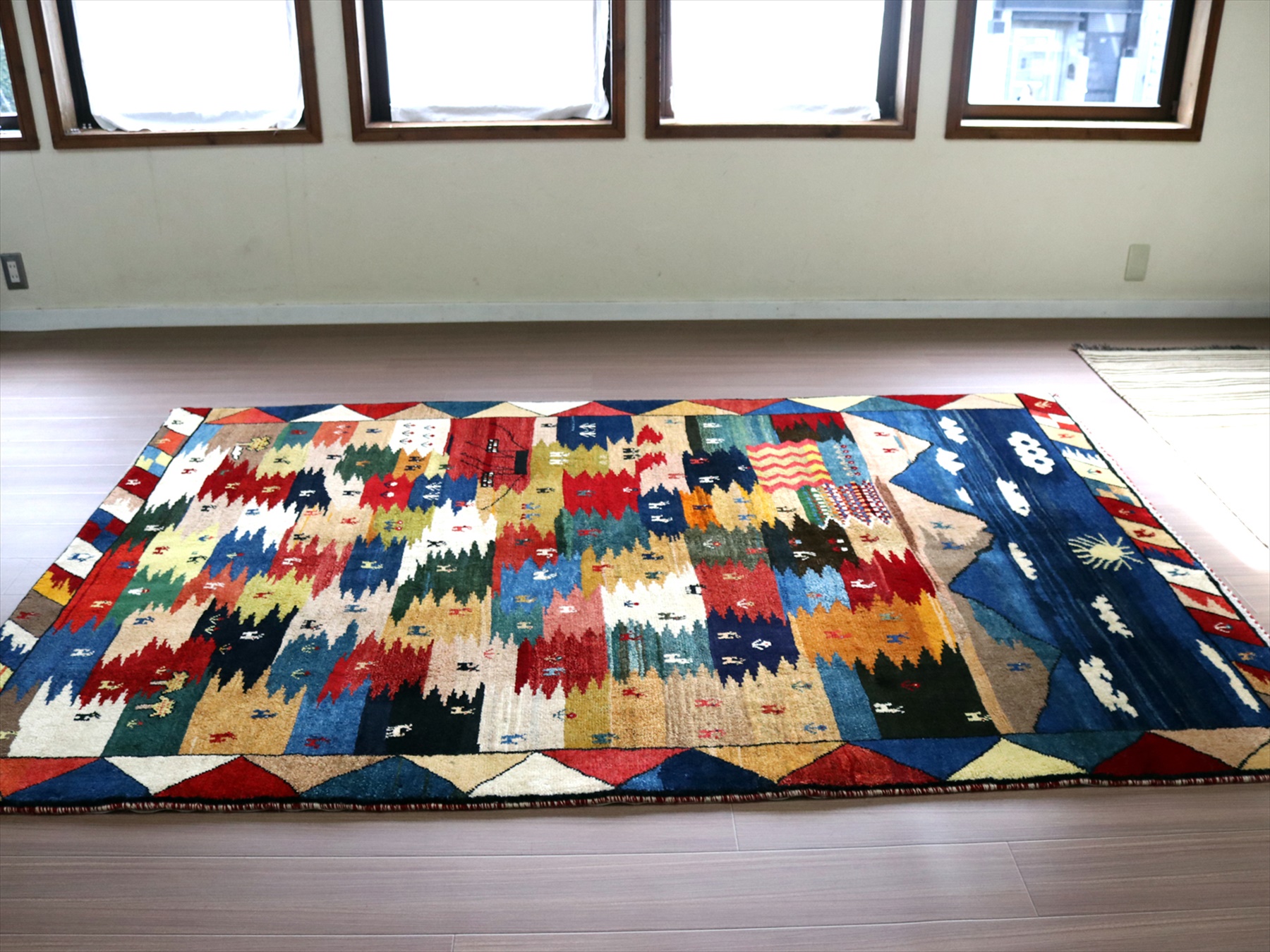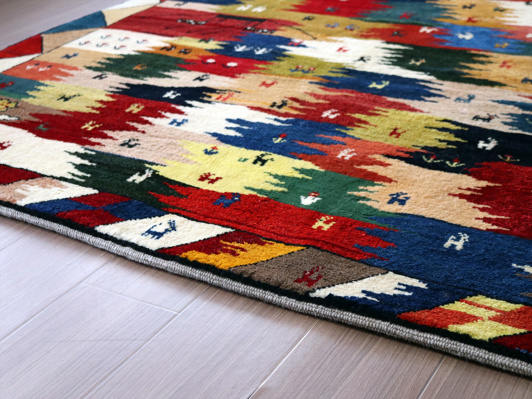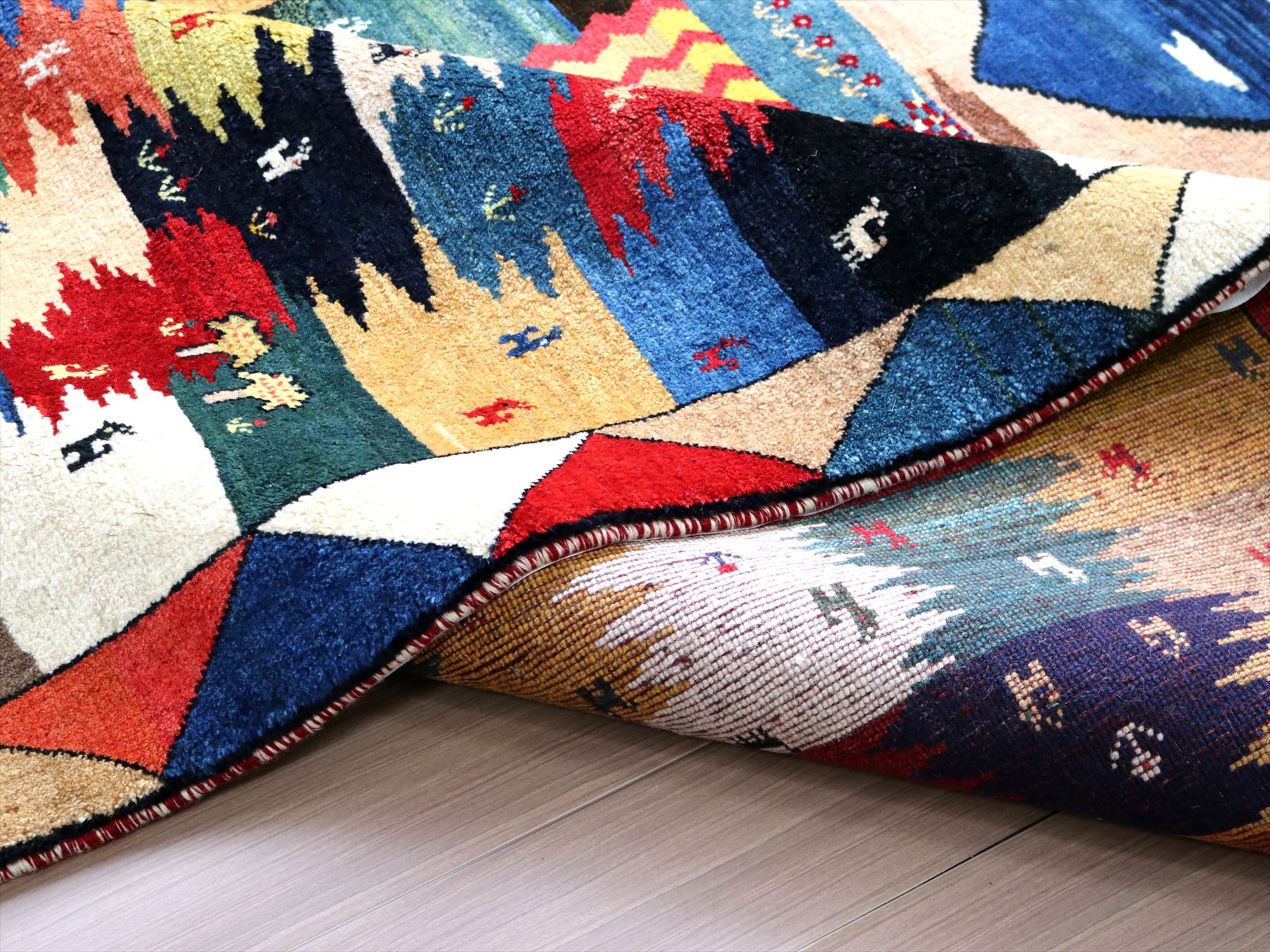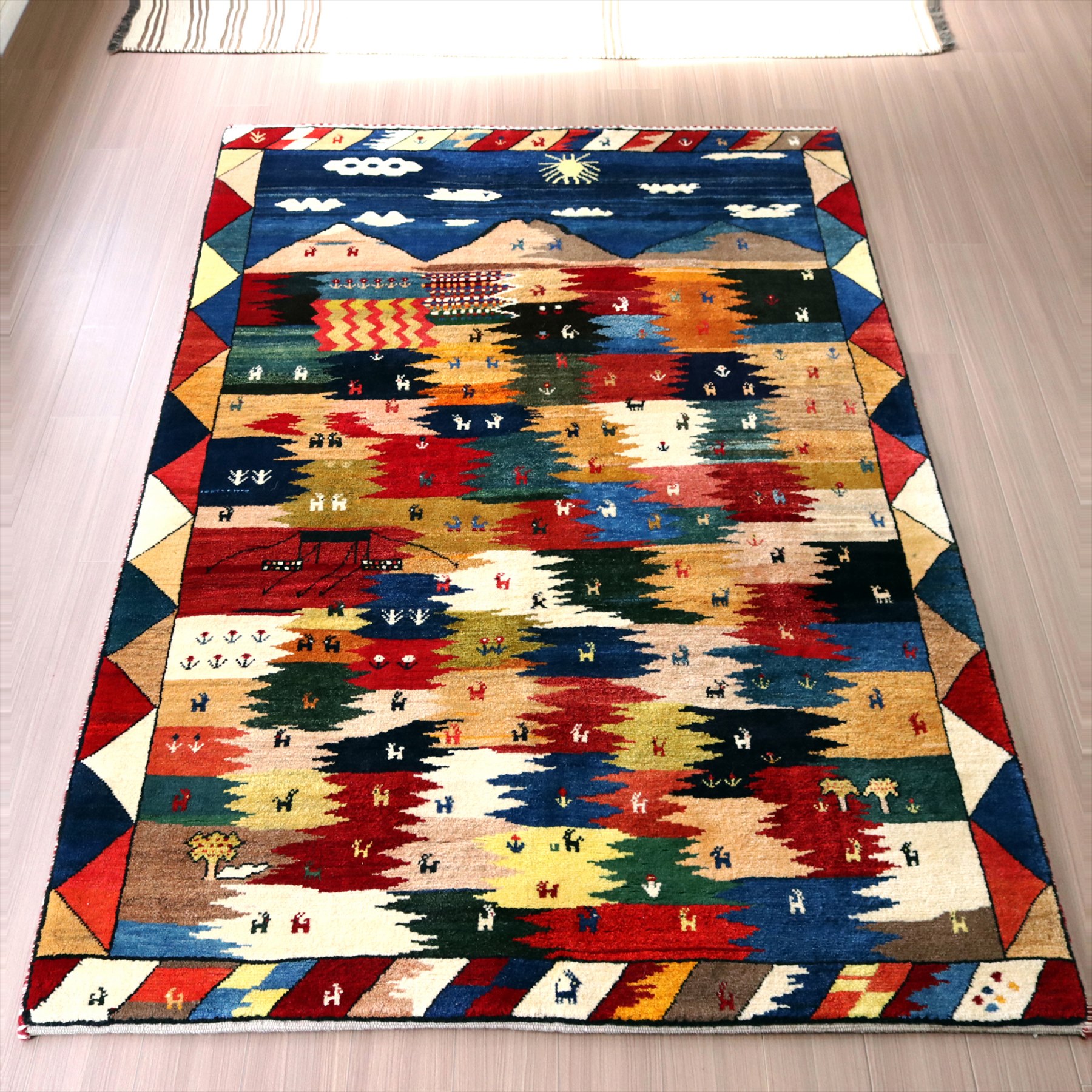 ユニークな色使いでカシュカイ族の生活風景が織られた1枚。太陽や空、生活に使うテント、山々も表現されています。インパクトが大きく目を引くこと間違いなしです。