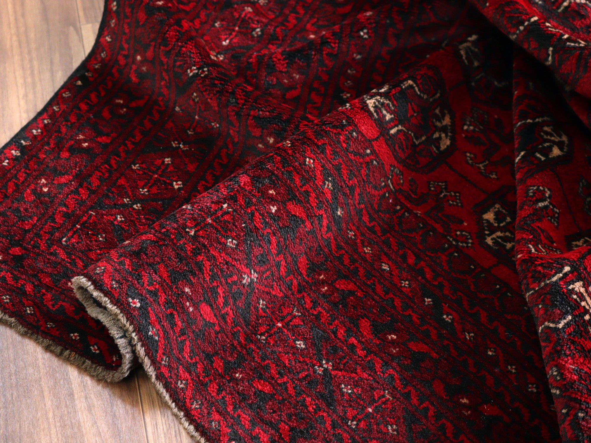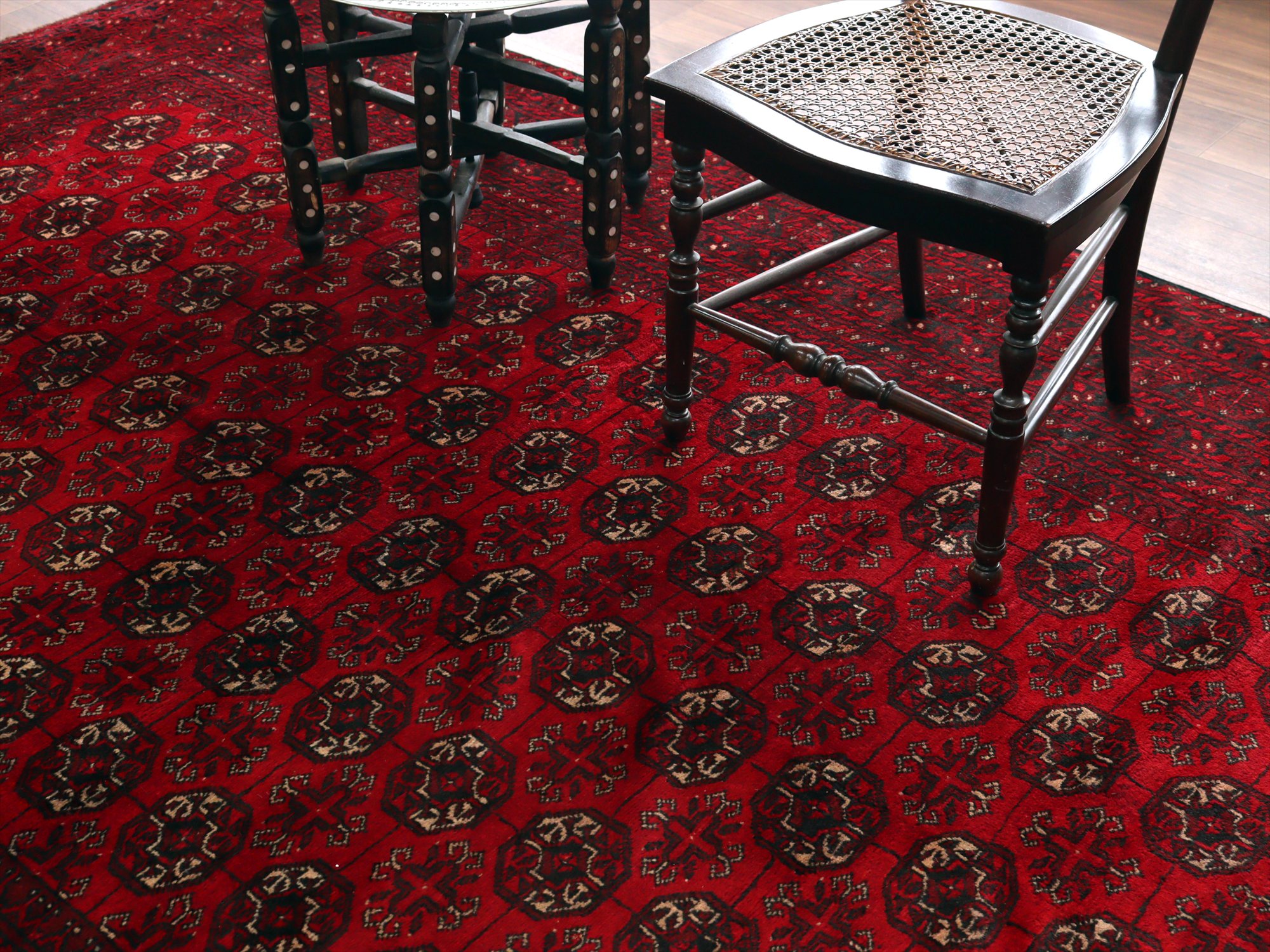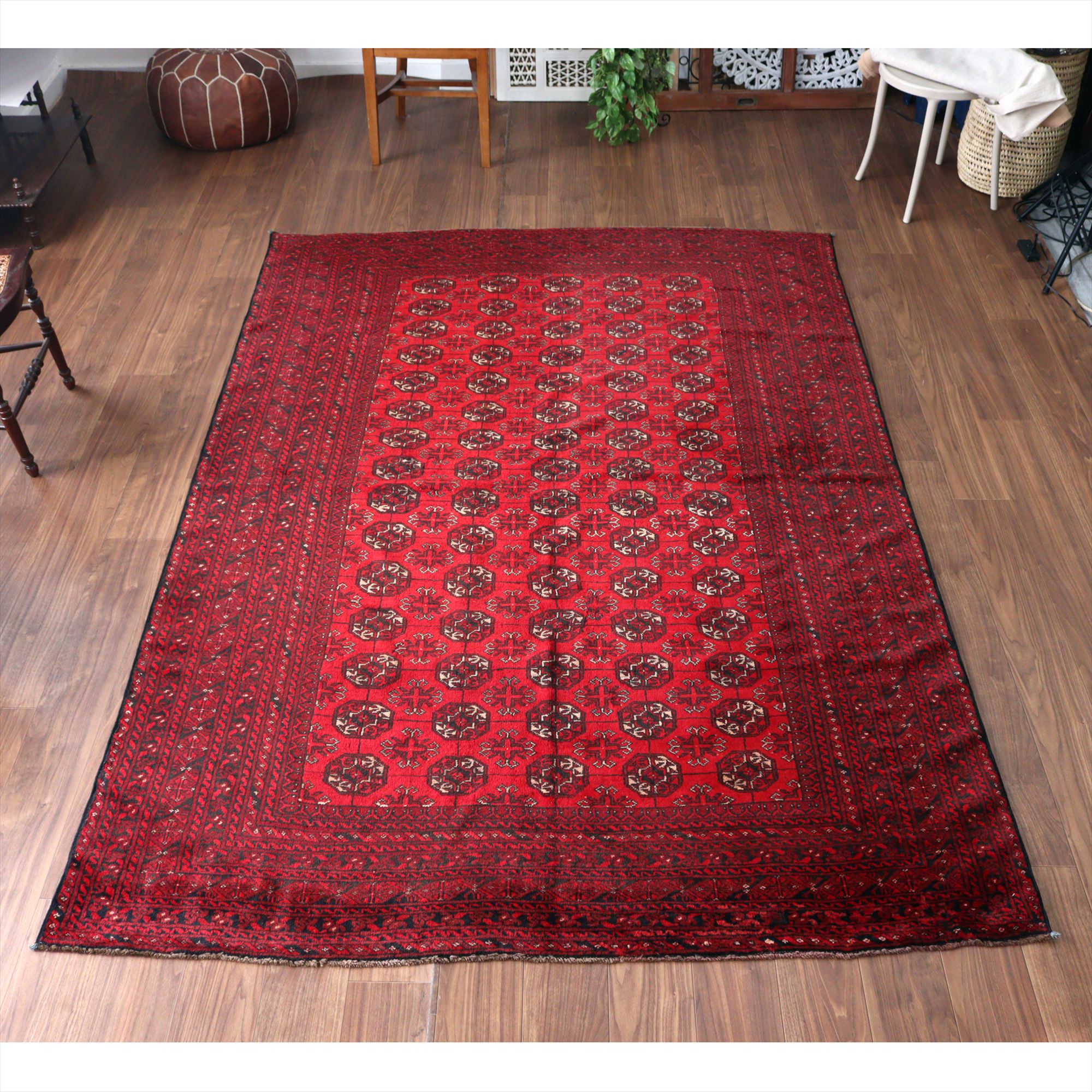 トーンの異なるレッドで織られた幾何学模様が連続するアフガン絨毯。クラシックで重厚感のある佇まいが、お部屋を落ち着いた雰囲気に。