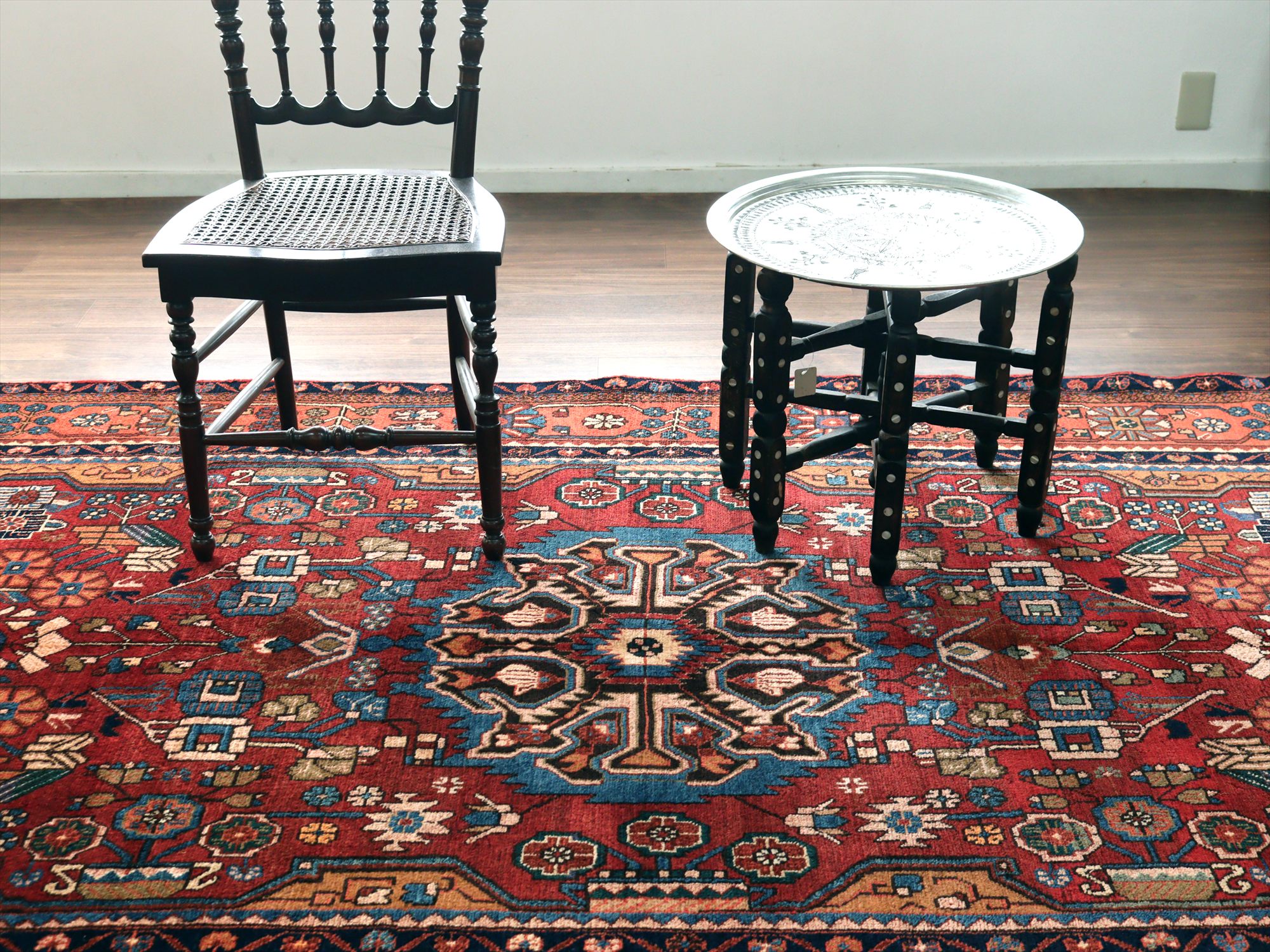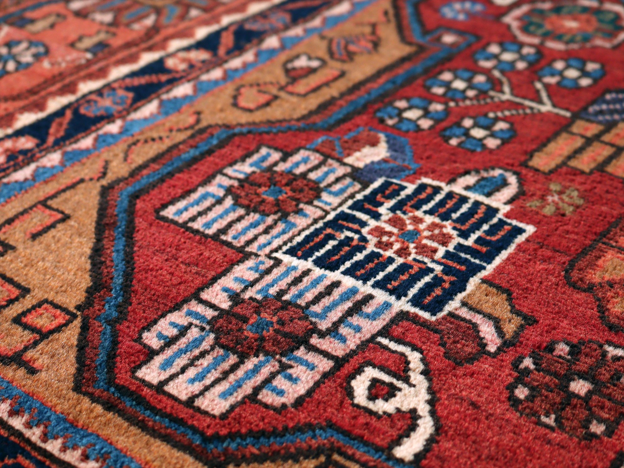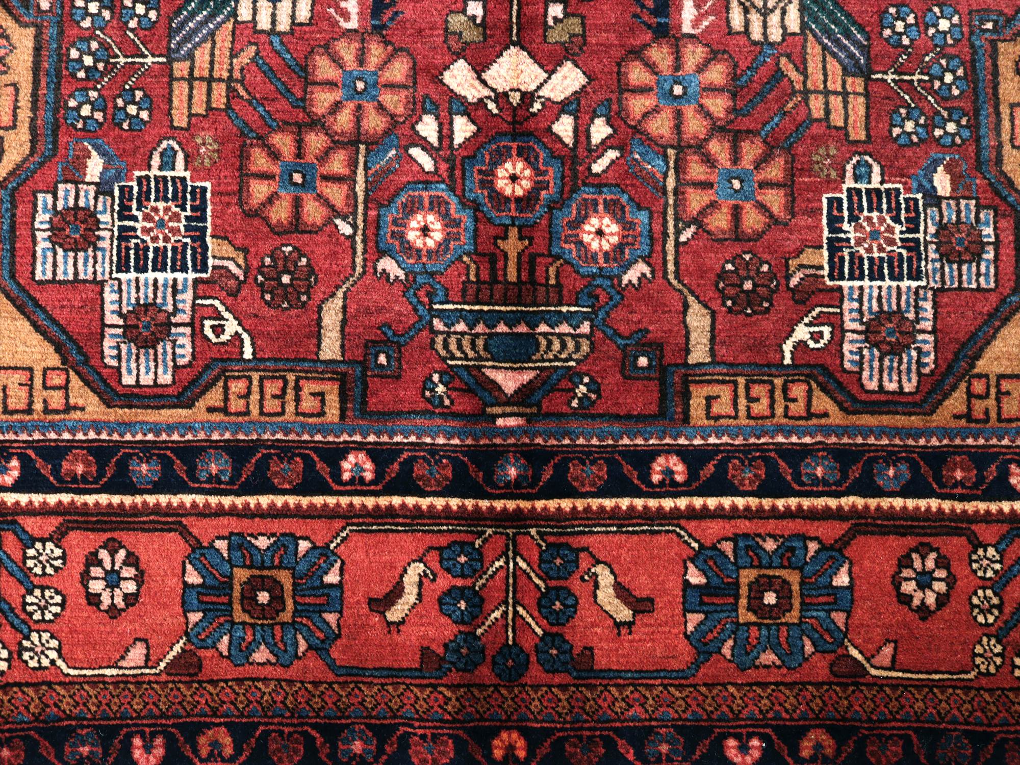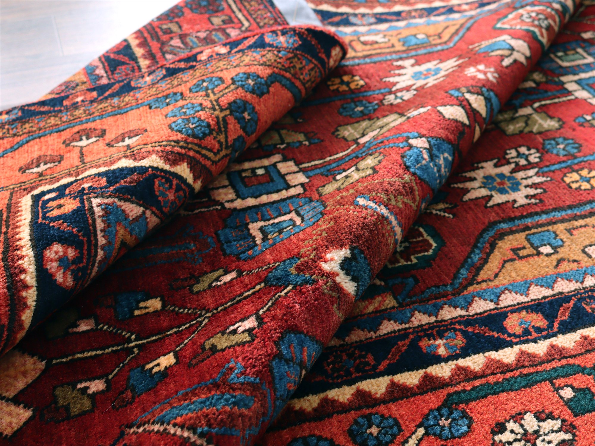 イラン西部、ハマダンの北に位置するナハバンドの絨毯です。デザインの多くが花で構成されていて、力強い色使いながらも華やかな雰囲気の絨毯です。また、目立たない程度に、さりげなく小鳥が織られているのもかわいらしく目を引きます。