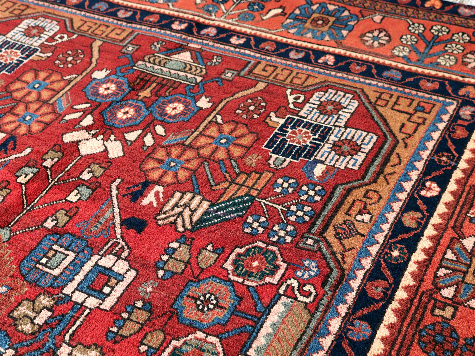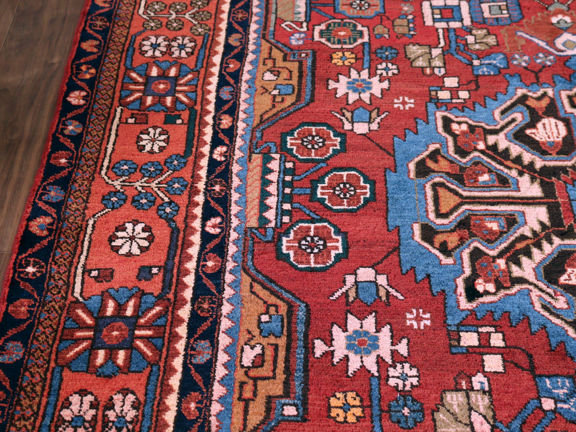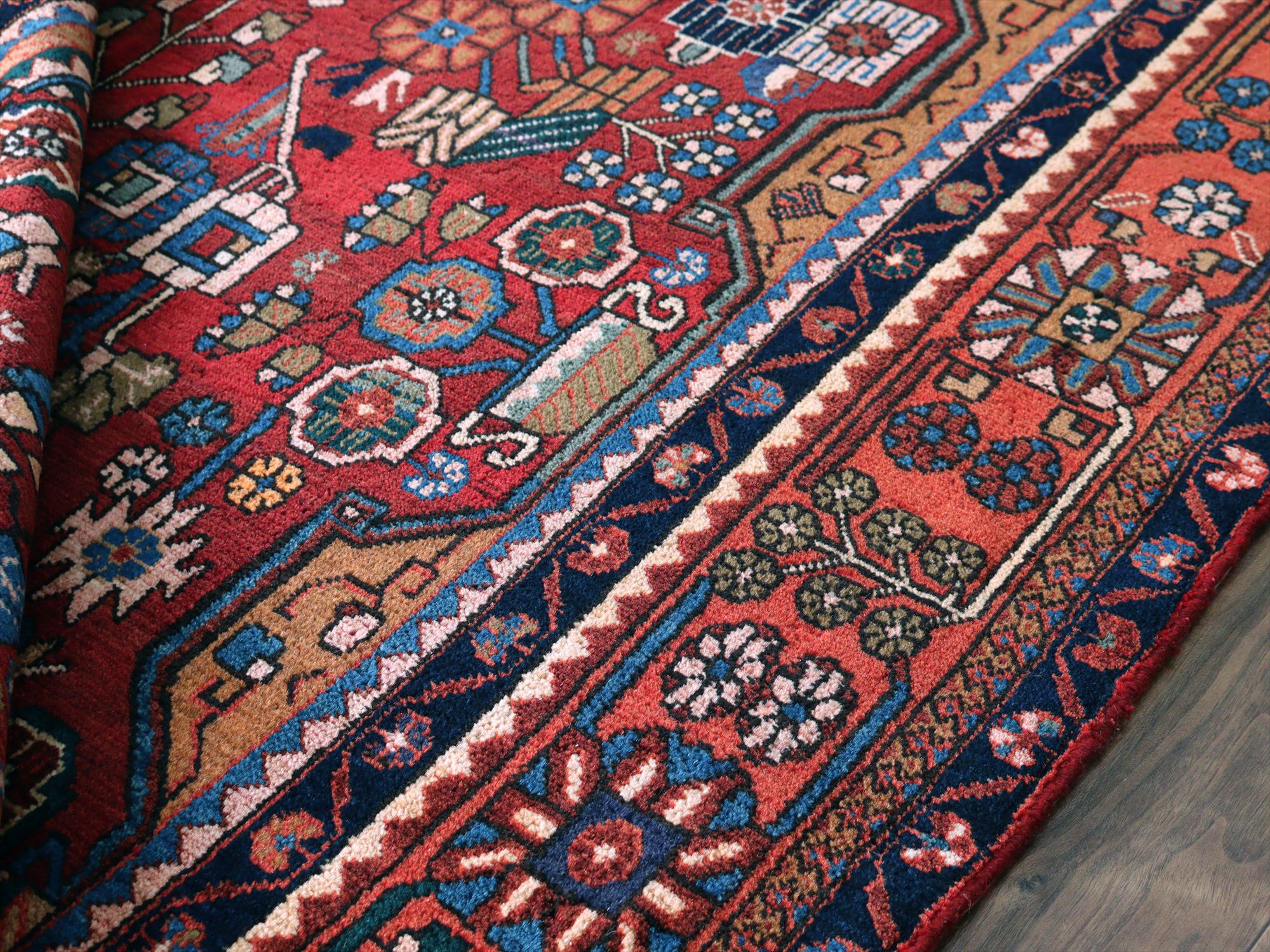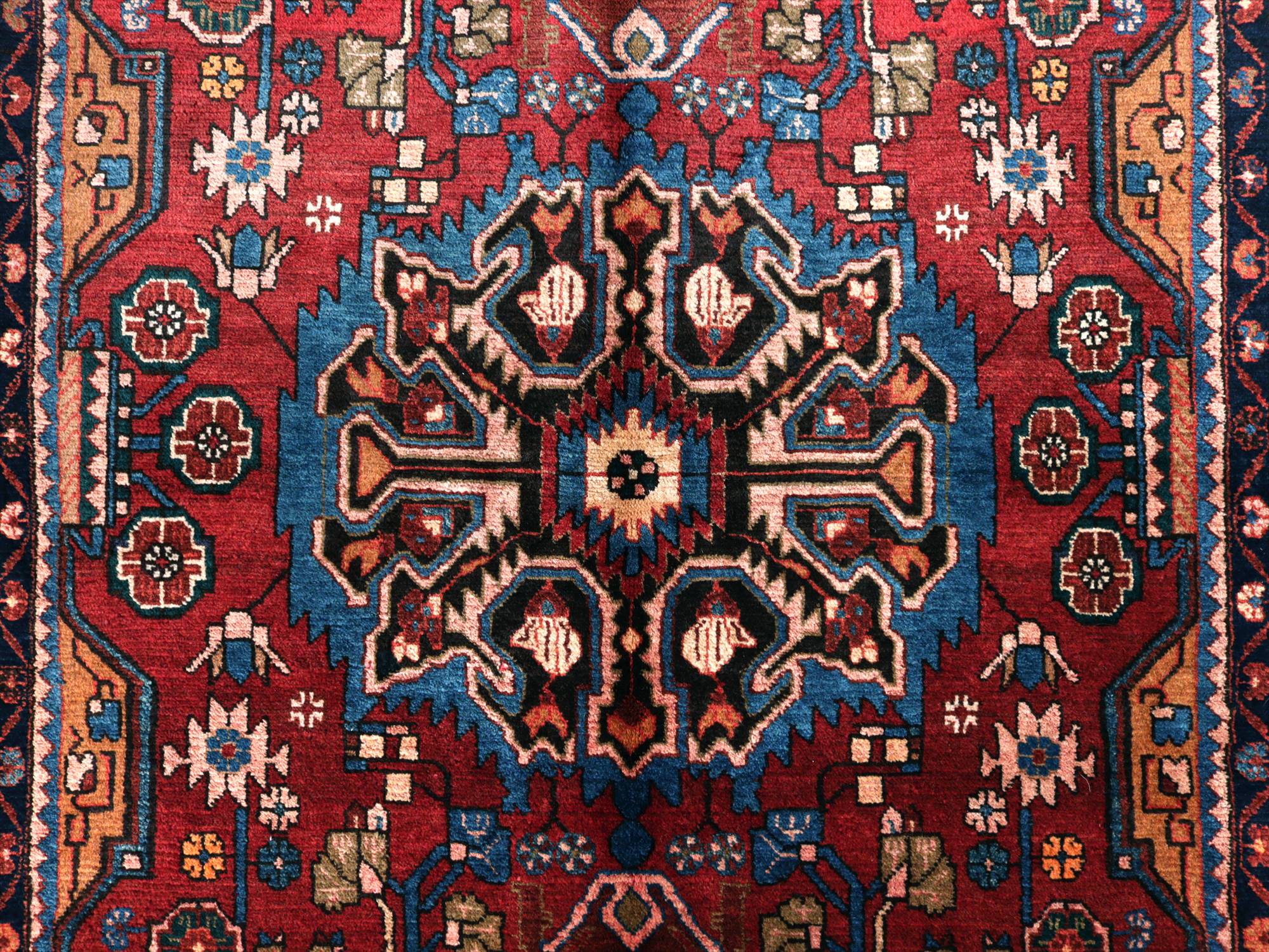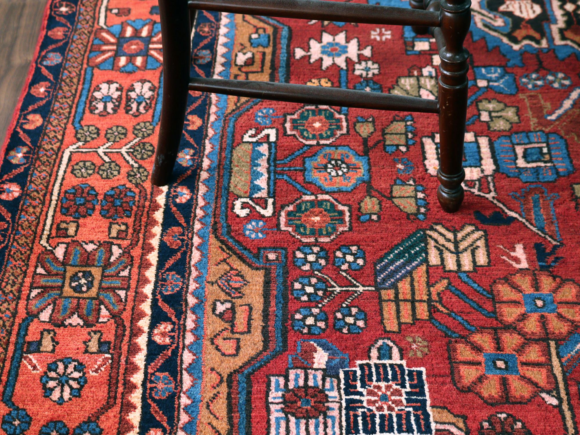 イラン西部、ハマダンの北に位置するナハバンドの絨毯です。デザインの多くが花で構成されていて、力強い色使いながらも華やかな雰囲気の絨毯です。また、目立たない程度に、さりげなく小鳥が織られているのもかわいらしく目を引きます。