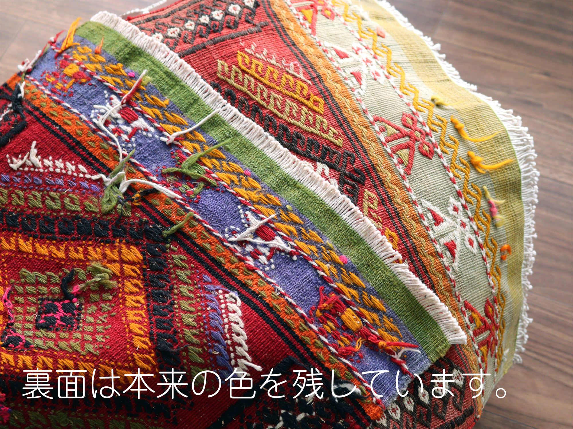 目の詰まった細かい織り地です。裏表で比較すると、日焼けしてかなり色褪せているのが確認できます。モチーフの部分はジジム織りになっていて、立体的なテクスチャです。