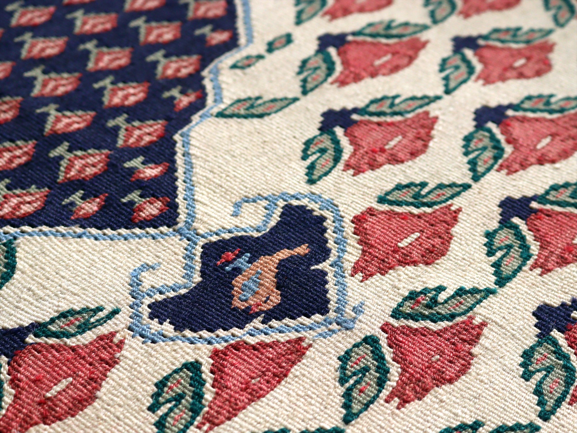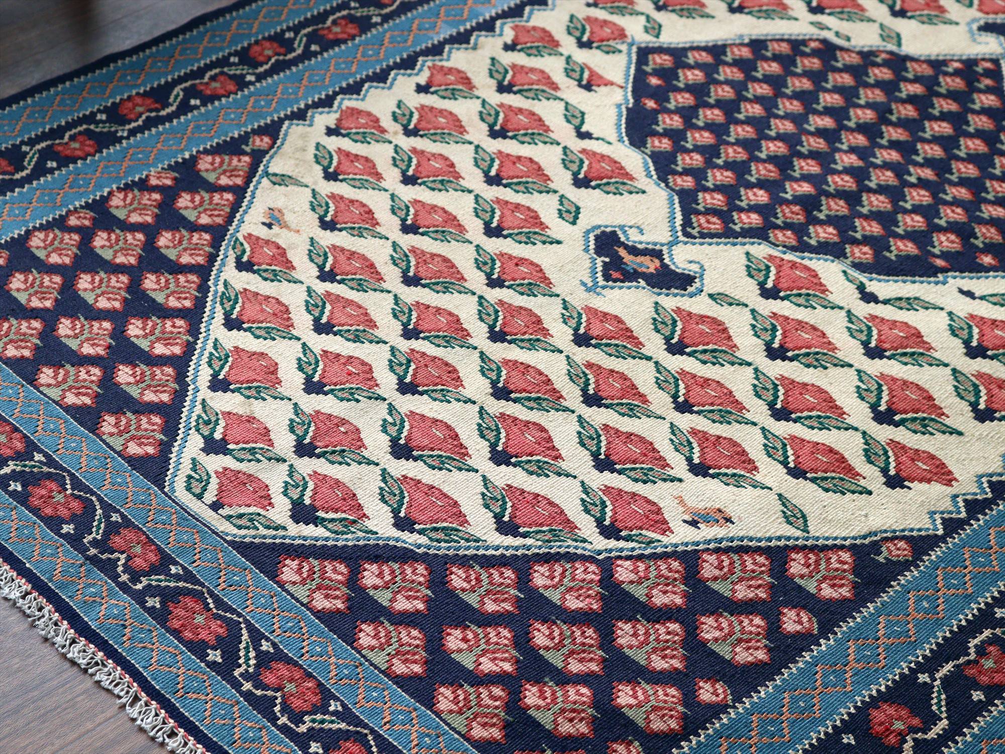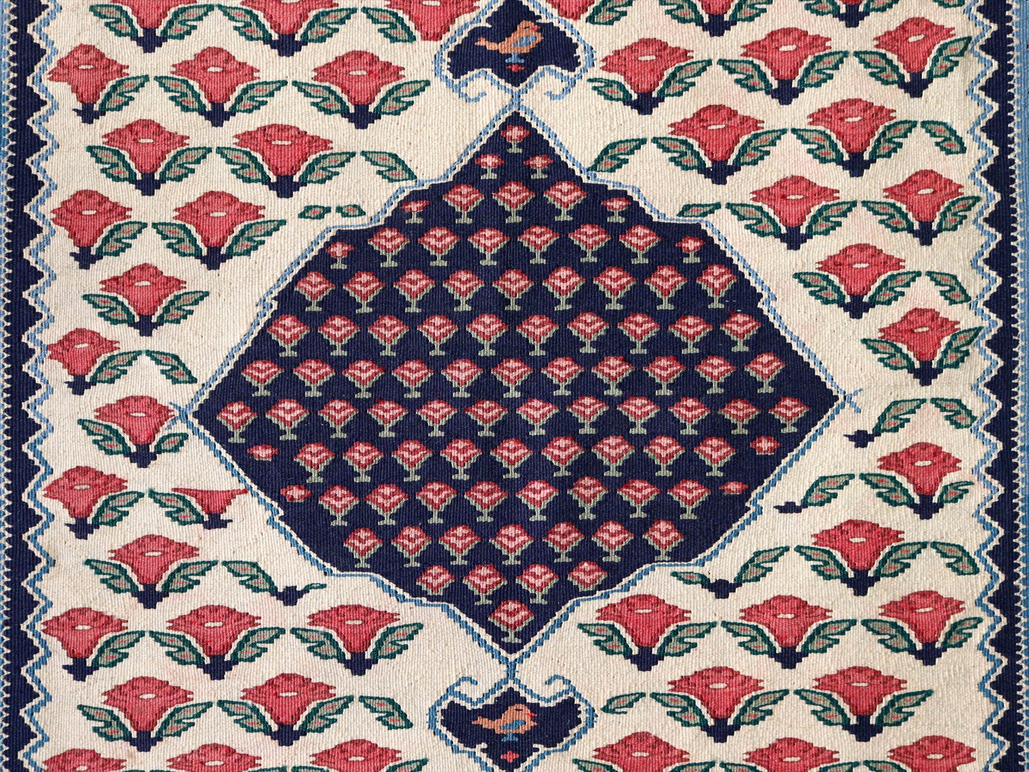 全体にに小さなピンクの花が並ぶ愛らしいモチーフ。イランの首都テヘランから、西に広がるビジャール地方の伝統柄です。メダリオンのかたちも特徴的です。