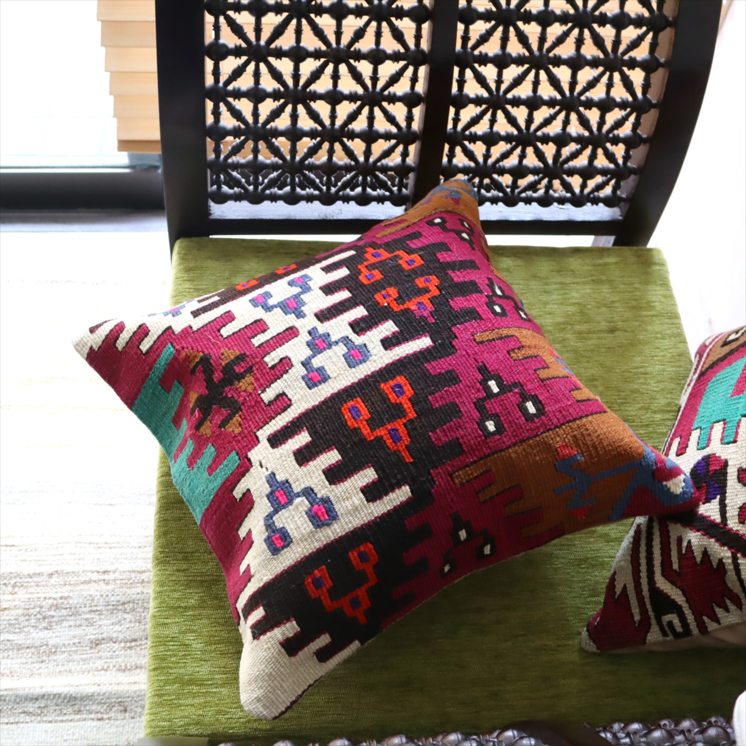 Key:Old Kilim, Kilim Cushion, Turkish Kilim, BOHO, Bohemian Decor, Vintage kilim, クッションカバー, オールドキリム, トルコ, ヴィンテージキリム, トライバルラグ, ピロー, ボヘミアンスタイル, BO-HO, ウール100%, 手織り, 一点もの, ガラタバザール