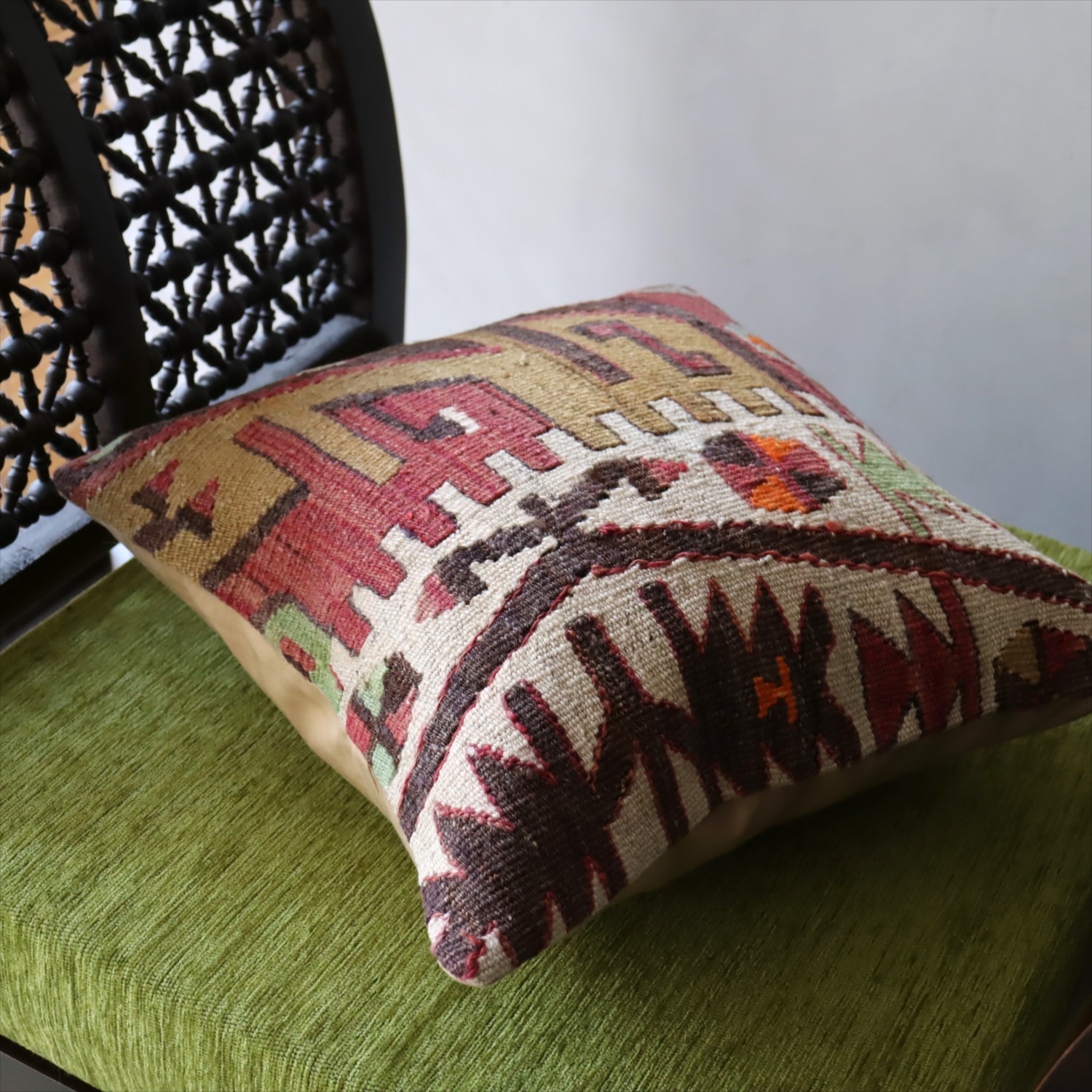 Key:Old Kilim, Kilim Cushion, Turkish Kilim, BOHO, Bohemian Decor, Vintage kilim, クッションカバー, オールドキリム, トルコ, ヴィンテージキリム, トライバルラグ, ピロー, ボヘミアンスタイル, BO-HO, ウール100%, 手織り, 一点もの, ガラタバザール