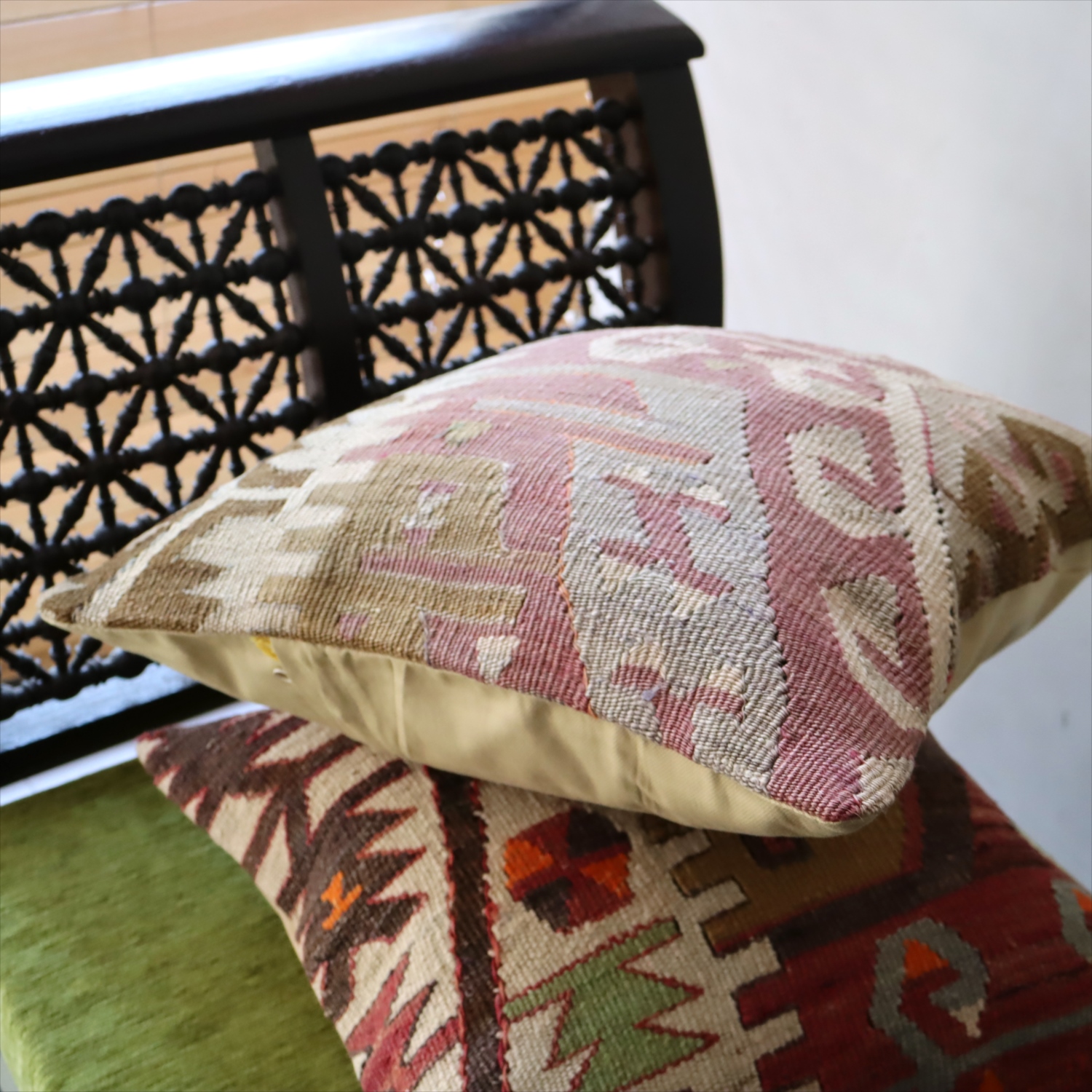 Key:Old Kilim, Kilim Cushion, Turkish Kilim, BOHO, Bohemian Decor, Vintage kilim, クッションカバー, オールドキリム, トルコ, ヴィンテージキリム, トライバルラグ, ピロー, ボヘミアンスタイル, BO-HO, ウール100%, 手織り, 一点もの, ガラタバザール