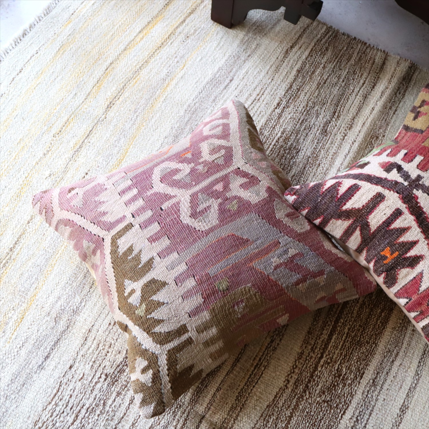 細い糸を使って織られた大型の平織りキリムをカットして作ったクッションカバーです。表面はウールのヴィンテージキリム、裏面は無地のコットン地です。