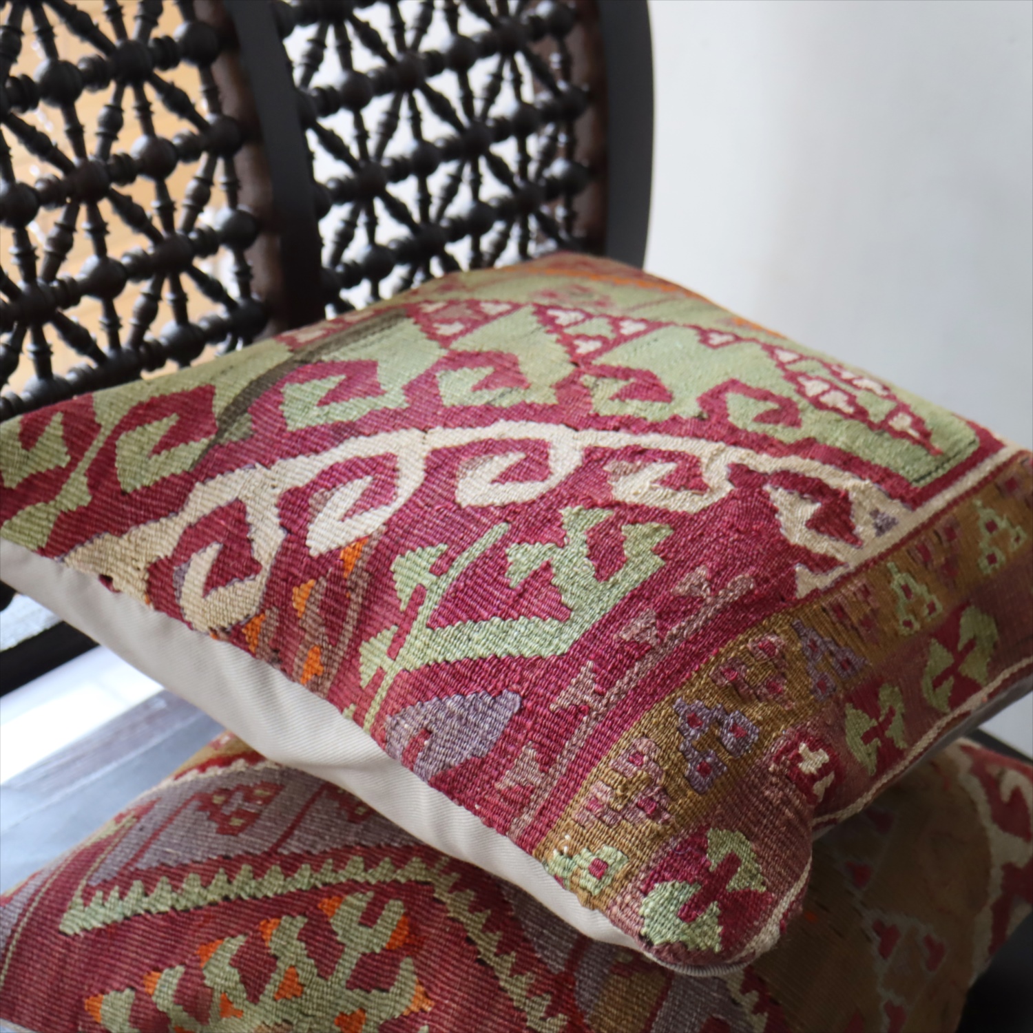 細い糸を使って織られた大型の平織りキリムをカットして作ったクッションカバーです。表面はウールのヴィンテージキリム、裏面は無地のコットン地です。