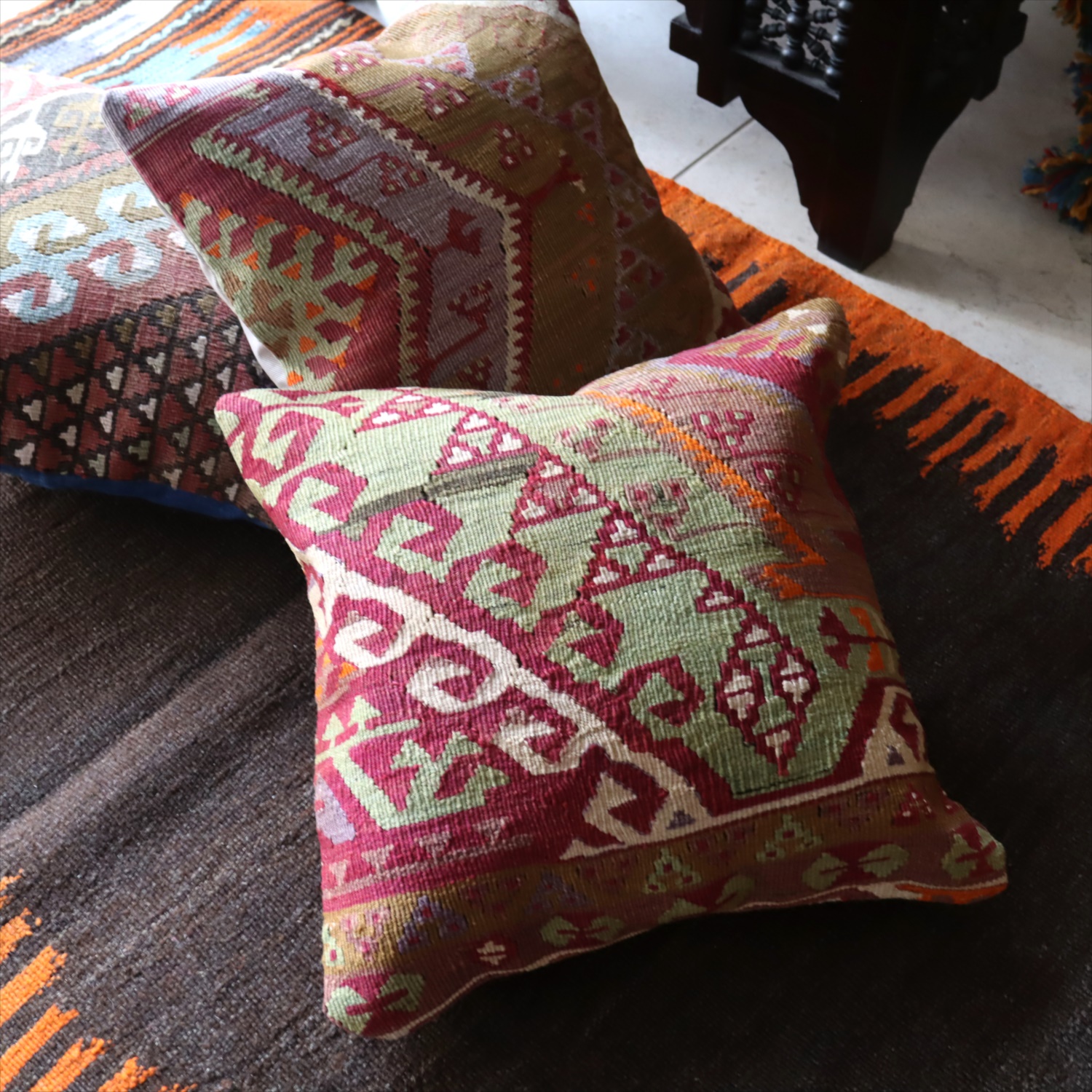 クッションカバーにすると、一枚のキリムから50枚以上に切り分けられるものもあり、配色が似ていてモチーフのバランスが違うクッションができあがります。