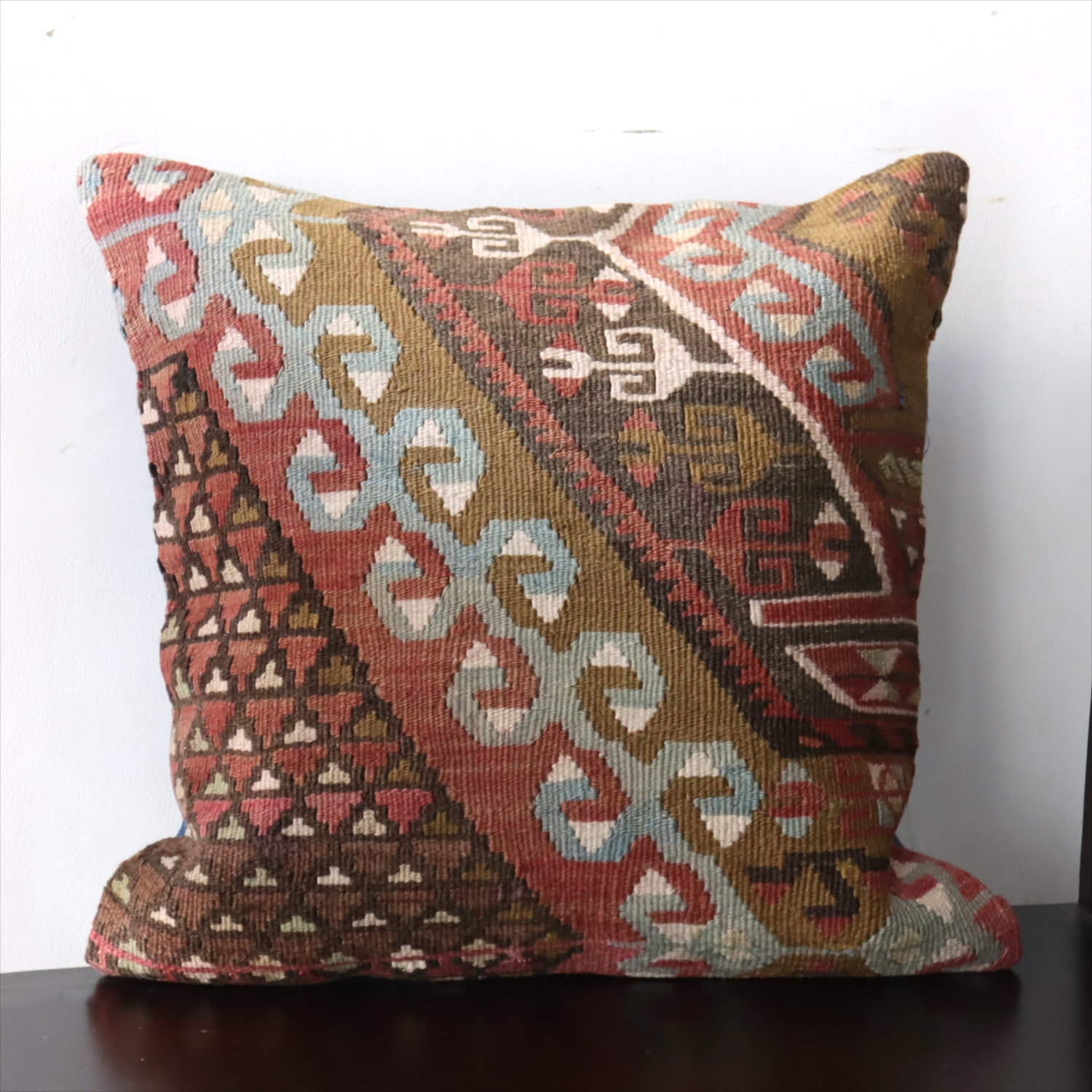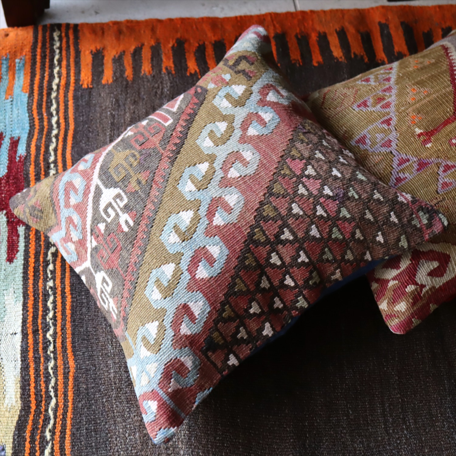 Key:Old Kilim, Kilim Cushion, Turkish Kilim, BOHO, Bohemian Decor, Vintage kilim, クッションカバー, オールドキリム, トルコ, ヴィンテージキリム, トライバルラグ, ピロー, ボヘミアンスタイル, BO-HO, ウール100%, 手織り, 一点もの, ガラタバザール