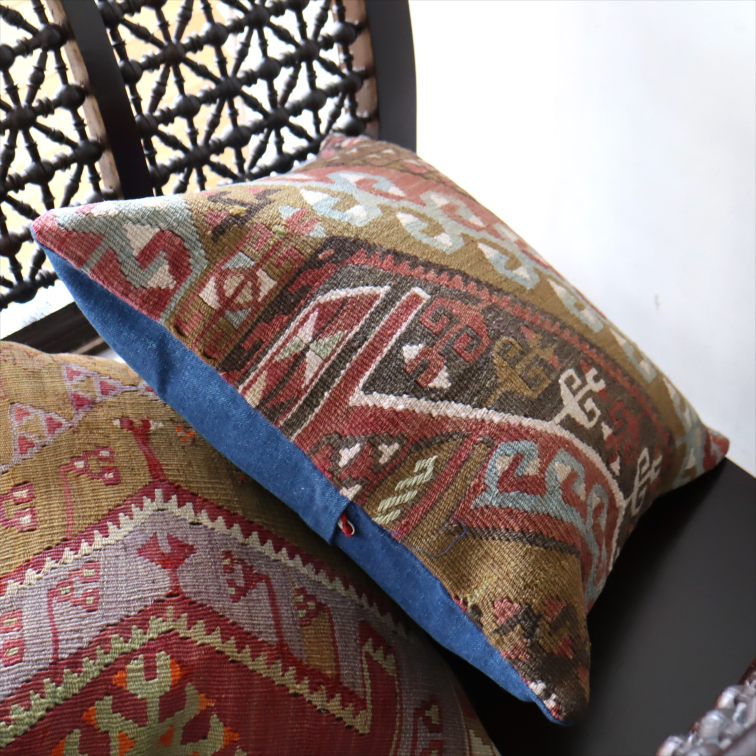 細い糸を使って織られた大型の平織りキリムをカットして作ったクッションカバーです。表面はウールのヴィンテージキリム、裏面は無地のコットン地です。
