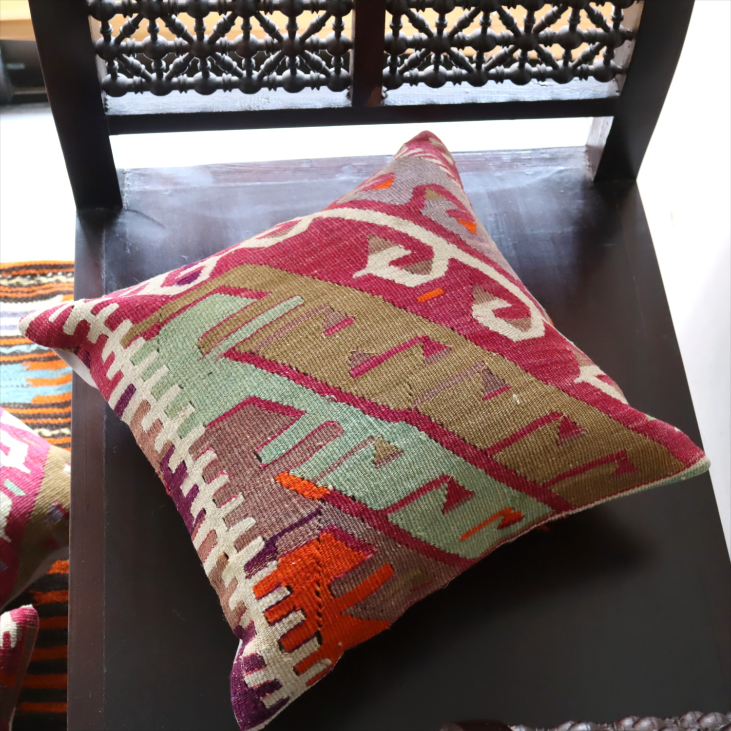 Key:Old Kilim, Kilim Cushion, Turkish Kilim, BOHO, Bohemian Decor, Vintage kilim, クッションカバー, オールドキリム, トルコ, ヴィンテージキリム, トライバルラグ, ピロー, ボヘミアンスタイル, BO-HO, ウール100%, 手織り, 一点もの, ガラタバザール