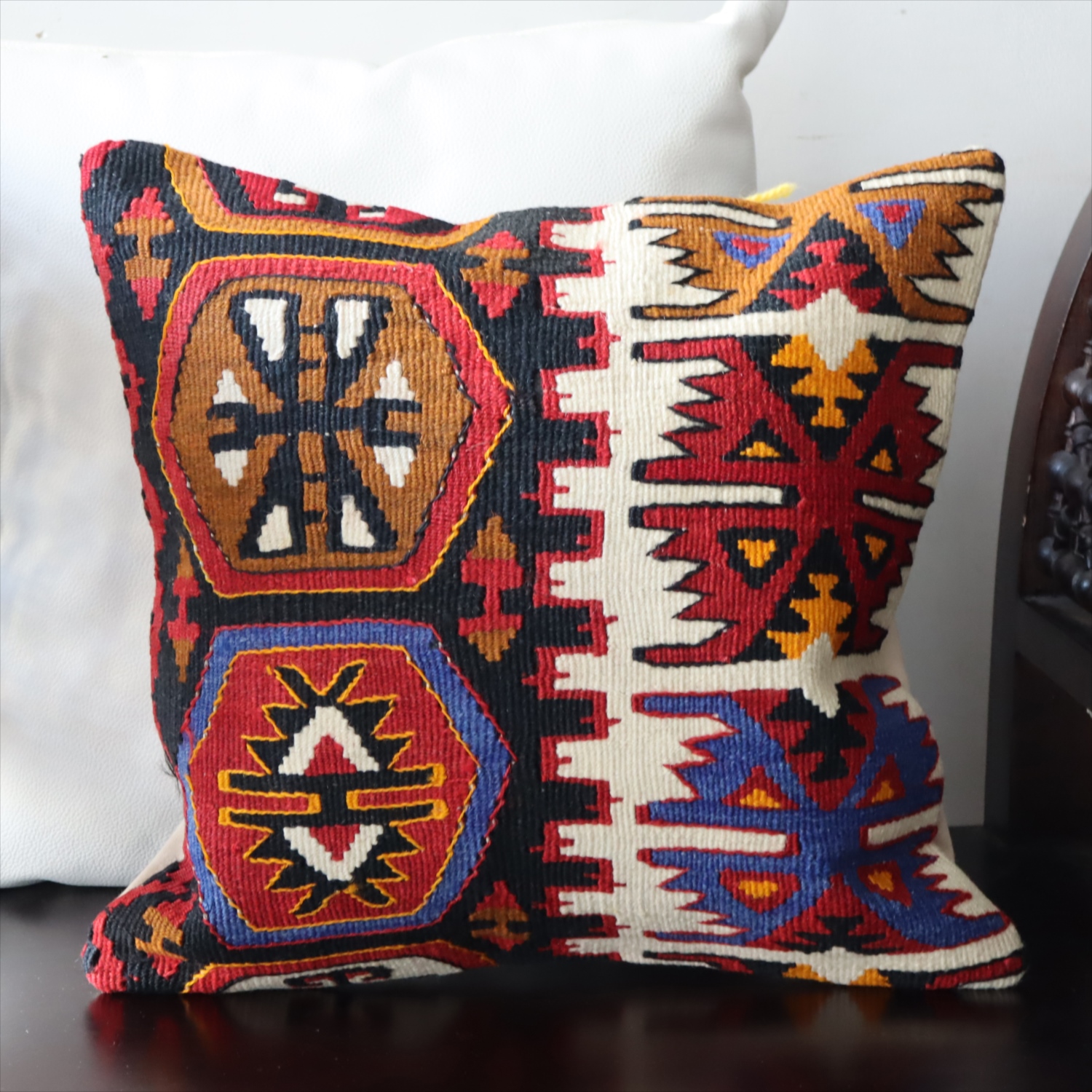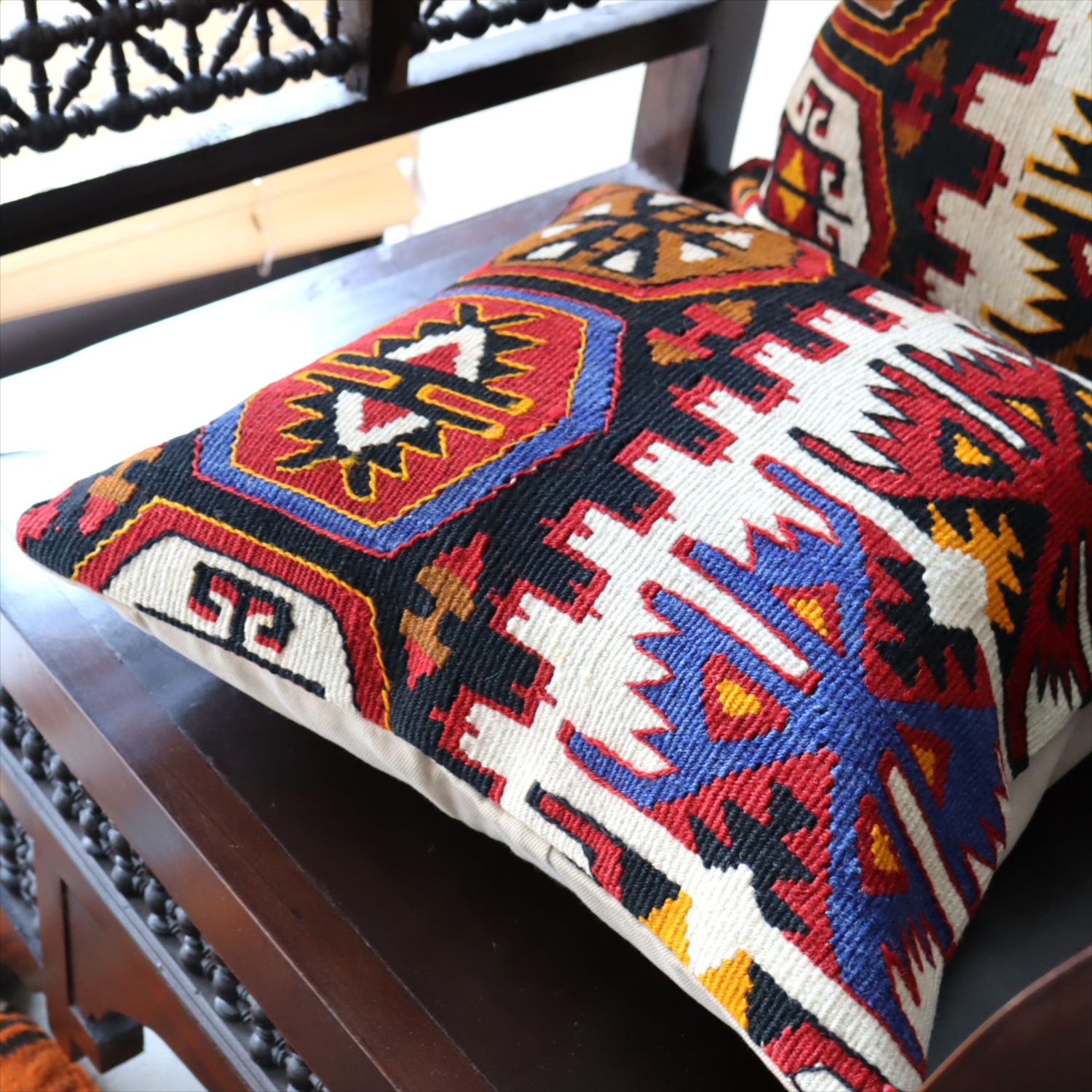 Key:Old Kilim, Kilim Cushion, Turkish Kilim, BOHO, Bohemian Decor, Vintage kilim, クッションカバー, オールドキリム, トルコ, ヴィンテージキリム, トライバルラグ, ピロー, ボヘミアンスタイル, BO-HO, ウール100%, 手織り, 一点もの, ガラタバザール
