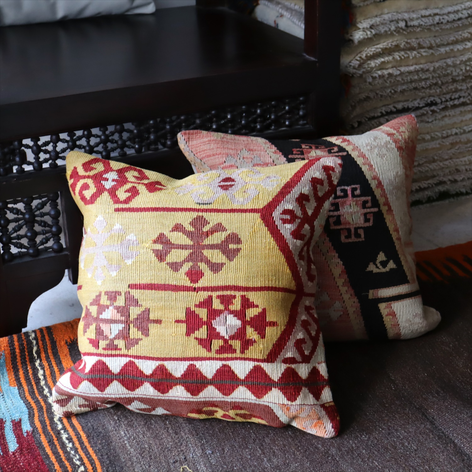 クッションカバーにすると、一枚のキリムから50枚以上に切り分けられるものもあり、配色が似ていてモチーフのバランスが違うクッションができあがります。