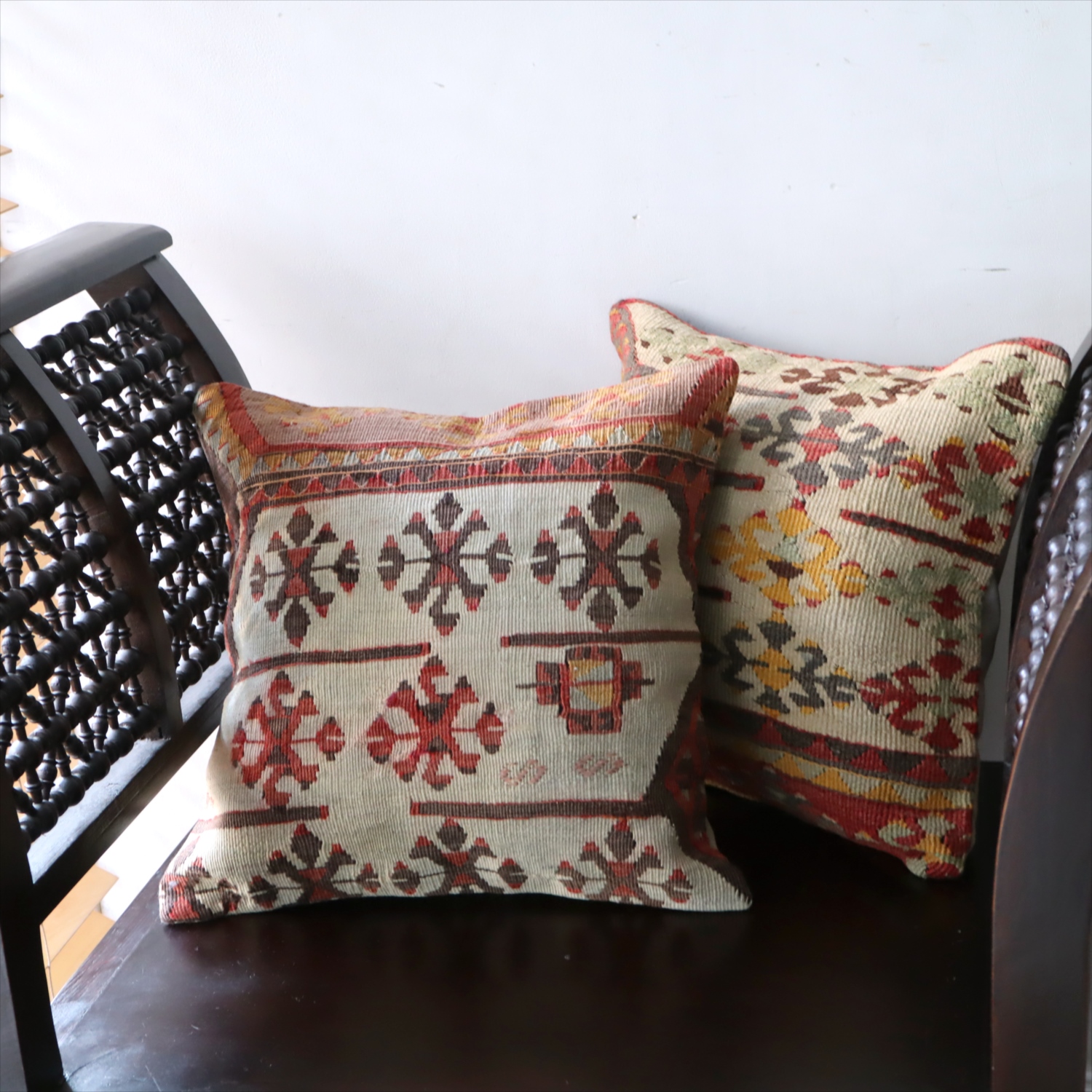クッションカバーにすると、一枚のキリムから50枚以上に切り分けられるものもあり、配色が似ていてモチーフのバランスが違うクッションができあがります。
