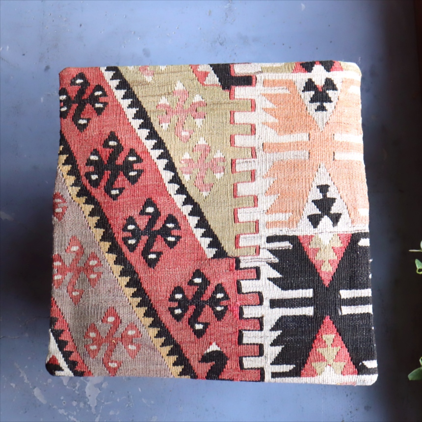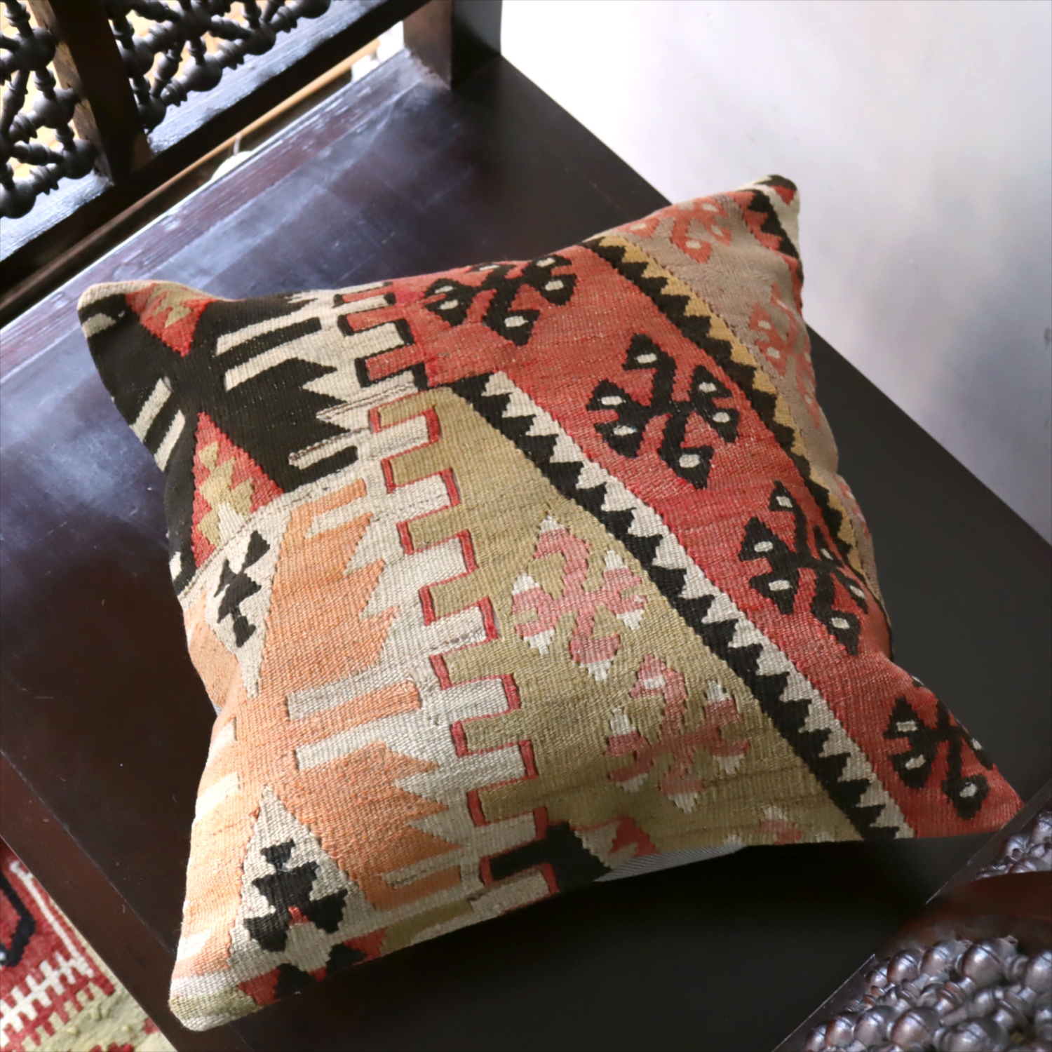 Key:Old Kilim, Kilim Cushion, Turkish Kilim, BOHO, Bohemian Decor, Vintage kilim, クッションカバー, オールドキリム, トルコ, ヴィンテージキリム, トライバルラグ, ピロー, ボヘミアンスタイル, BO-HO, ウール100%, 手織り, 一点もの, ガラタバザール