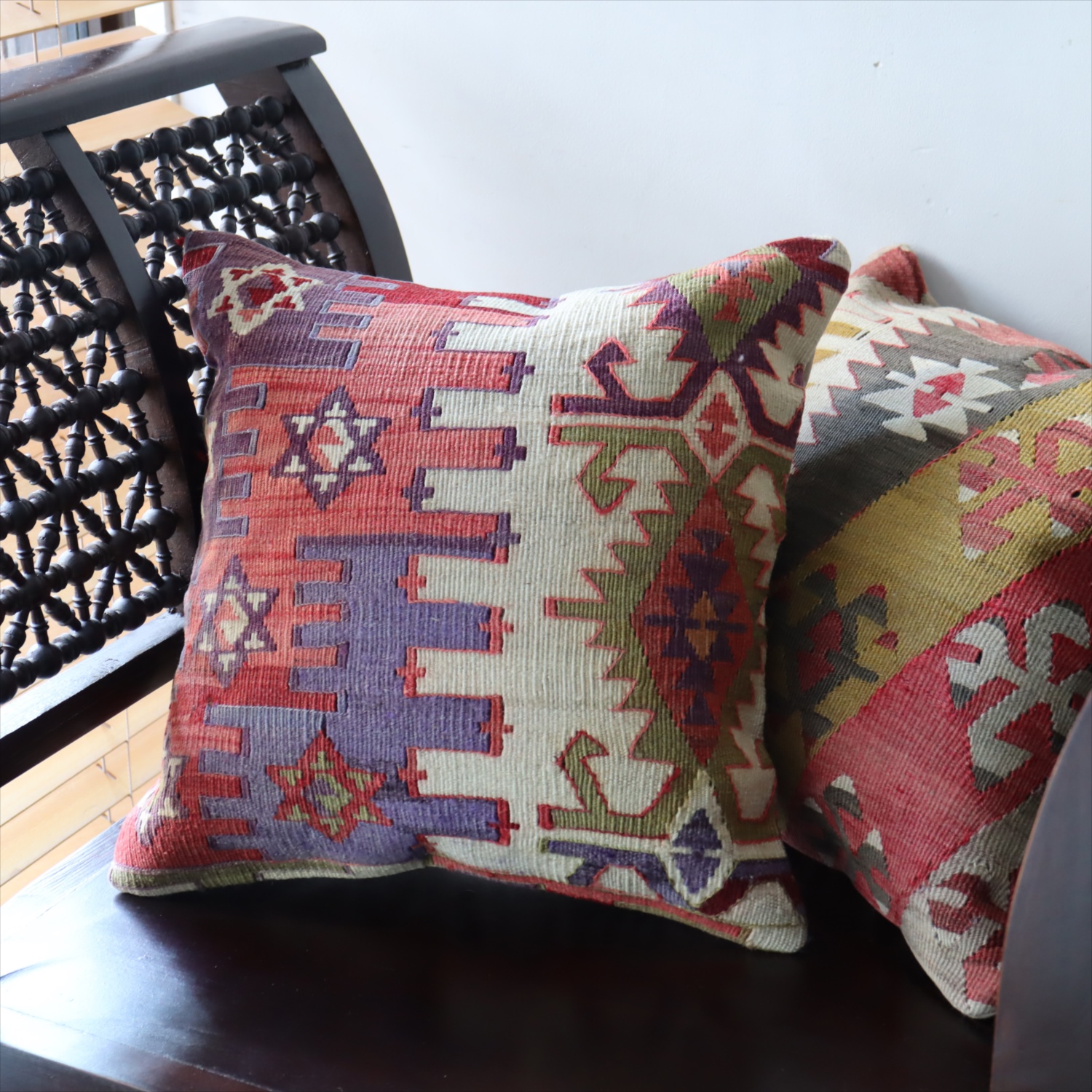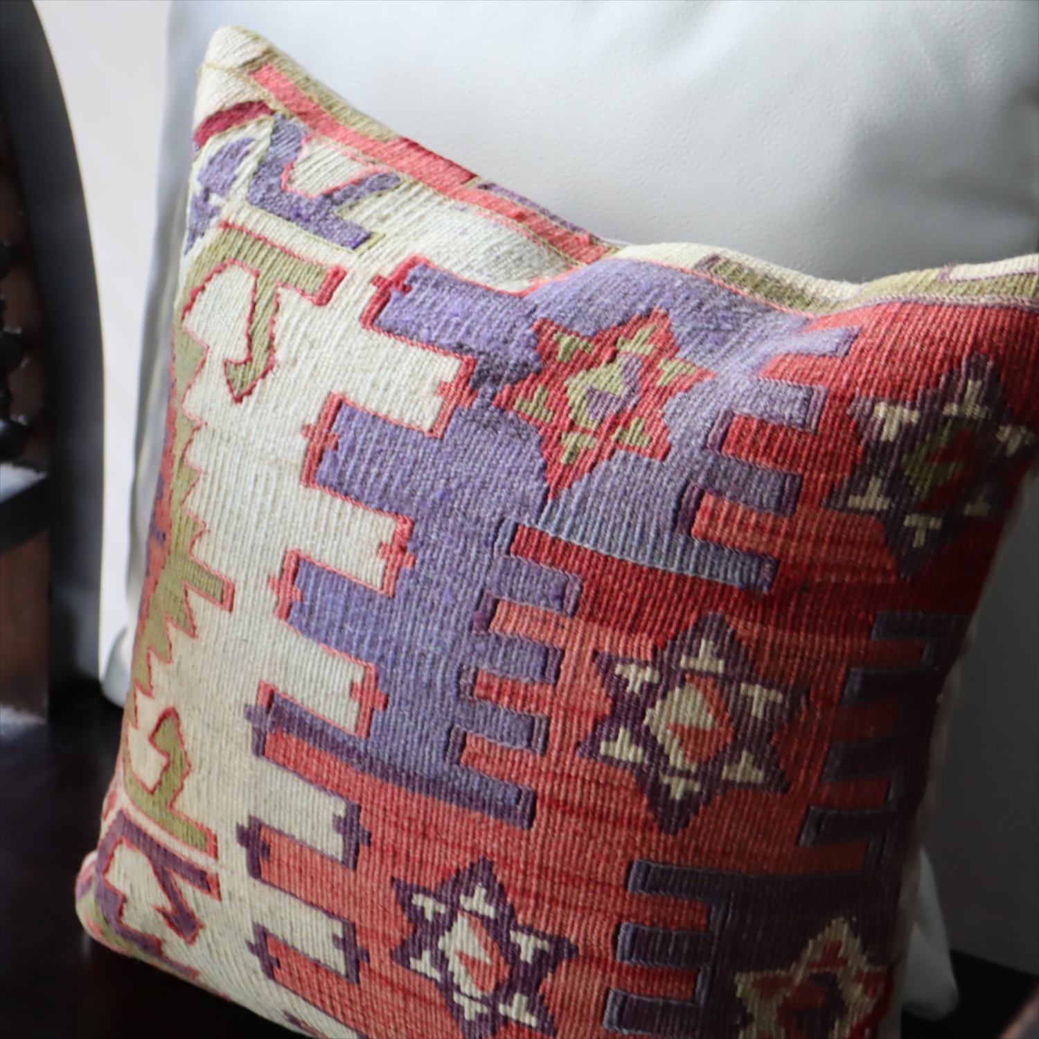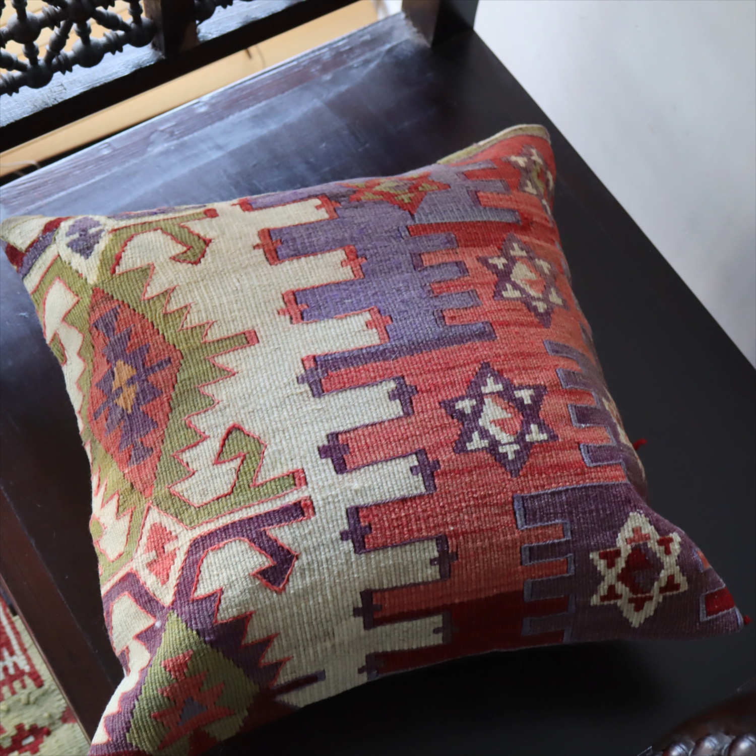 Key:Old Kilim, Kilim Cushion, Turkish Kilim, BOHO, Bohemian Decor, Vintage kilim, クッションカバー, オールドキリム, トルコ, ヴィンテージキリム, トライバルラグ, ピロー, ボヘミアンスタイル, BO-HO, ウール100%, 手織り, 一点もの, ガラタバザール