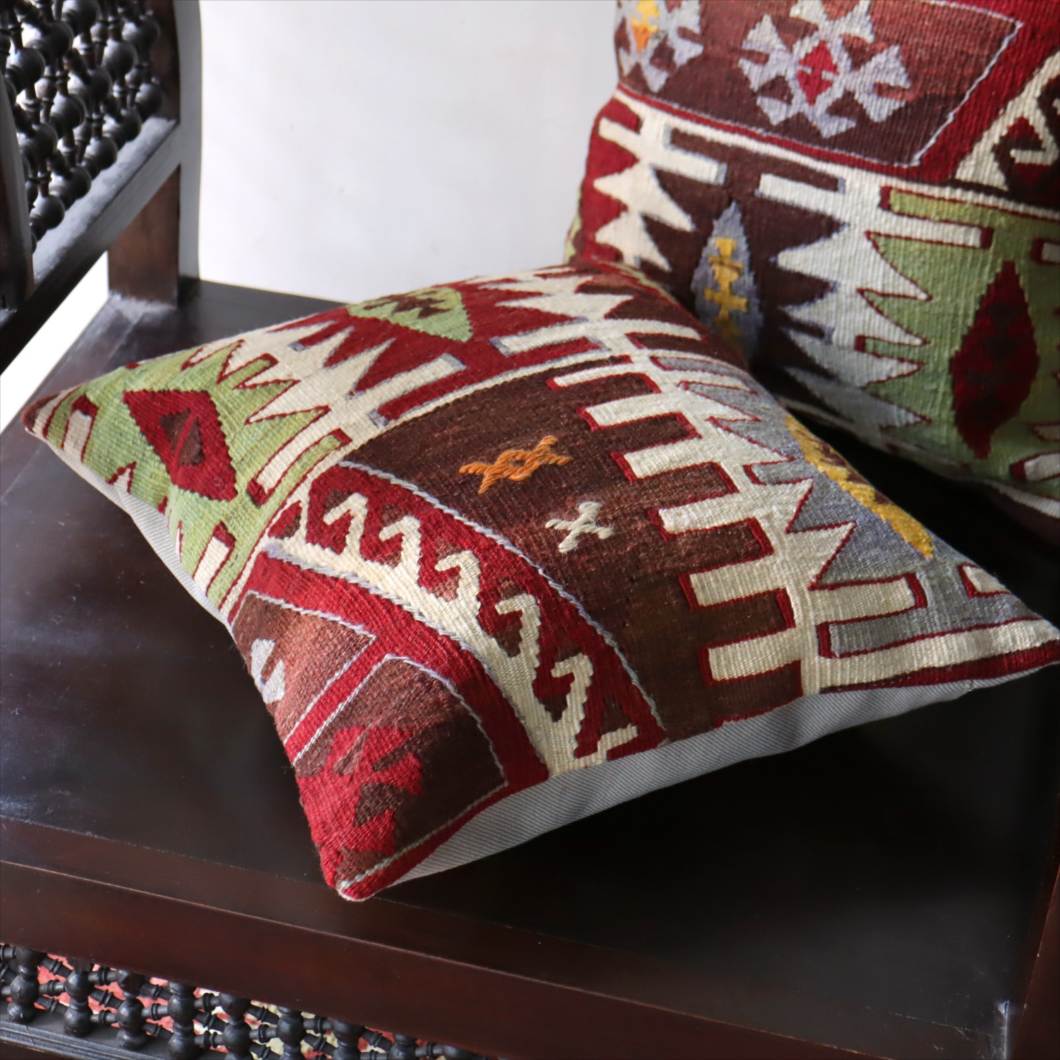 クッションカバーにすると、一枚のキリムから50枚以上に切り分けられるものもあり、配色が似ていてモチーフのバランスが違うクッションができあがります。