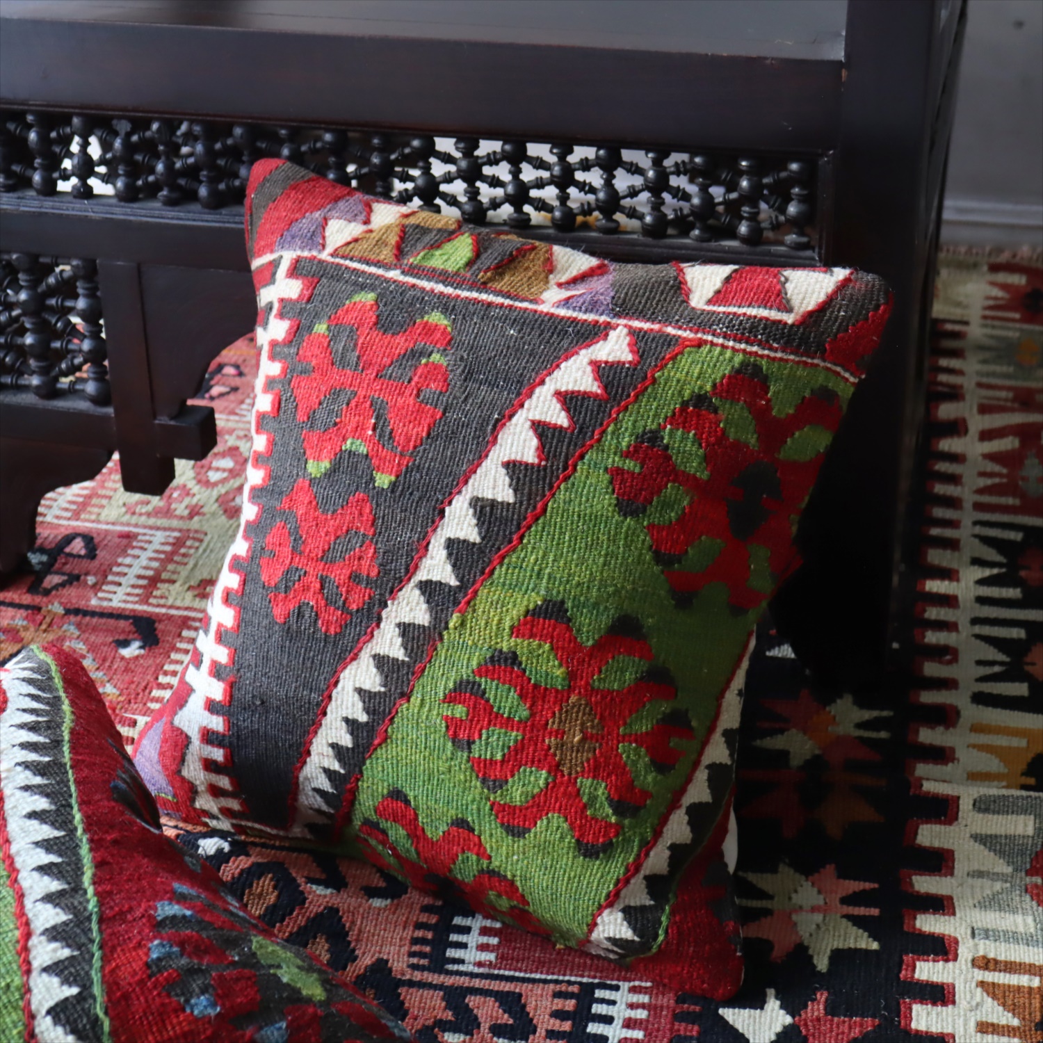 Key:Old Kilim, Kilim Cushion, Turkish Kilim, BOHO, Bohemian Decor, Vintage kilim, クッションカバー, オールドキリム, トルコ, ヴィンテージキリム, トライバルラグ, ピロー, ボヘミアンスタイル, BO-HO, ウール100%, 手織り, 一点もの, ガラタバザール