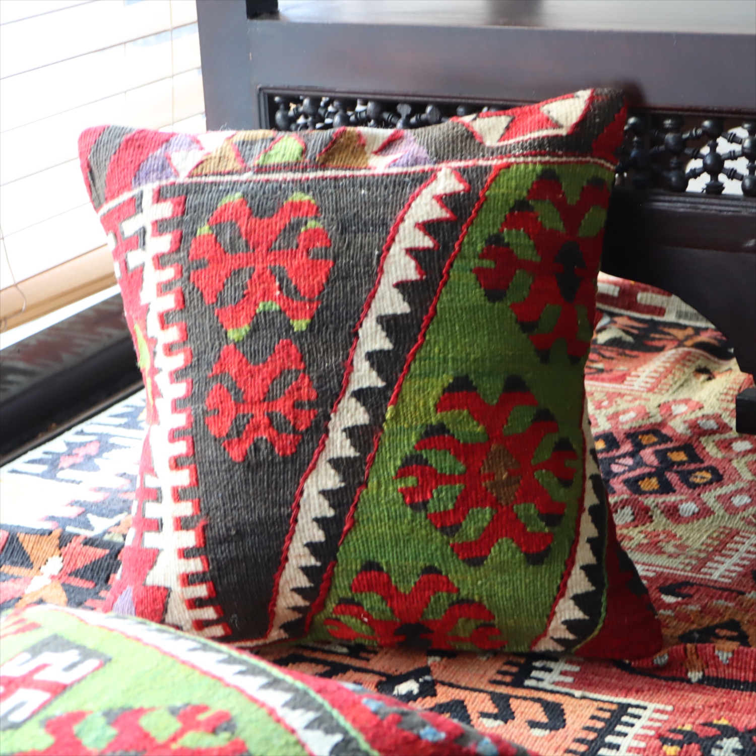 クッションカバーにすると、一枚のキリムから50枚以上に切り分けられるものもあり、配色が似ていてモチーフのバランスが違うクッションができあがります。