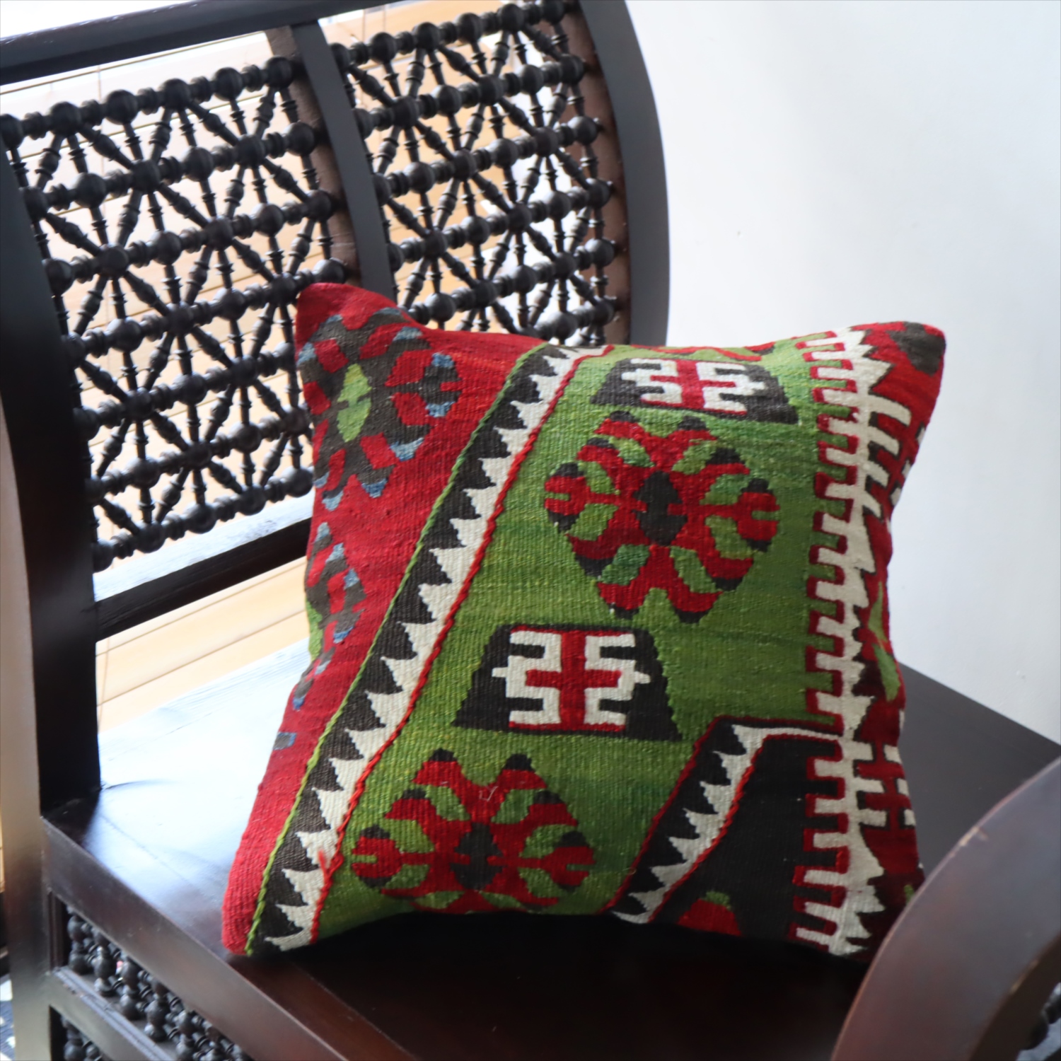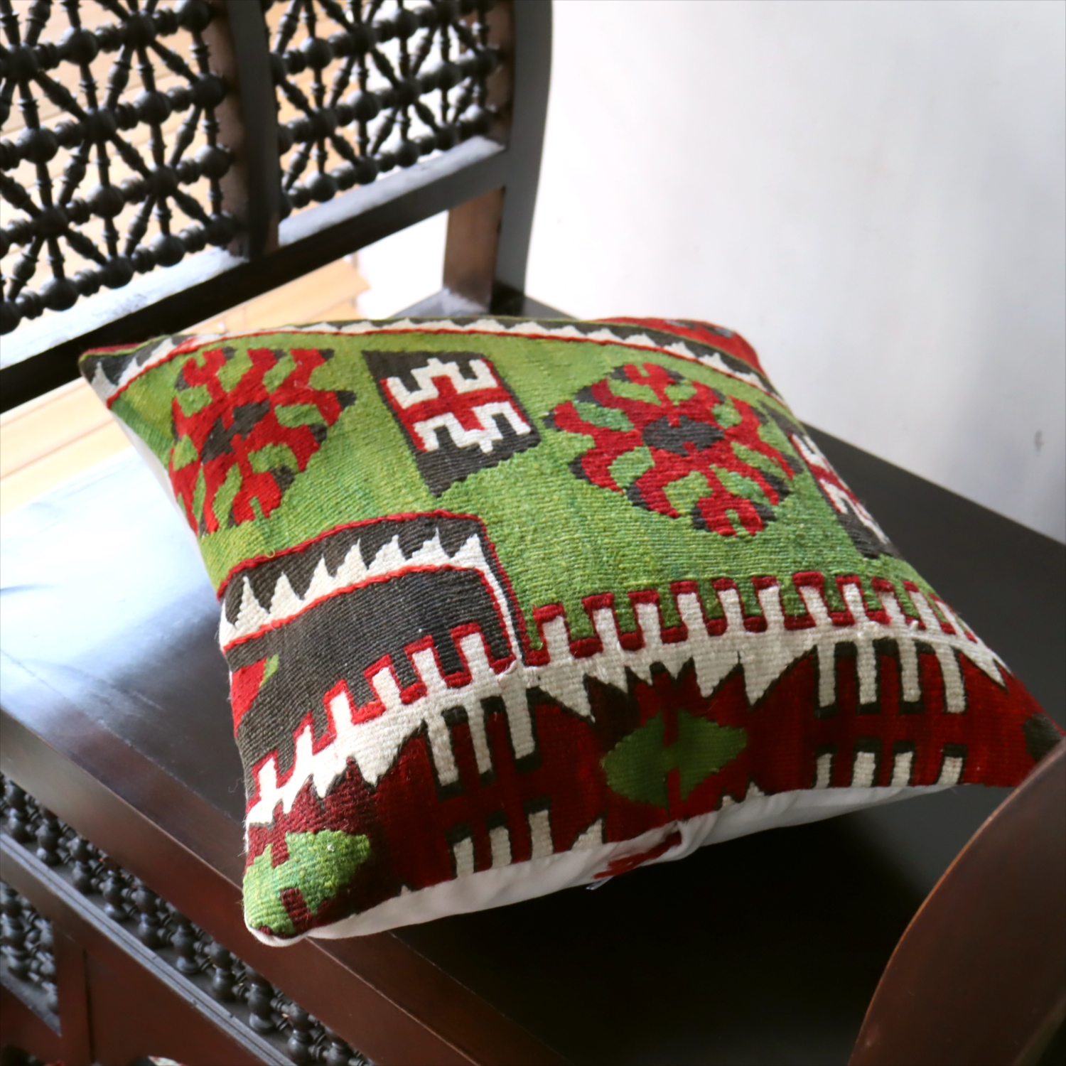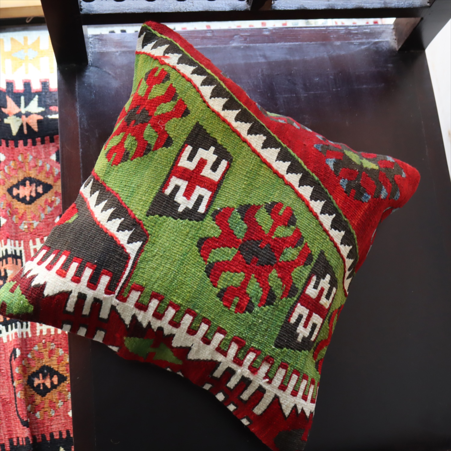 20世紀中頃に、アナトリア(トルコ)東部、マラテヤ地方またはシワス地方で織られたもので、年代は古いものの、大切に保管されており、織られた当時のままの鮮やかな色が残っています。グリーンの色はお部屋でクッションとしてお使いいただく間に、少しずつ褪色してやわらかな色に変化すると想像できます。