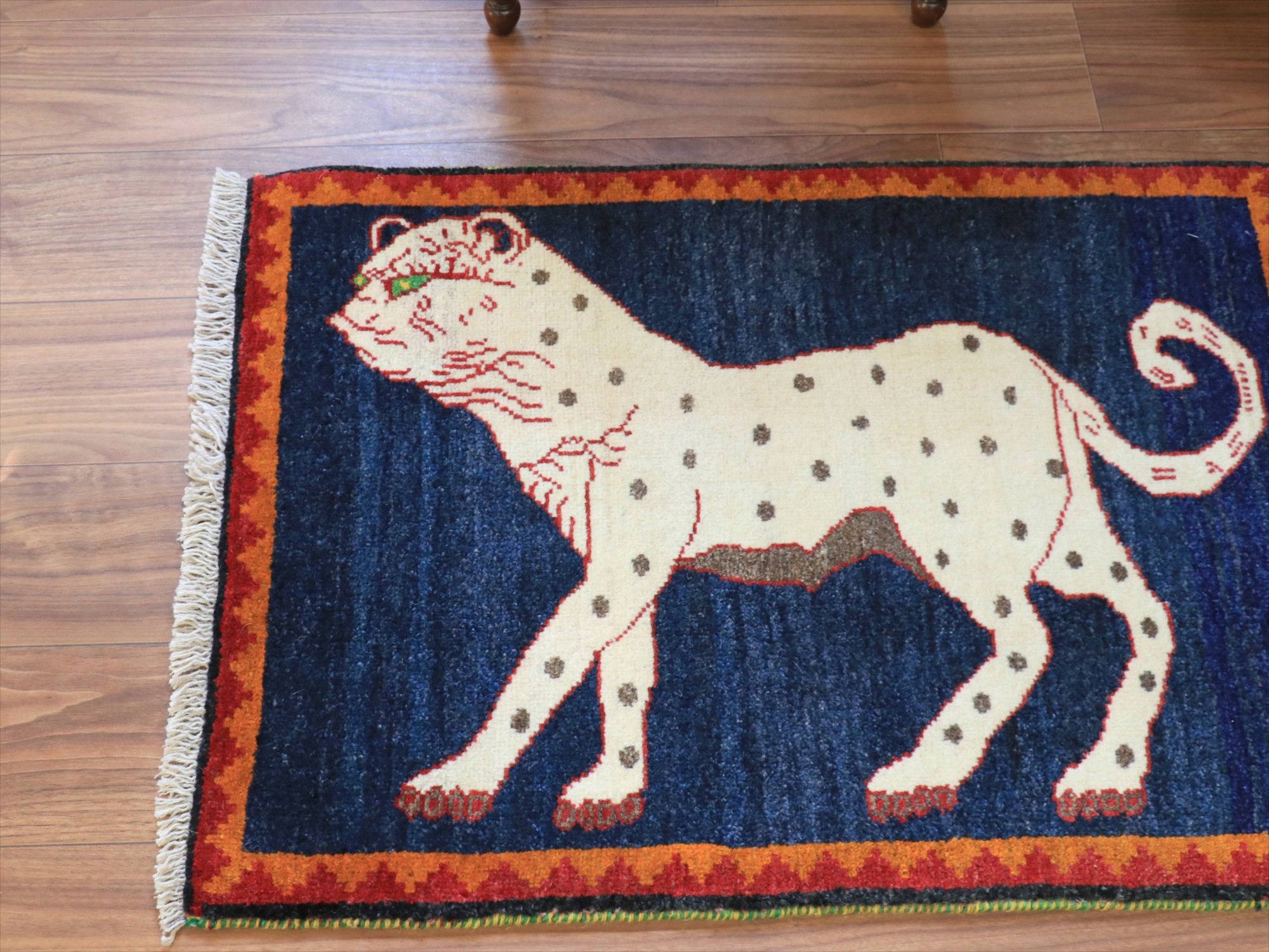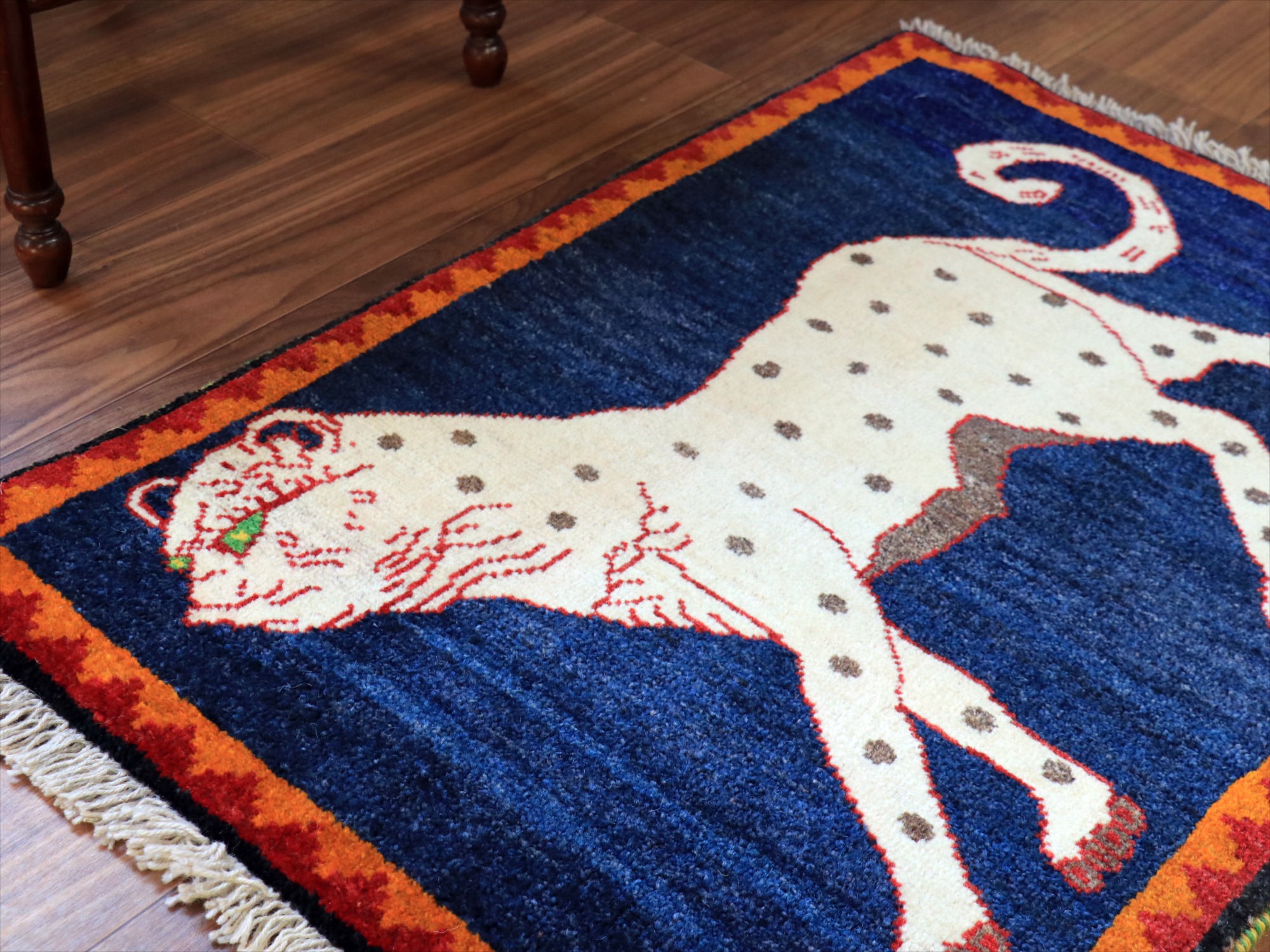 カシュカイ族の象徴でもあるライオンとともに、よく登場するヒョウのデザイン(メスのライオンとも言われています)。発色のよいレッドのフィールドに、ユニークな色使いではありますが、ブルーで織られたヒョウがよく映えます。いろいろなパターンのあるライオンラグの中でも、1頭がシンプルに織り込まれた人気のデザインです。