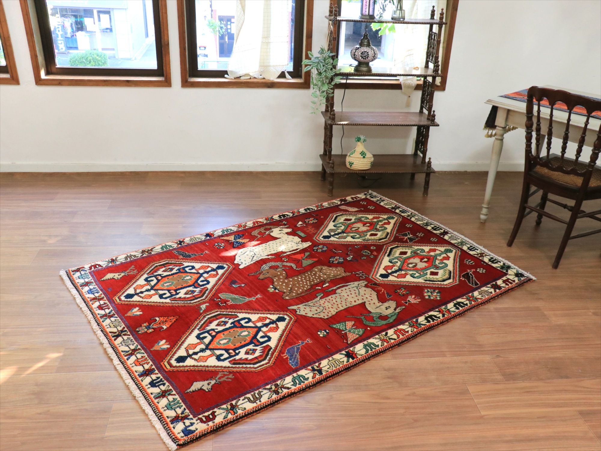 立派な角を持つ牡鹿が優雅に座ってくつろいでいる様子が織り込まれています。鹿は家畜ではありませんが、森の中から親子仲良く現れる鹿は、家庭円満の象徴とも言われ、カシュカイ族のラグにはたびたび登場するモチーフです。上下には、スカラベのようなモチーフのひし形のメダリオンが4つ並んでいて、ラグとしてはとてもユニークな配置の一枚。