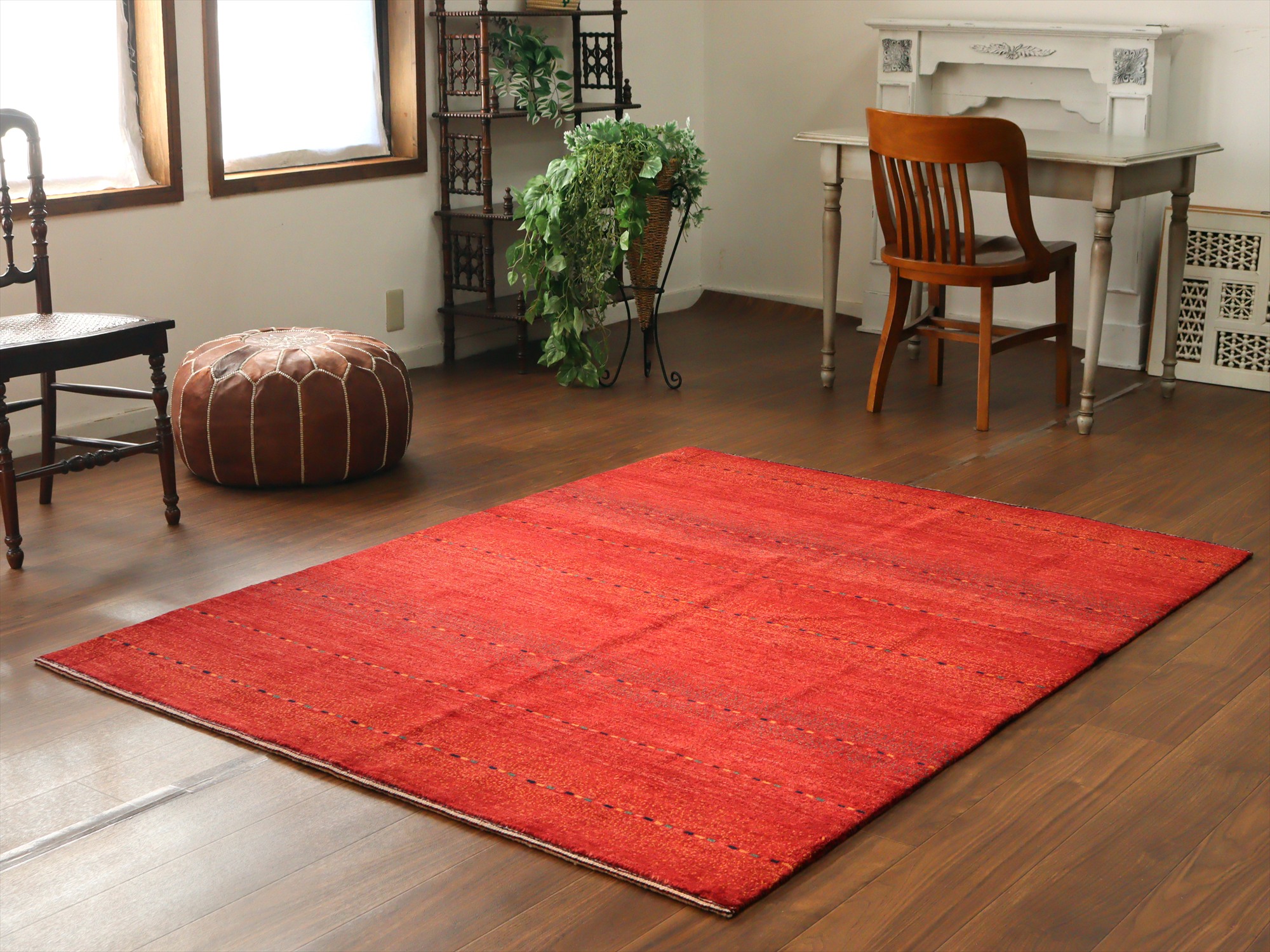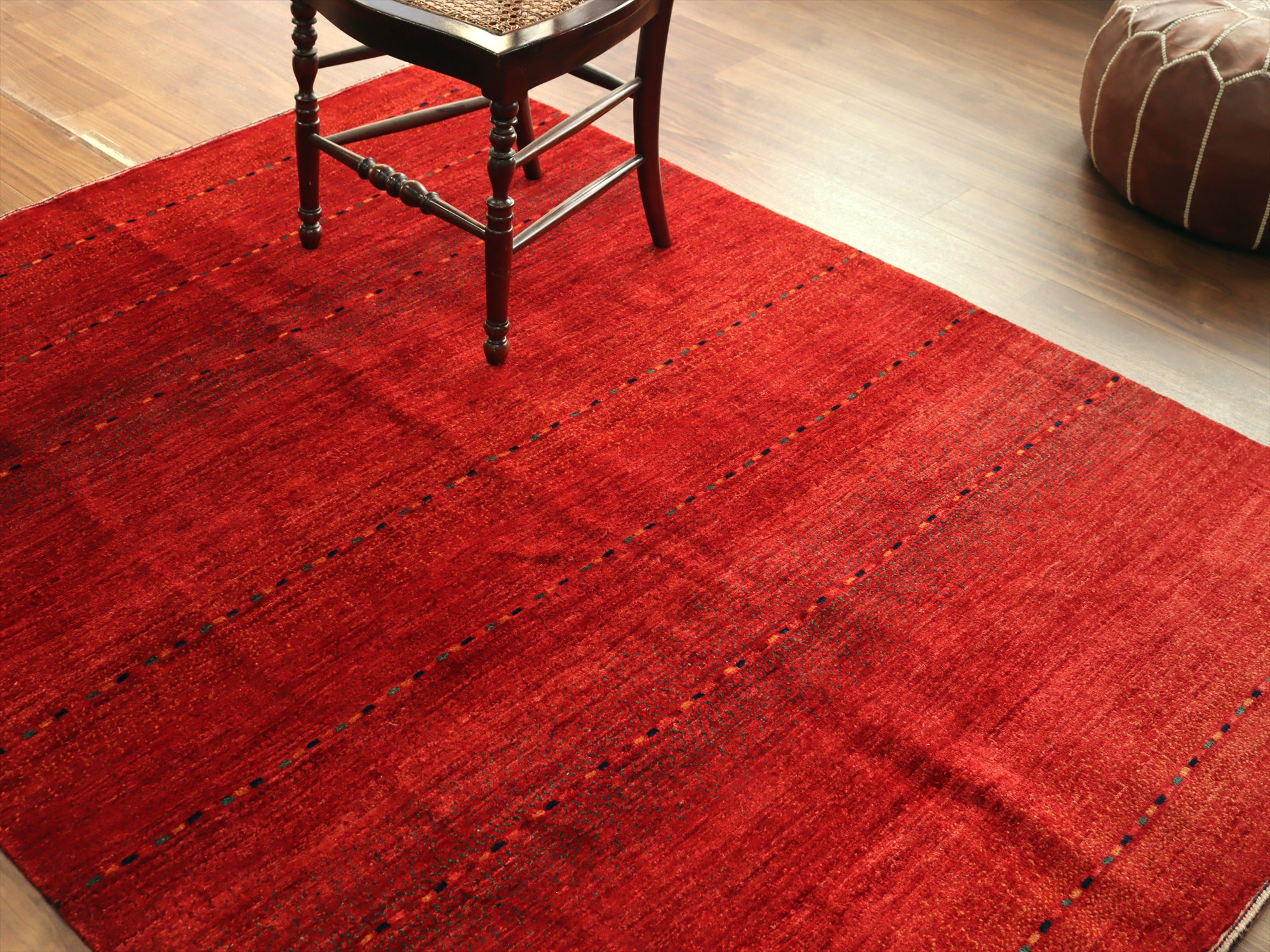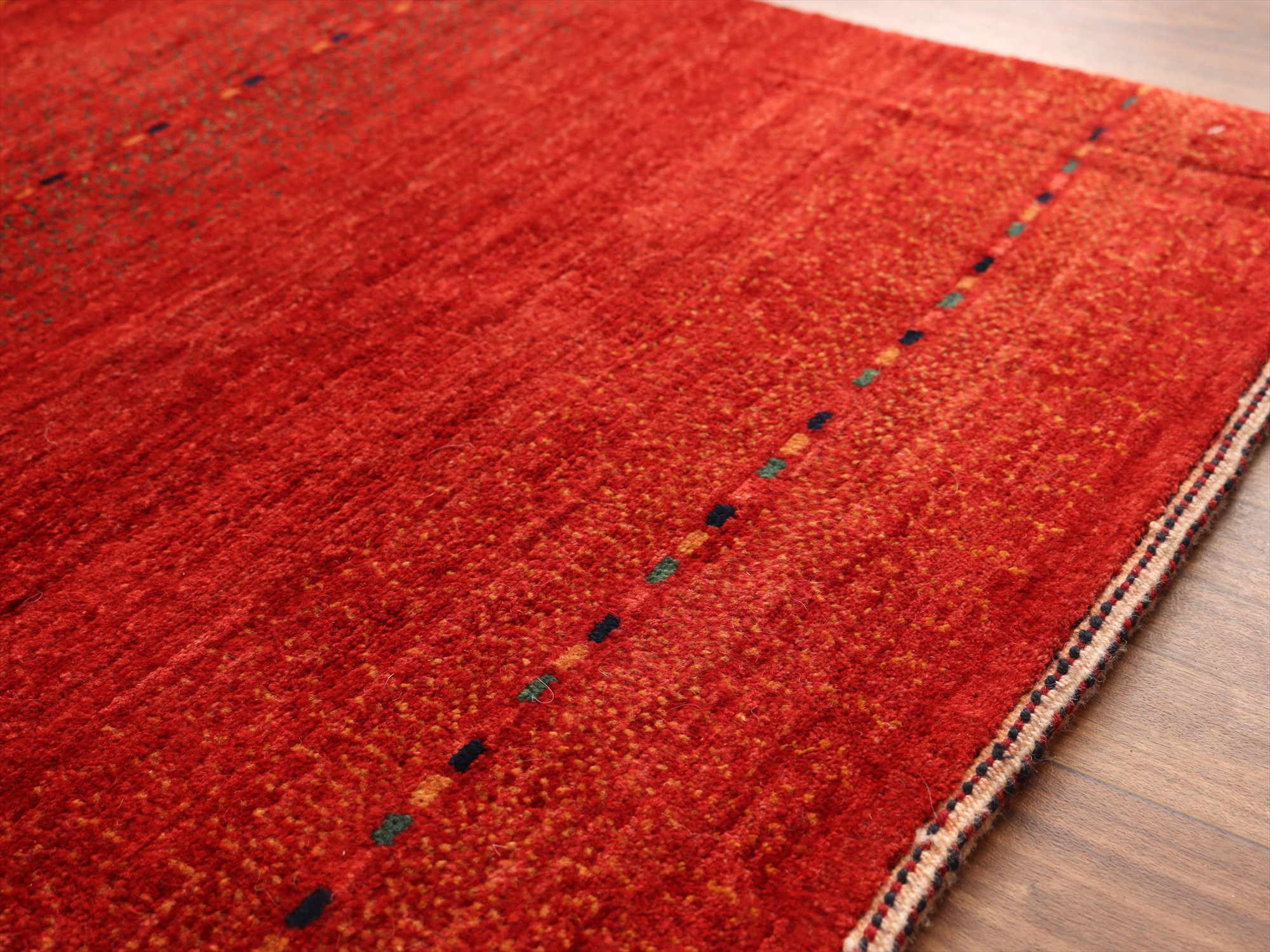 濃淡のあるレッドが繊細に表現された、シンプルなボーダーデザインのギャッベ。深みのある赤からやや明るい朱色へと移ろう、自然なグラデーションが一面に広がり、力強さと温もりを感じさせます。さりげなく織り込まれた小さな色糸により、ボーダーが成されシンプルながらもアクセントの効いた1枚に。