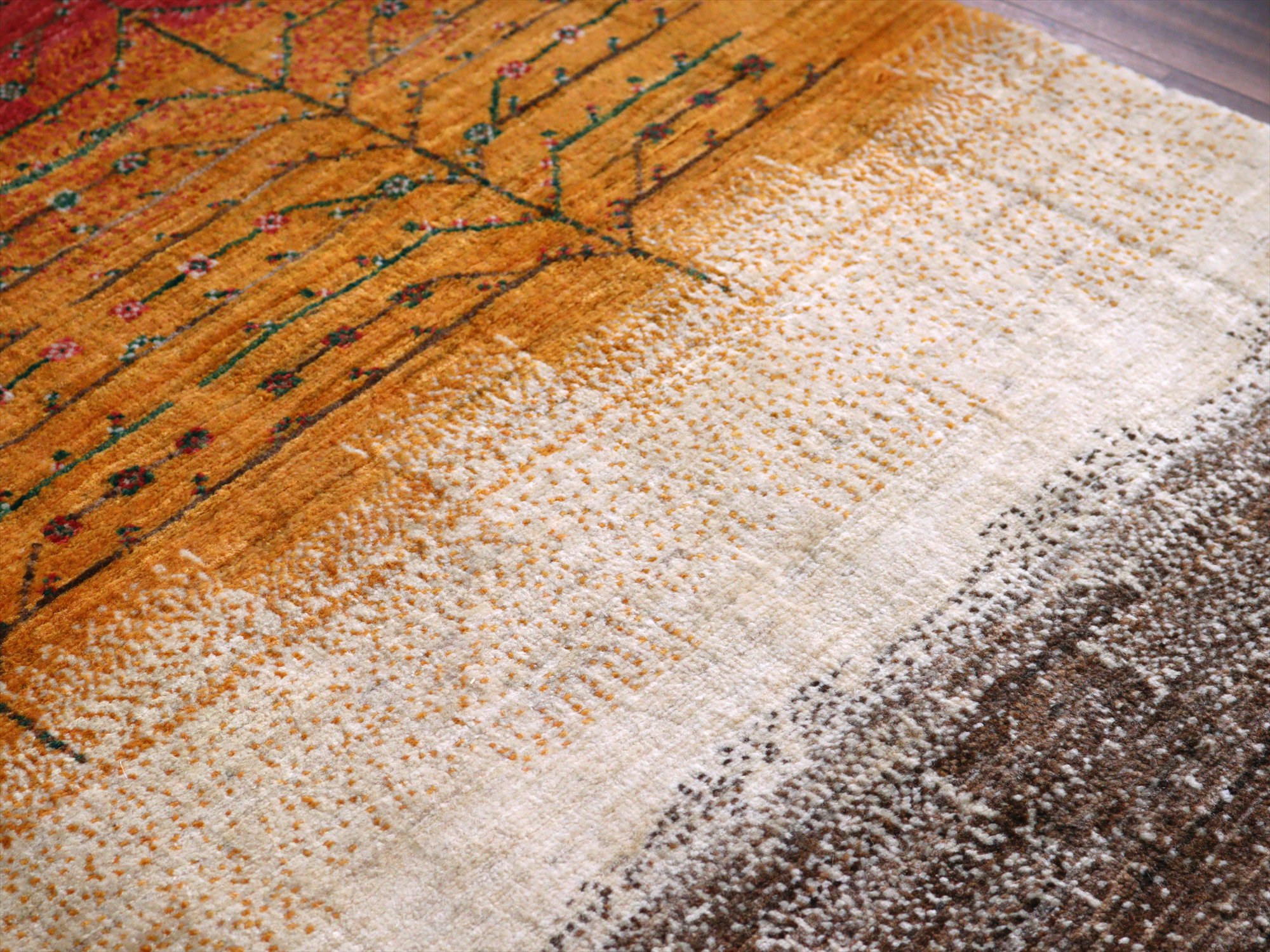 上下の縦糸を巻き込んでいます。ベースを含めたラグの厚みは、1.3cm程でパイルはすっきりとしていてモチーフがきれいに表現されています。