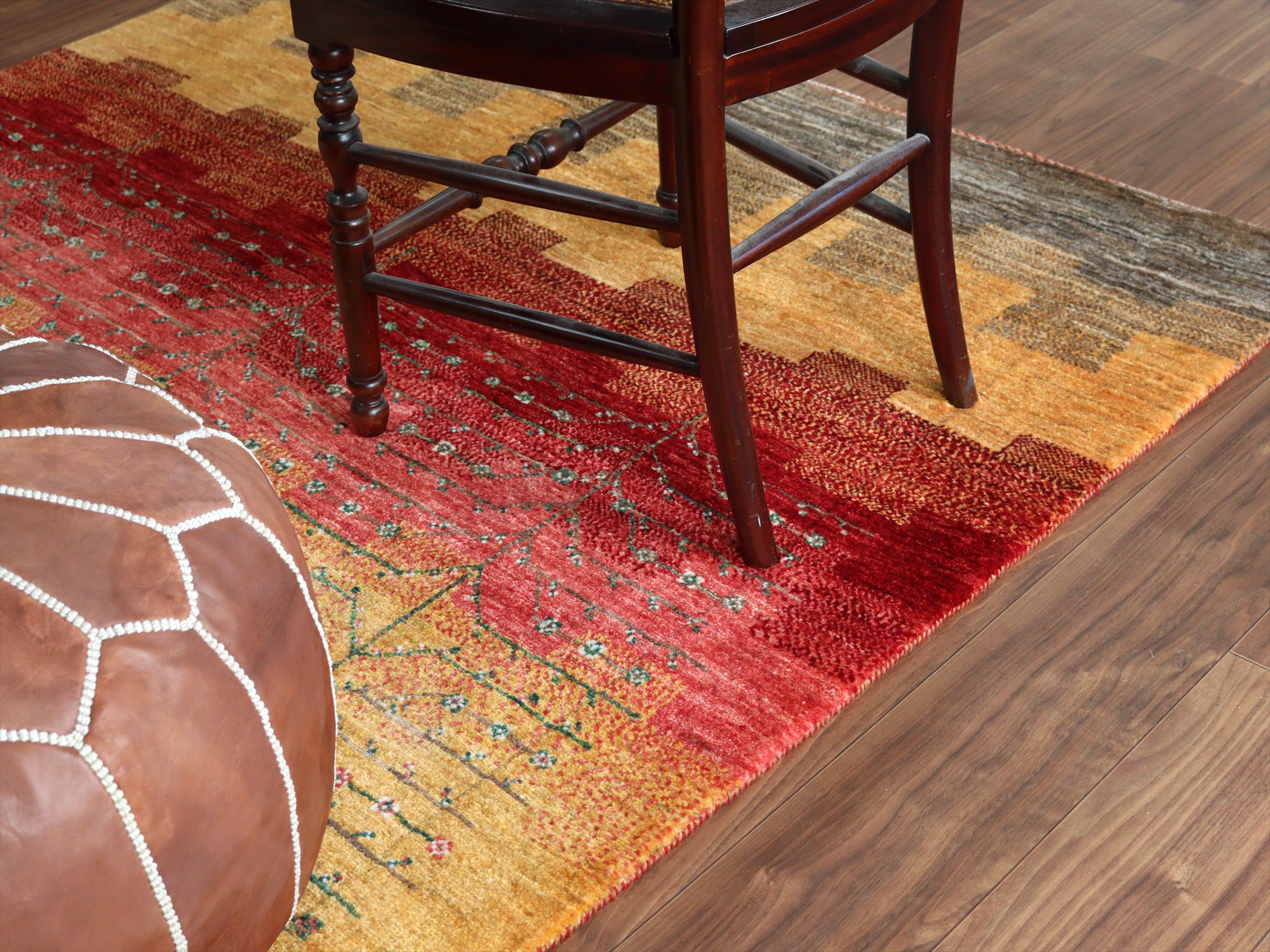 織り目の細かさを活かして、繊細で情緒的なデザインを表現。完成度が高く、バランスの整ったデザインの中に、左右非対称なモチーフやアブラッシュ(色ムラ)などの手織りラグならではの“ゆらぎ”が見え隠れするところが、とても魅力的です。