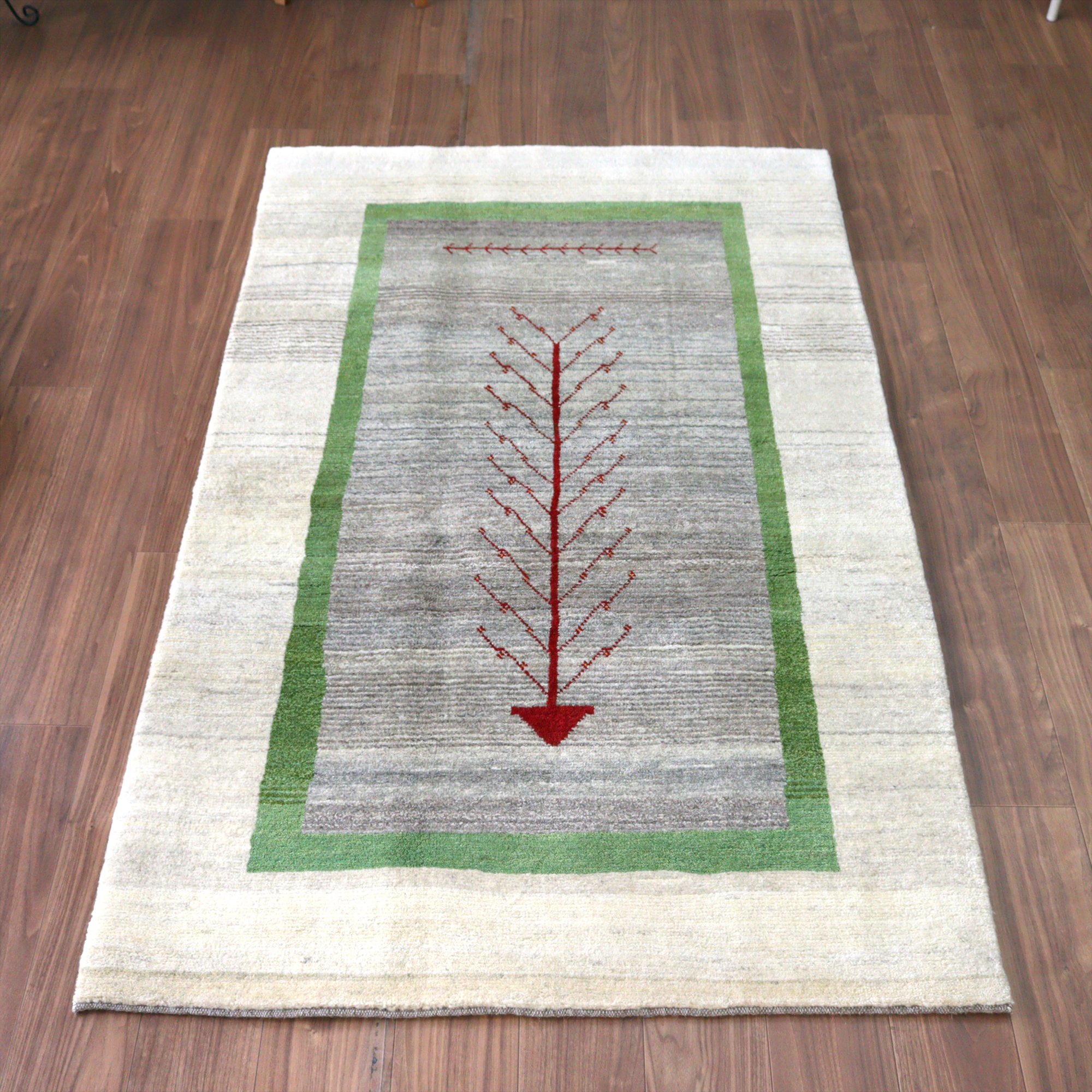 外側にアイボリー、手で描いたようなグリーンのフレームの内側には、グレーのグラデーションに赤い色糸で生命の樹が織り込まれています。手織りらしさを感じられる素朴な雰囲気のギャッベです。