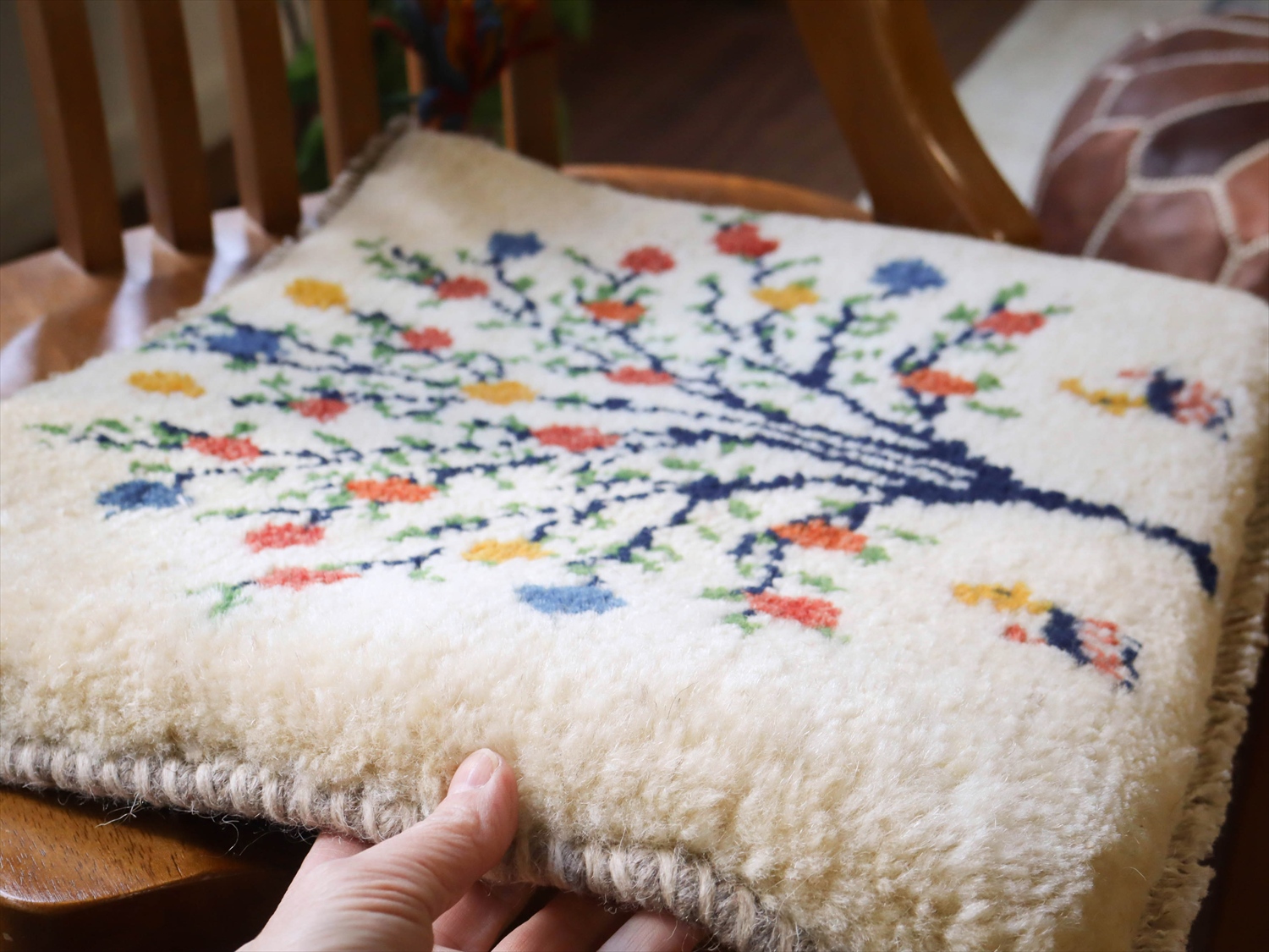 - ギャッベ イラン産手織り 座布団サイズ 38x42cm ナチュラルアイボリー 花をつけた生命の木