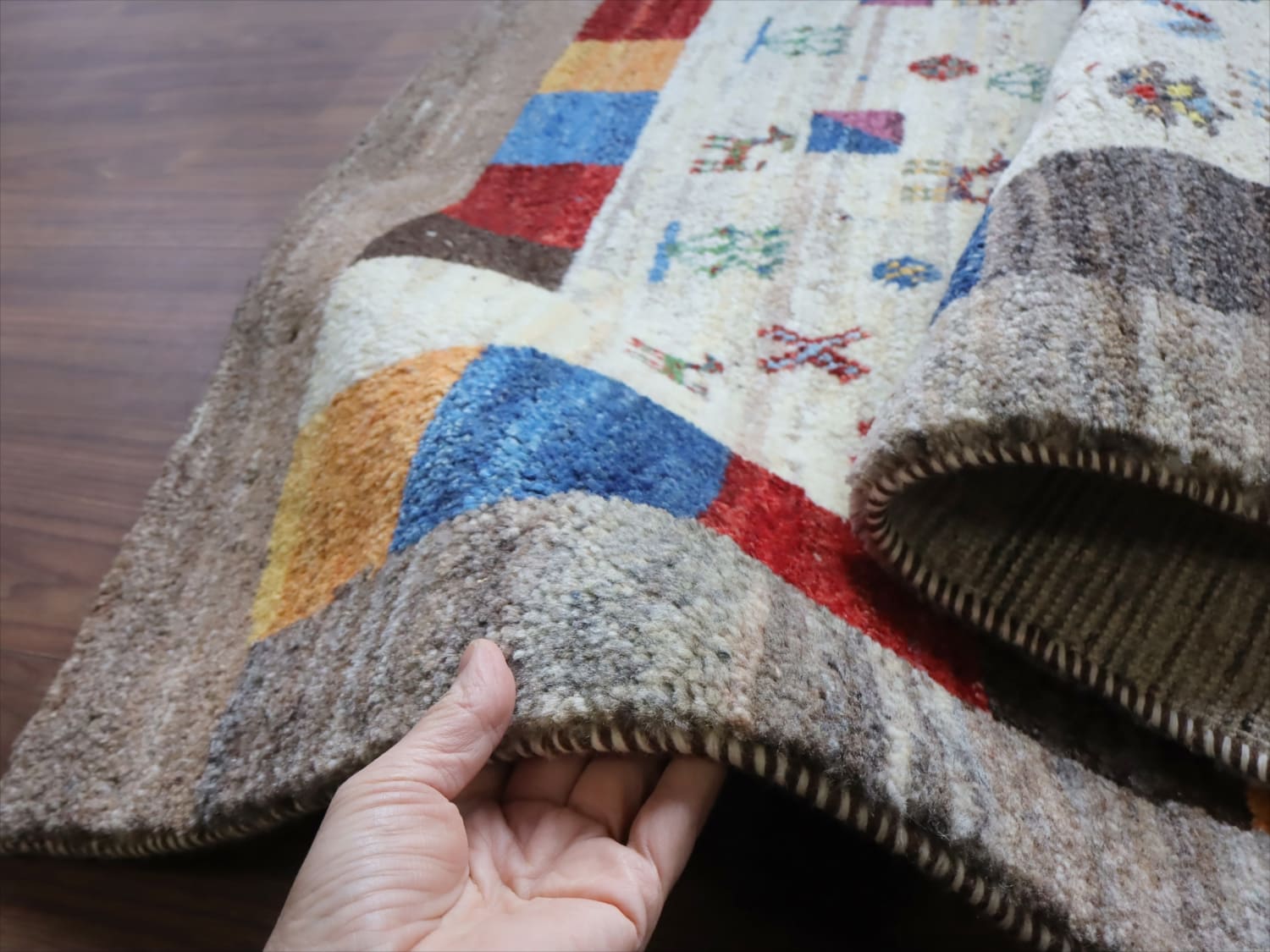 ・手紡ぎ、草木染(または無染色)、ウール100%、手織りのギャッベ。