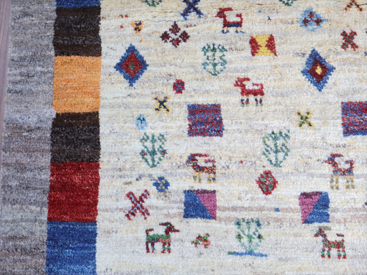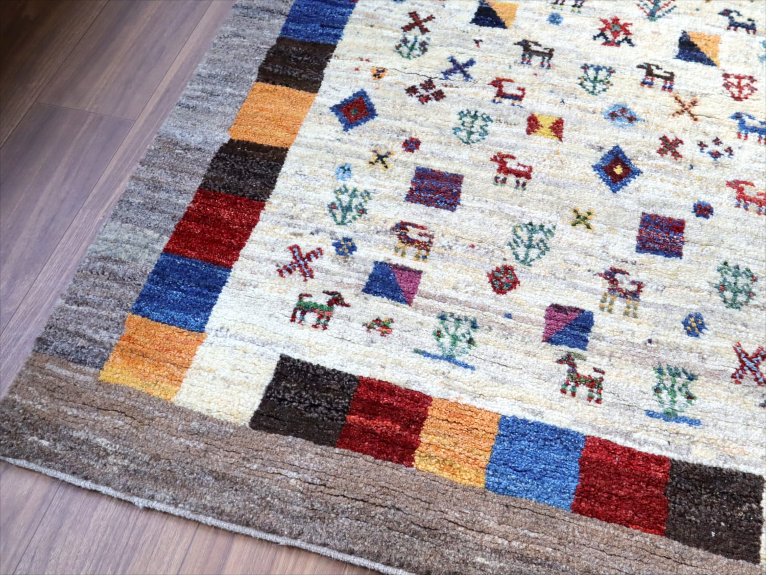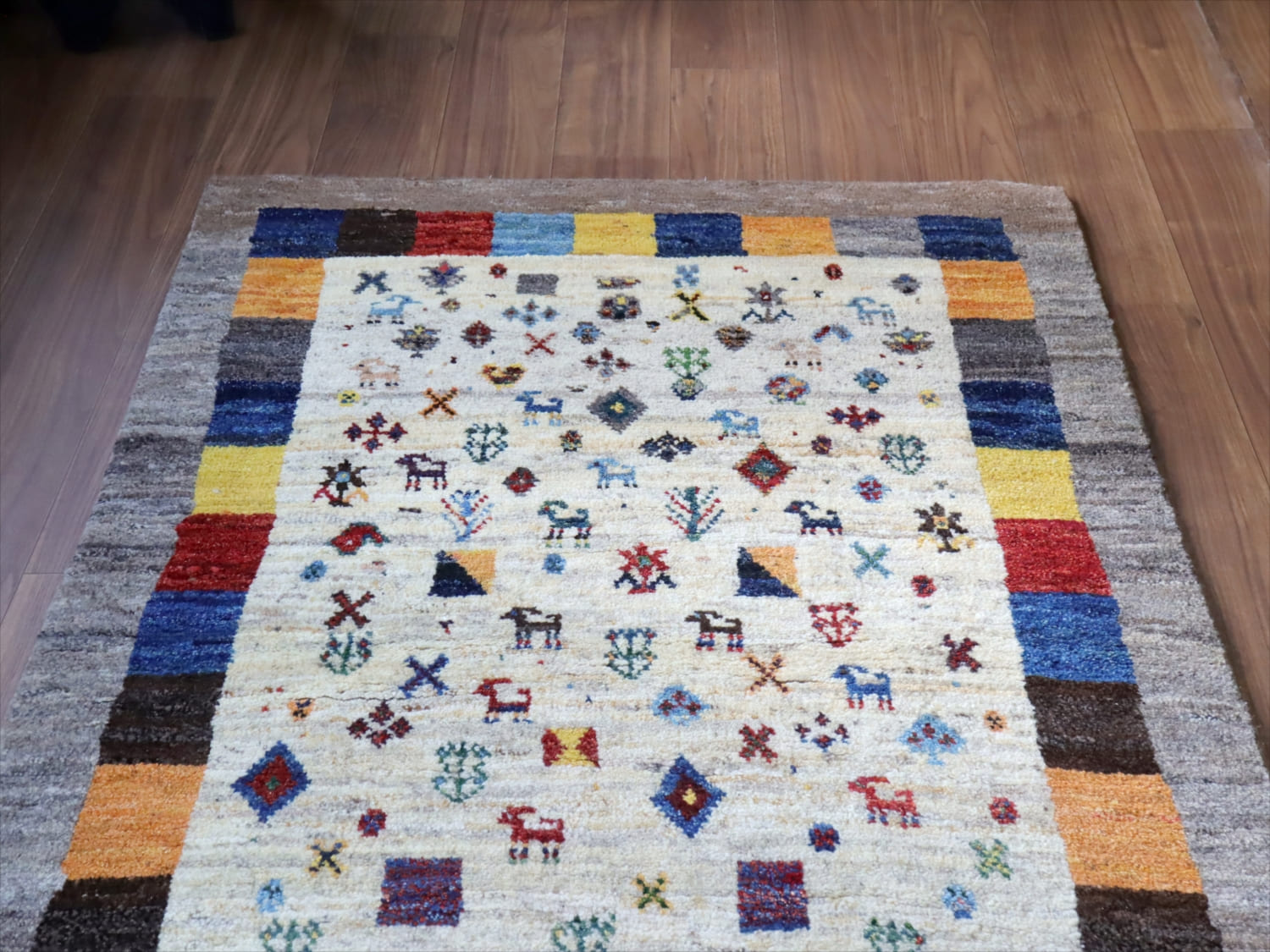 楽しいモチーフが全体に織り込まれた伝統的なデザインのギャッベ。中央部分のアイボリー色と、一番外側のグレーは、無染色の天然の羊毛の色を使って織られています。2020年代に入ってから、手織りギャッベでも整ったデザインが多く出てきている中、こちらのギャッベは遊牧民の本来の自由な感性で織った雰囲気が残っています。直線がゆらいでいたり、左右対象でなかったりするところも、このギャッベのチャームポイントです。