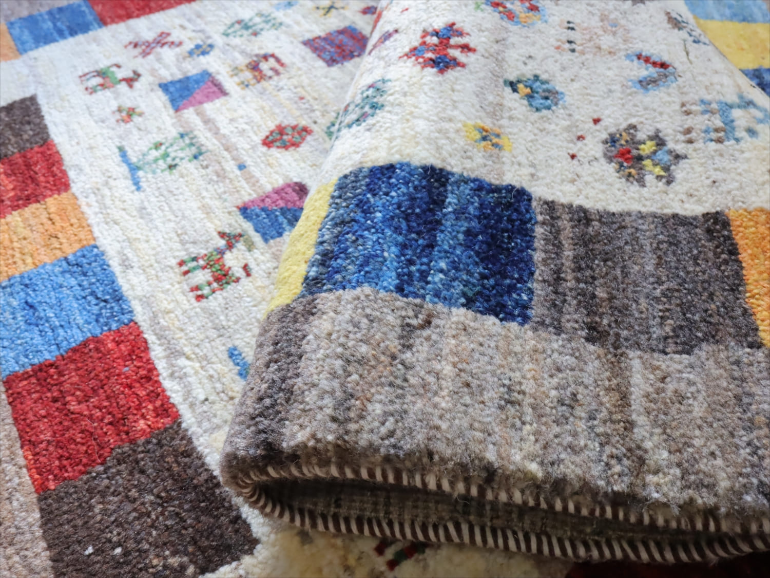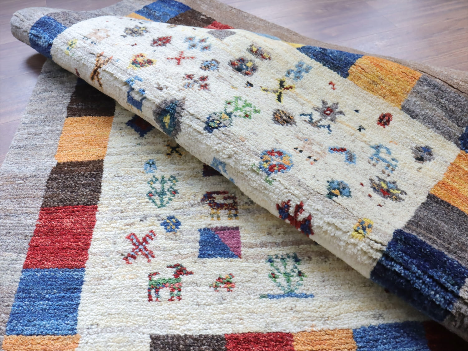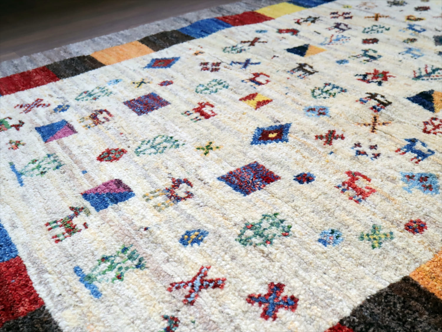 楽しいモチーフが全体に織り込まれた伝統的なデザインのギャッベ。中央部分のアイボリー色と、一番外側のグレーは、無染色の天然の羊毛の色を使って織られています。2020年代に入ってから、手織りギャッベでも整ったデザインが多く出てきている中、こちらのギャッベは遊牧民の本来の自由な感性で織った雰囲気が残っています。直線がゆらいでいたり、左右対象でなかったりするところも、このギャッベのチャームポイントです。