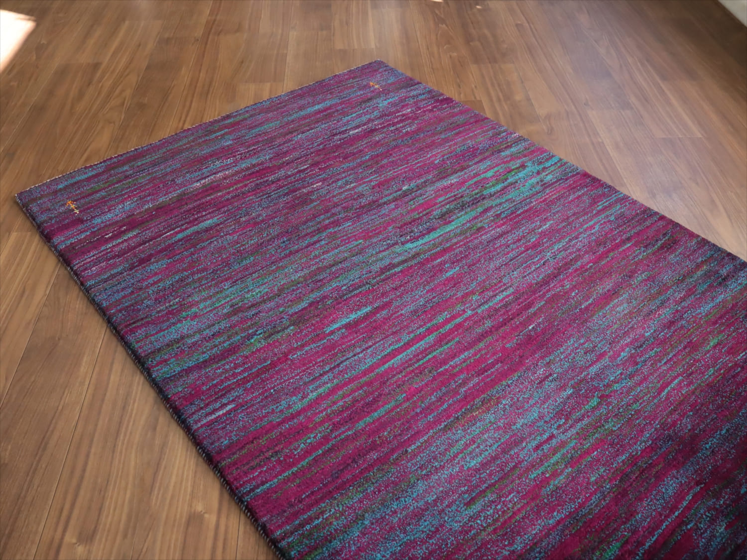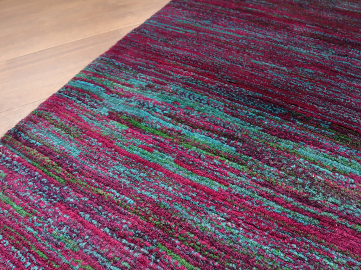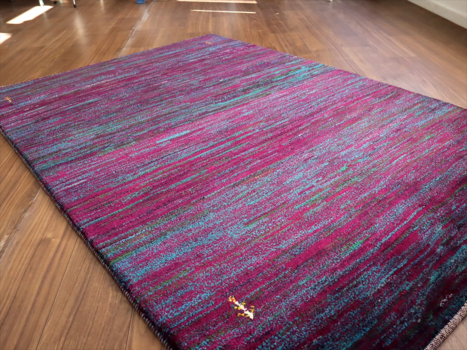 発色のよい紫と青をランダムにストライプ状に重ねた抽象画のようなデザイン。細かく見ると、グリーンやアイボリーなども散りばめられて、複雑で深みのある色使いです。かなり個性的で存在感があります。まさに世界で一枚のラグですね。