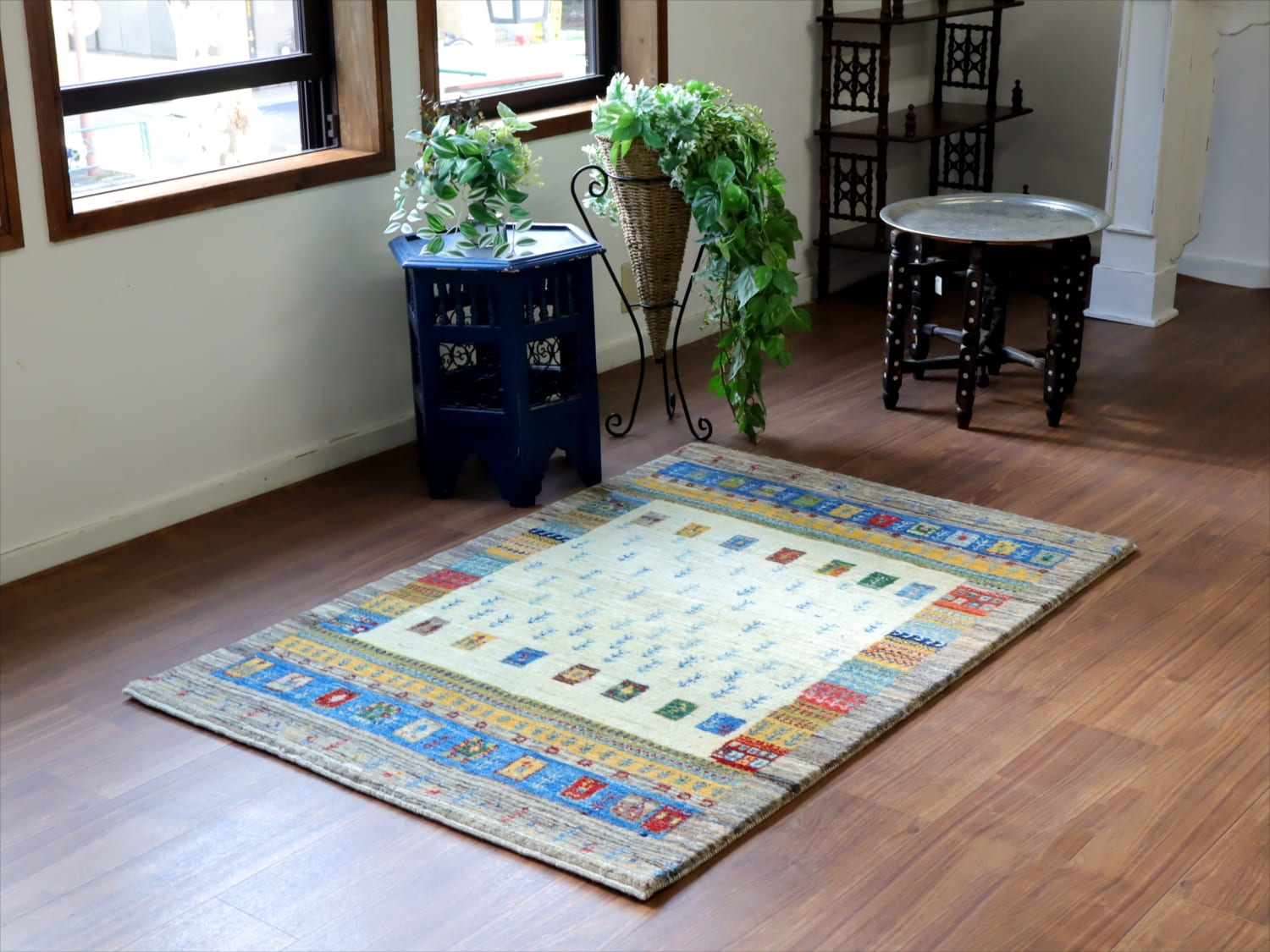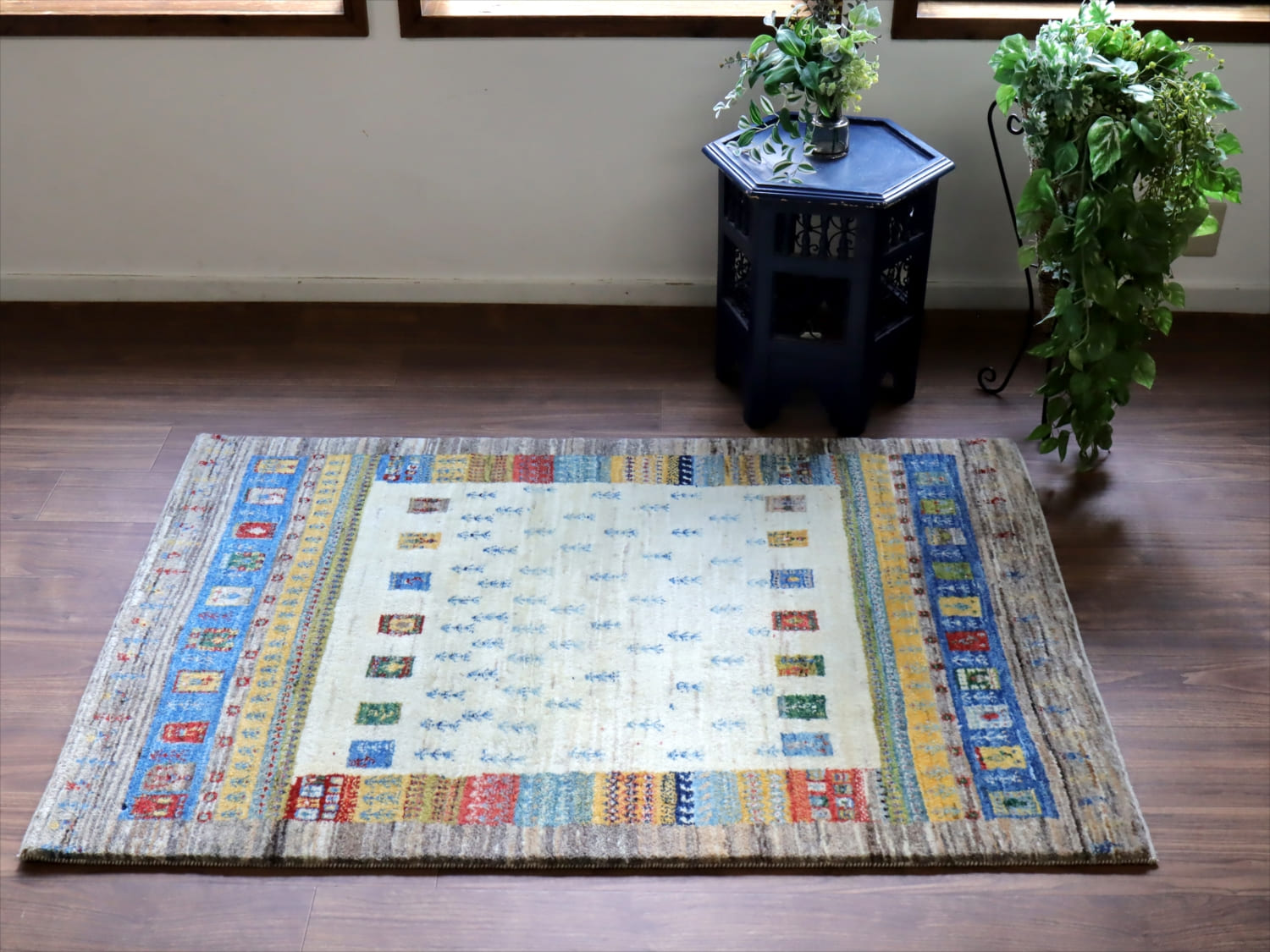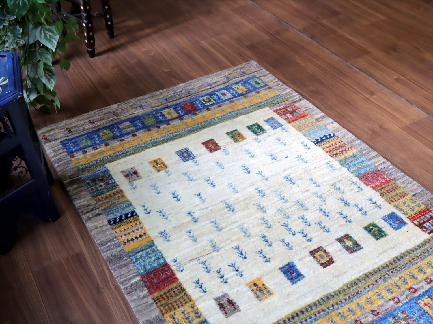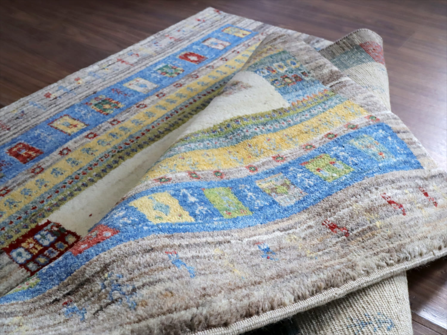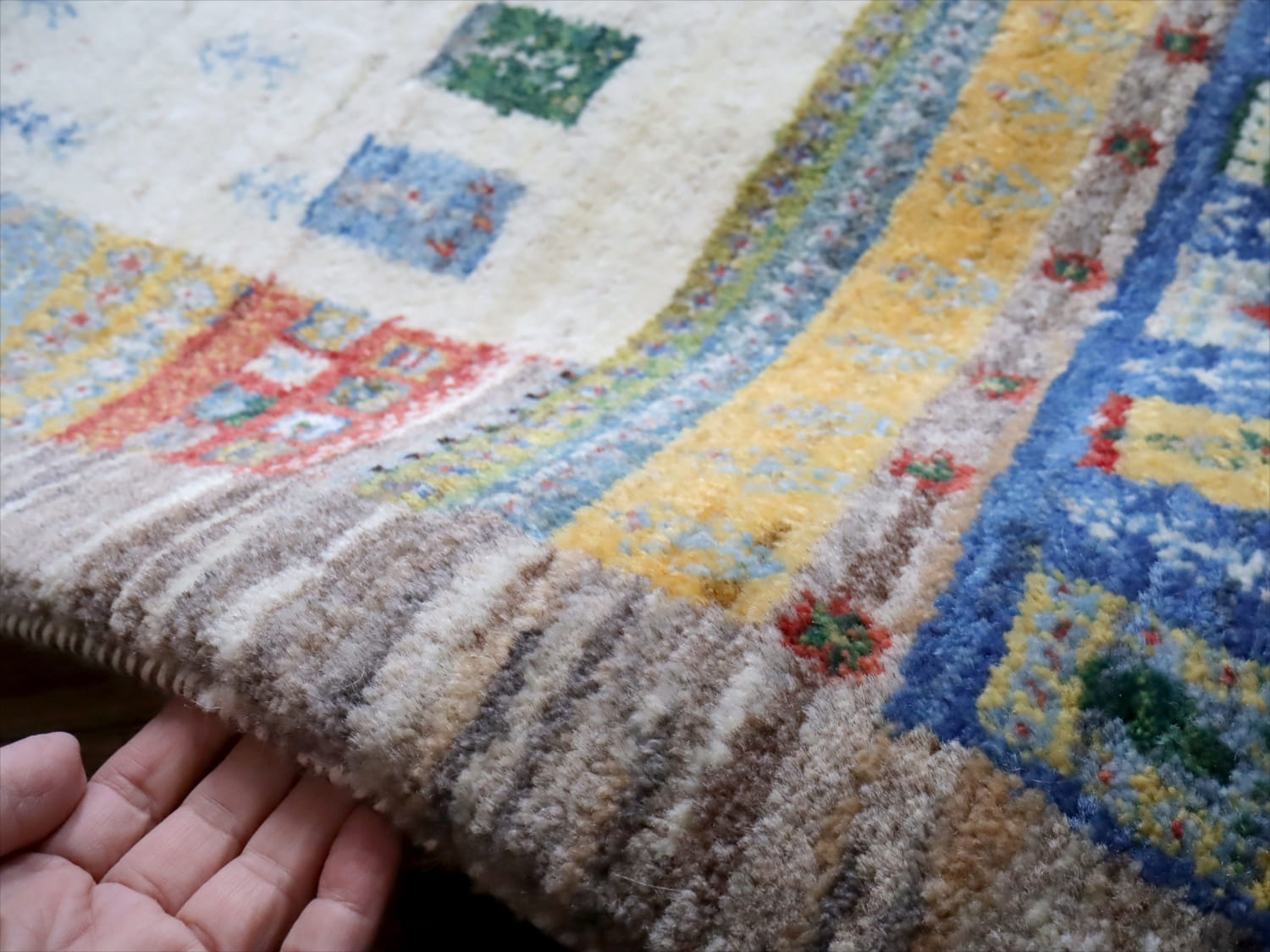 カラフルなタイルモチーフが楽しい、ギャッベらしさのある楽しいデザイン。ベースは天然の羊毛のアイボリーとグレー、そこに様々な色をミックスして、小さなモチーフが織り込まれています。織り目が細かく、素朴さと繊細さを合わせ持ったギャッベです。