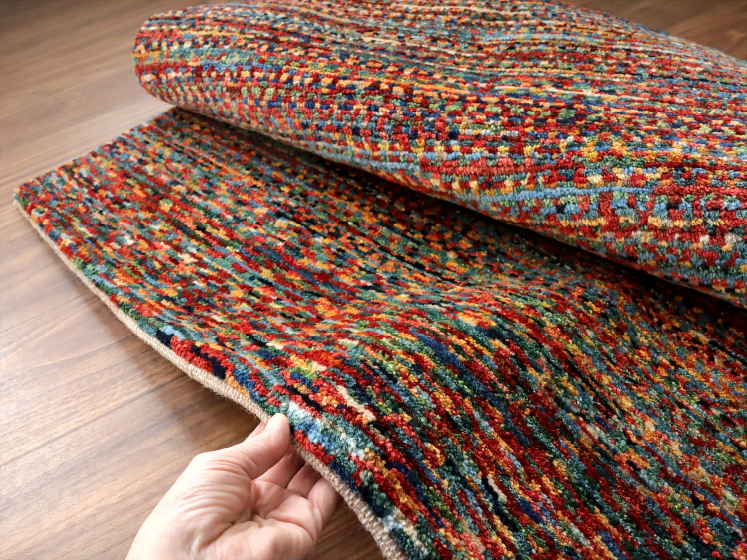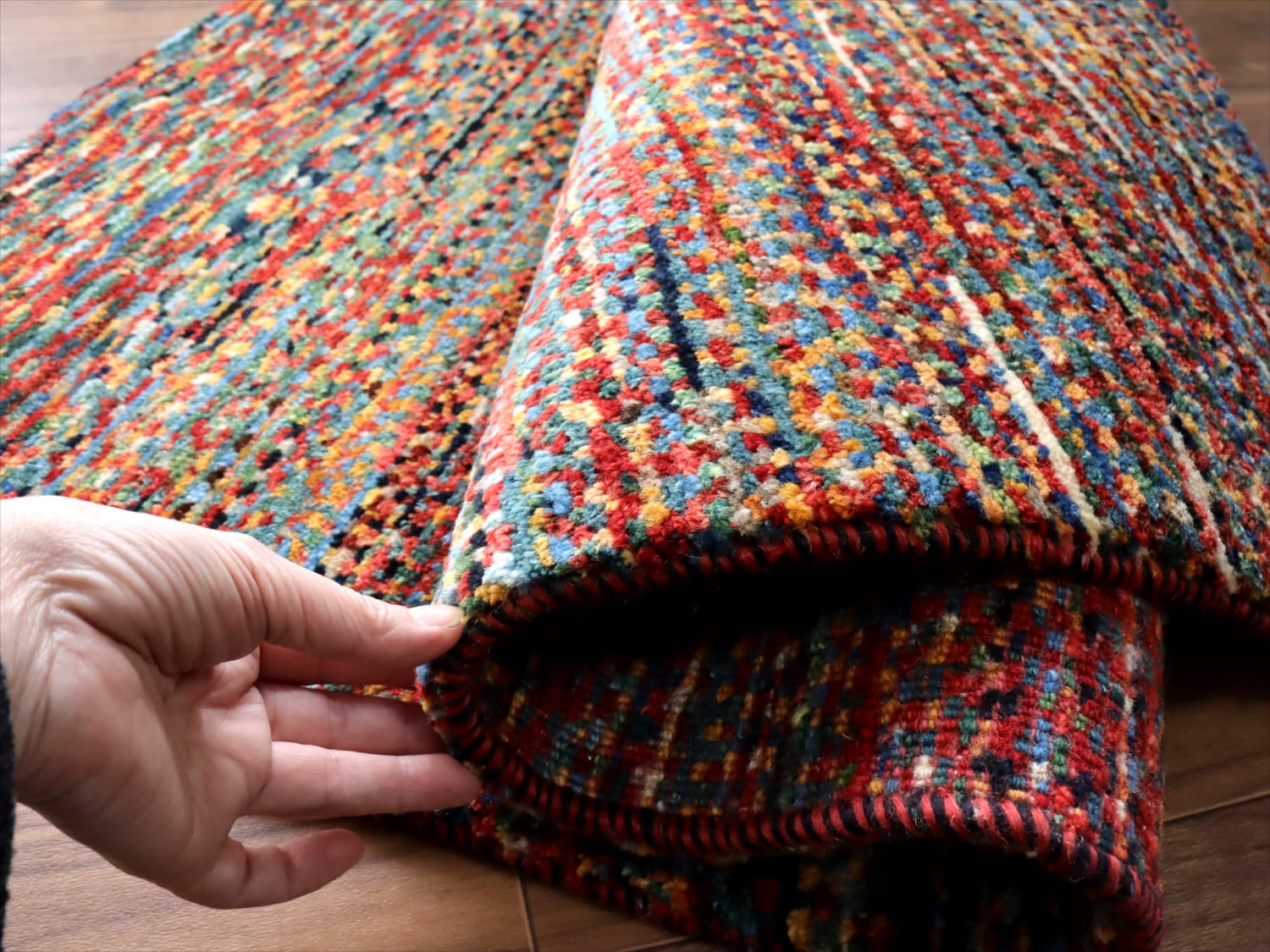 何色ものカラフルな毛糸を使って、織り子さんが色を変えては結んで、色を変えては結んで、を繰り返して仕上げられています。正面から見て下のほうは、ドットの目が大きく変化しているところがユニークです。