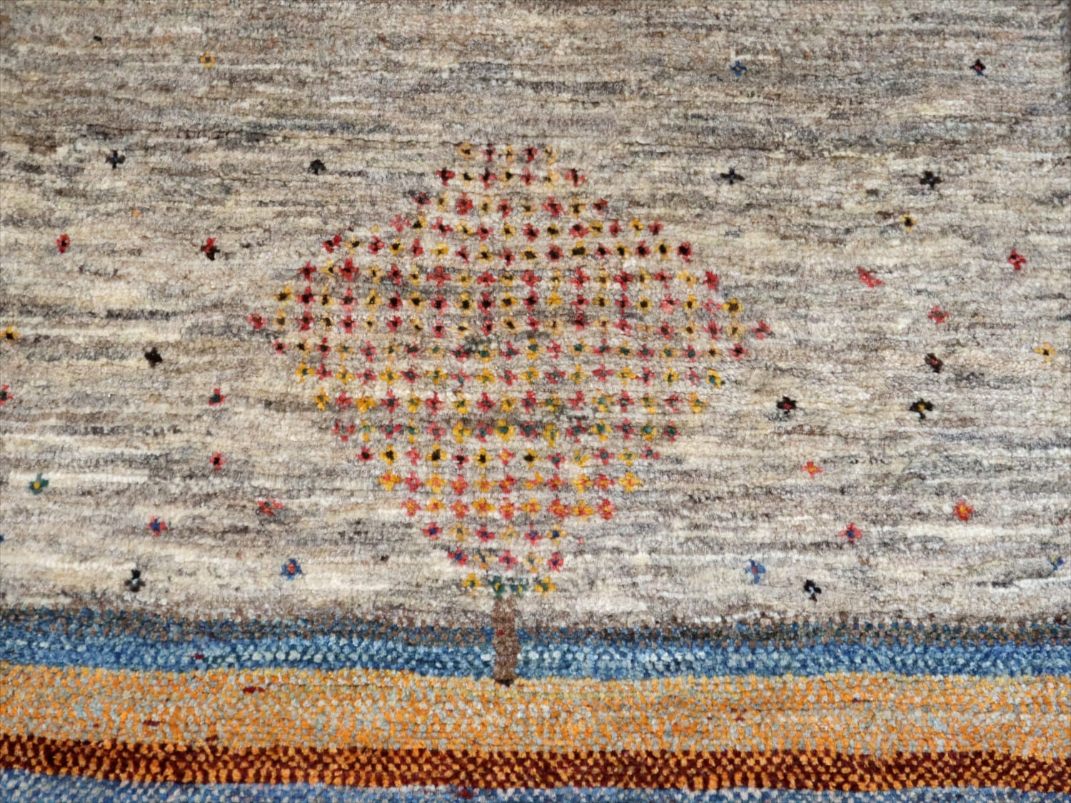 明るい草原に、花をつけた生命の木が立っている、さわやかな風景のギャッベ。空の部分は、天然の羊毛のグレーが使われナチュラルな雰囲気がよく出ています。タペストリーのように飾っても見ごたえがあります!