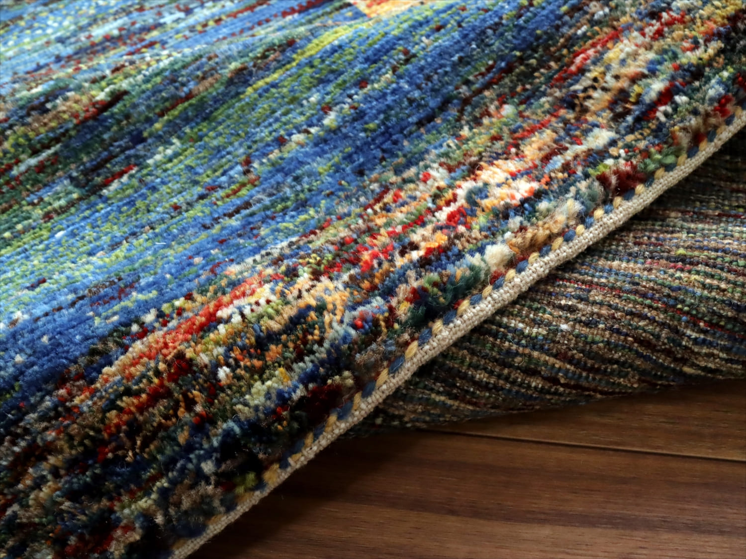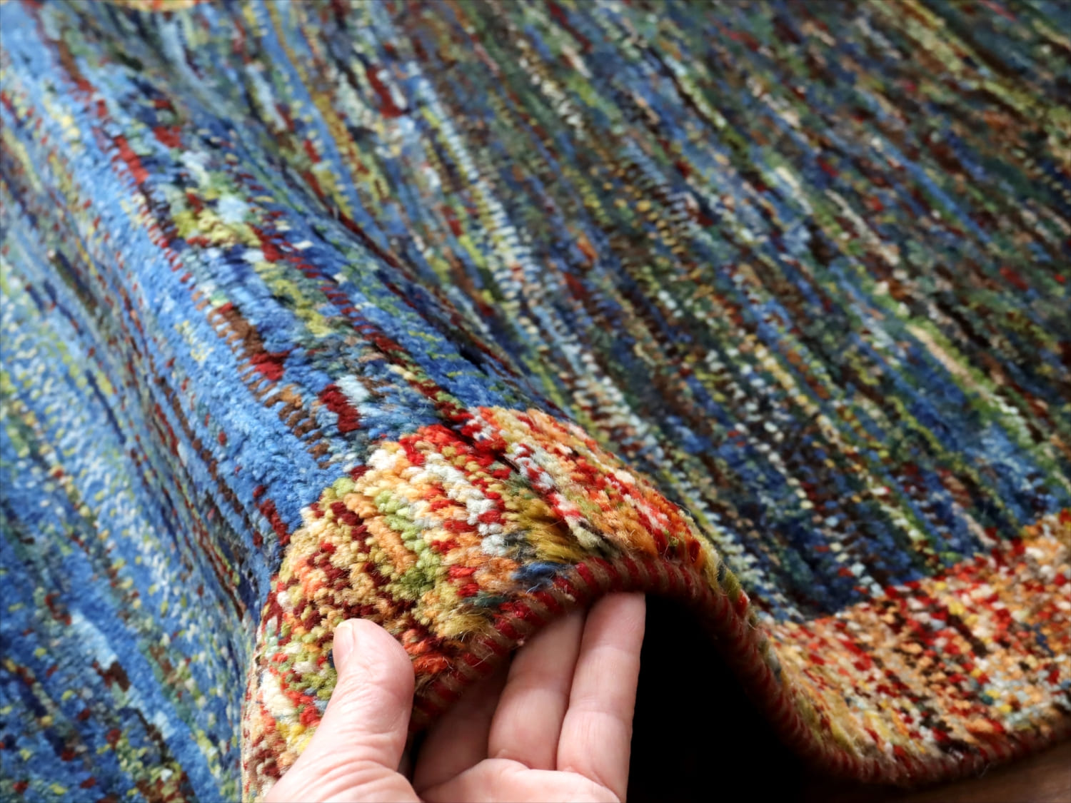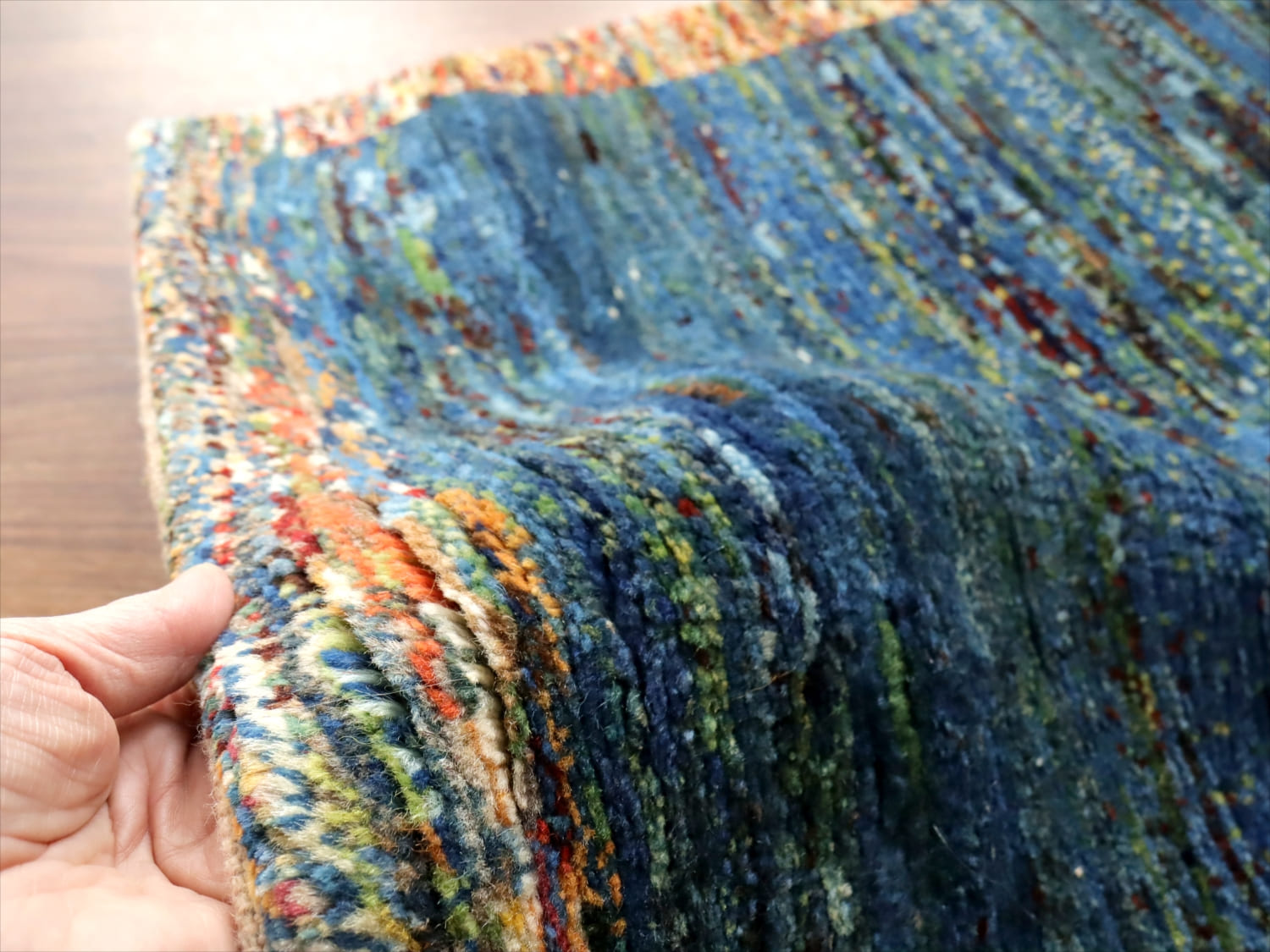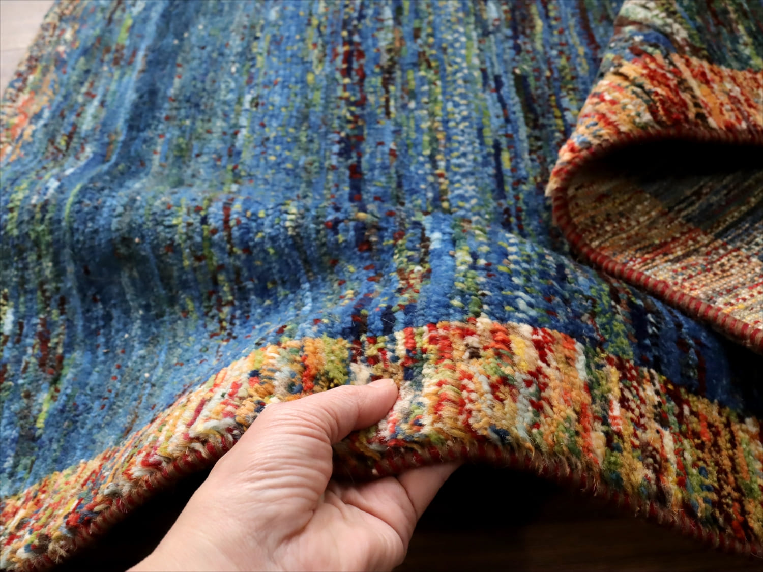 中央は、ブルーとグリーンを合わせたグラデーション、周囲のボーダーは何色もの毛糸をミックスしてドット上に織りあげてあります。