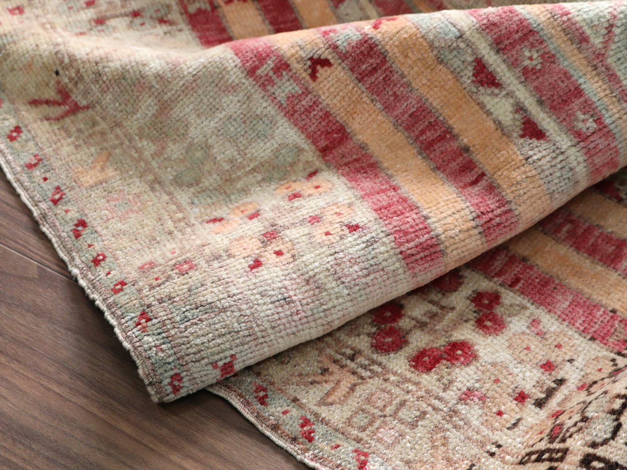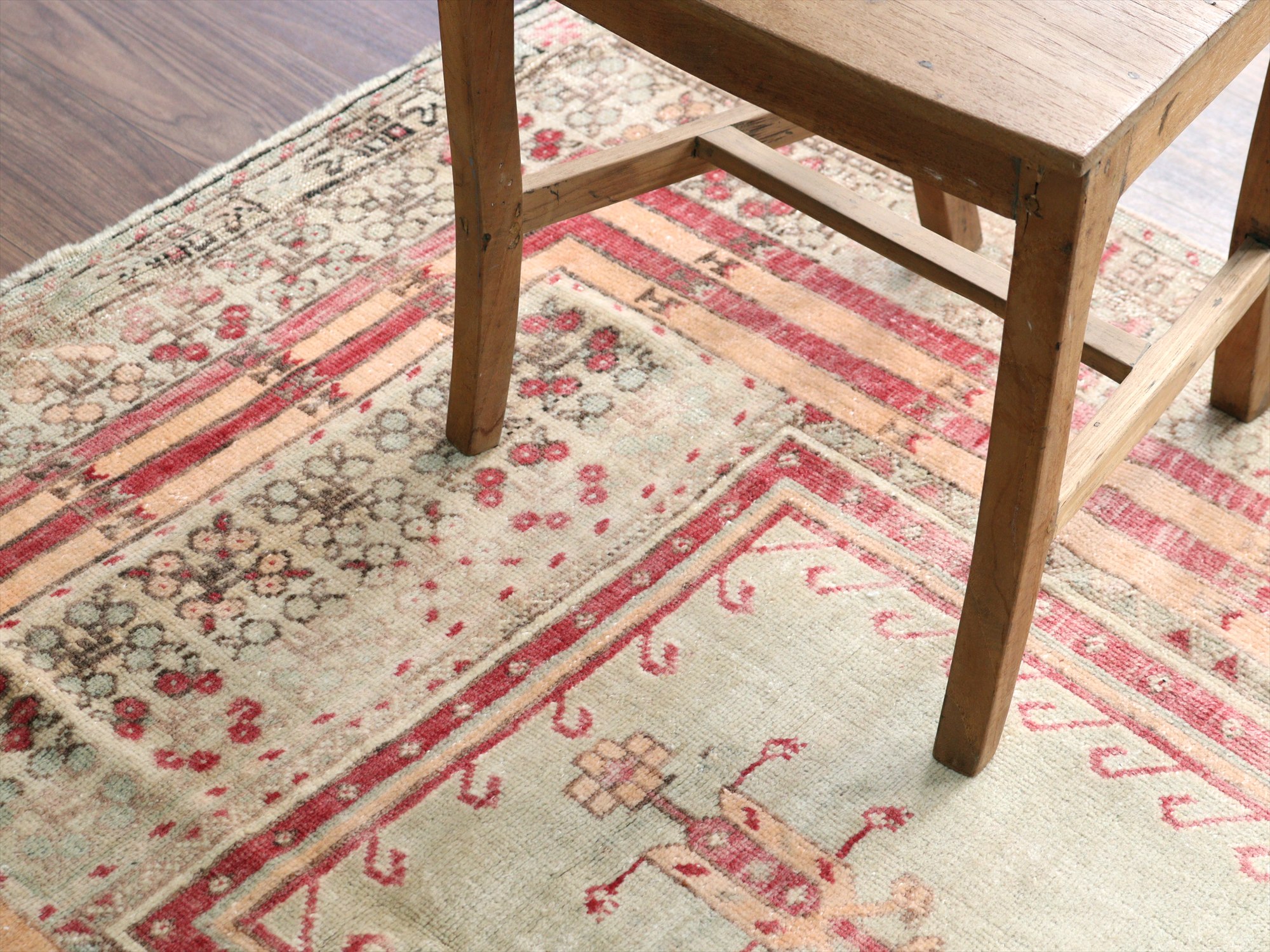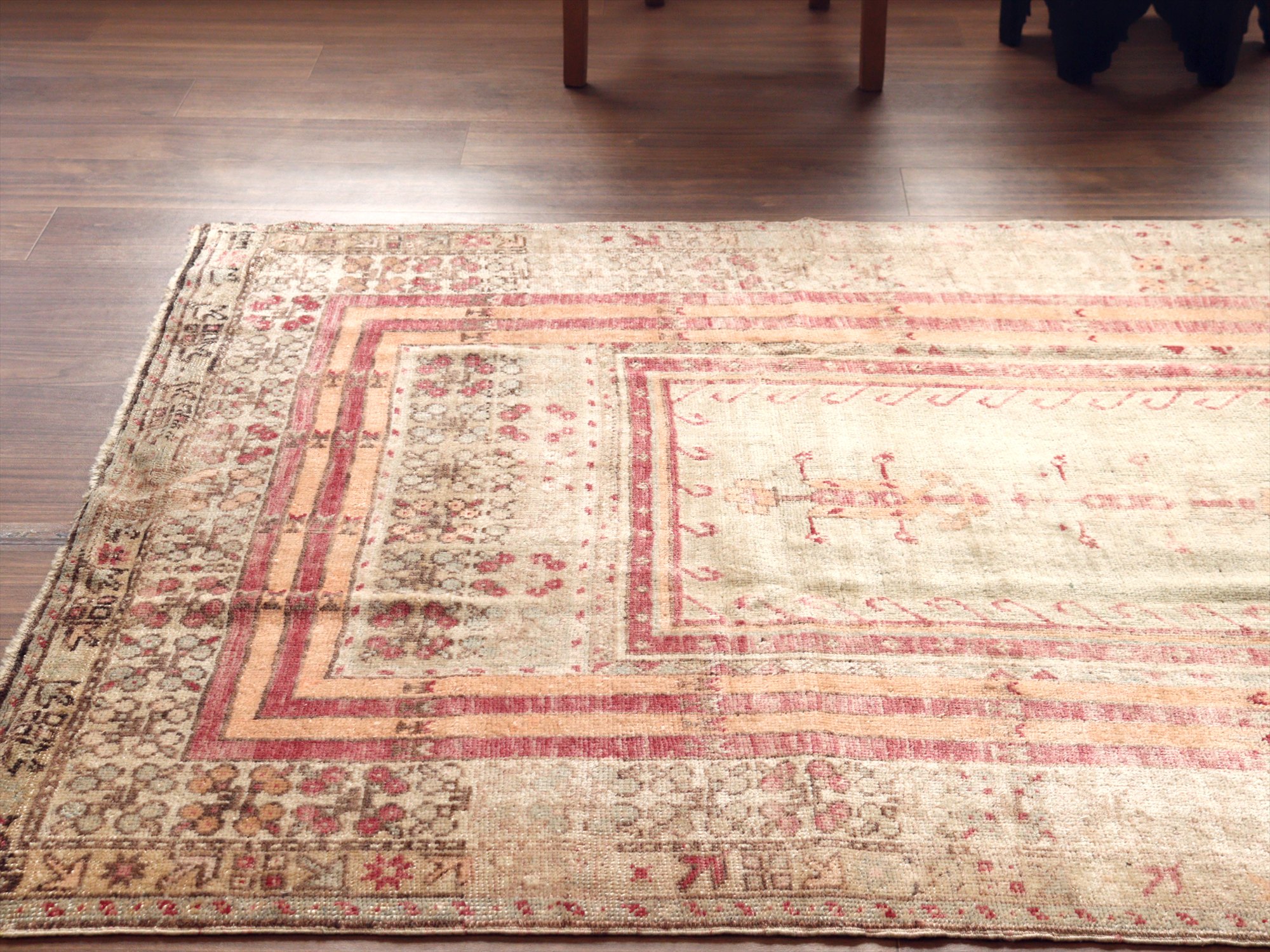グリーン、レッド、オレンジを基調とした色使いで、ミフラープ(お祈りの方向を示すくぼみ)が織られています。日焼けして色褪せたのか、ブリーチによるものなのかは定かではありませんが、だいぶ落ち着いた色合いになりました。特に、グリーンの部分は色褪せたことにより、グレーがかった緑のようにも見えます。