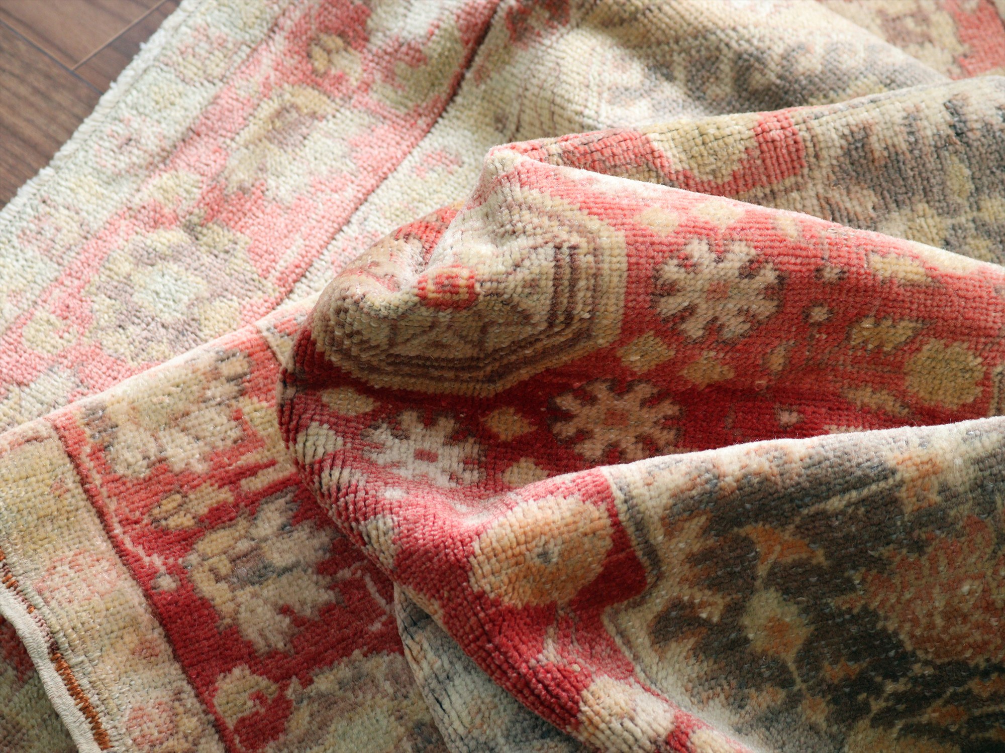 中央にレッドとネイビーの組み合わせでメダリオンがおかれ、その周りと枠部部分には小花が連なるように織られたクラシカルで上品なデザイン。色褪せたことにより、ネイビーの部分はグレーがかって見えます。