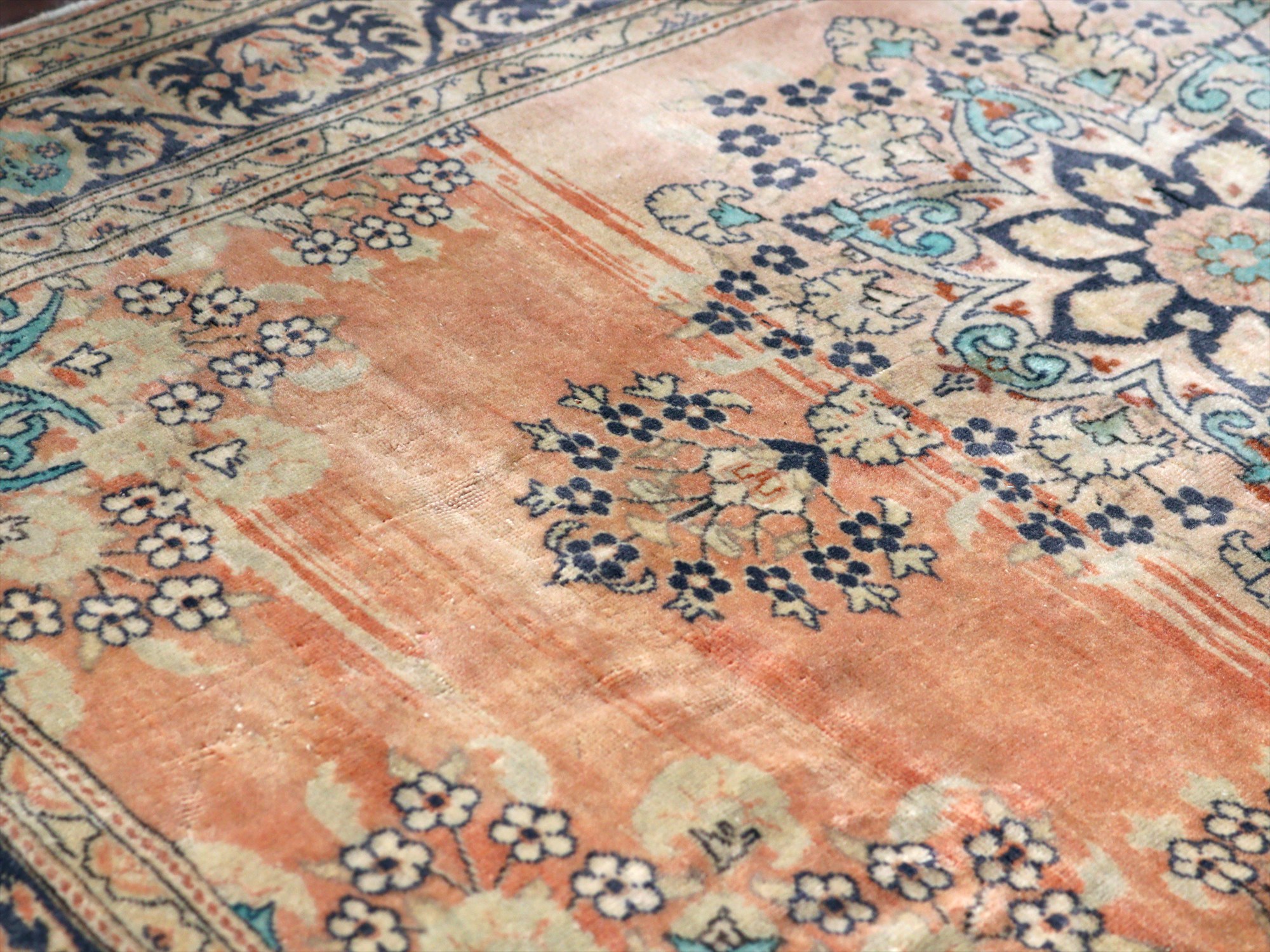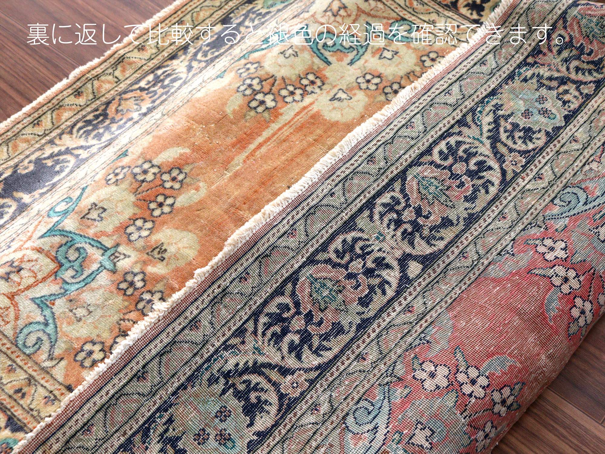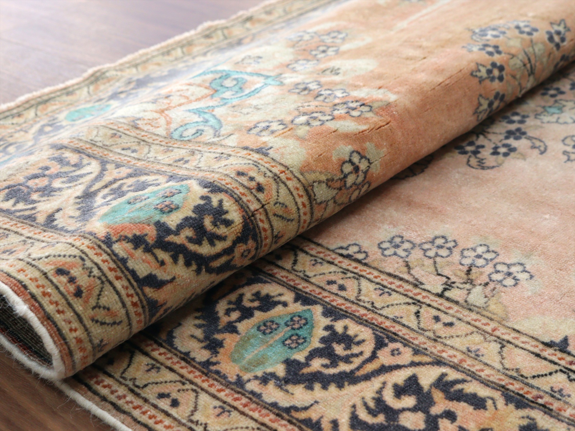 もともとレッドとベージュ基調で織られていたと考えられますが、だいぶ色褪せたことによりパステルカラーに落ち着いています。中央には花形のメダリオン、額縁部分にも花が連なるように描かれた華やかなデザインです。