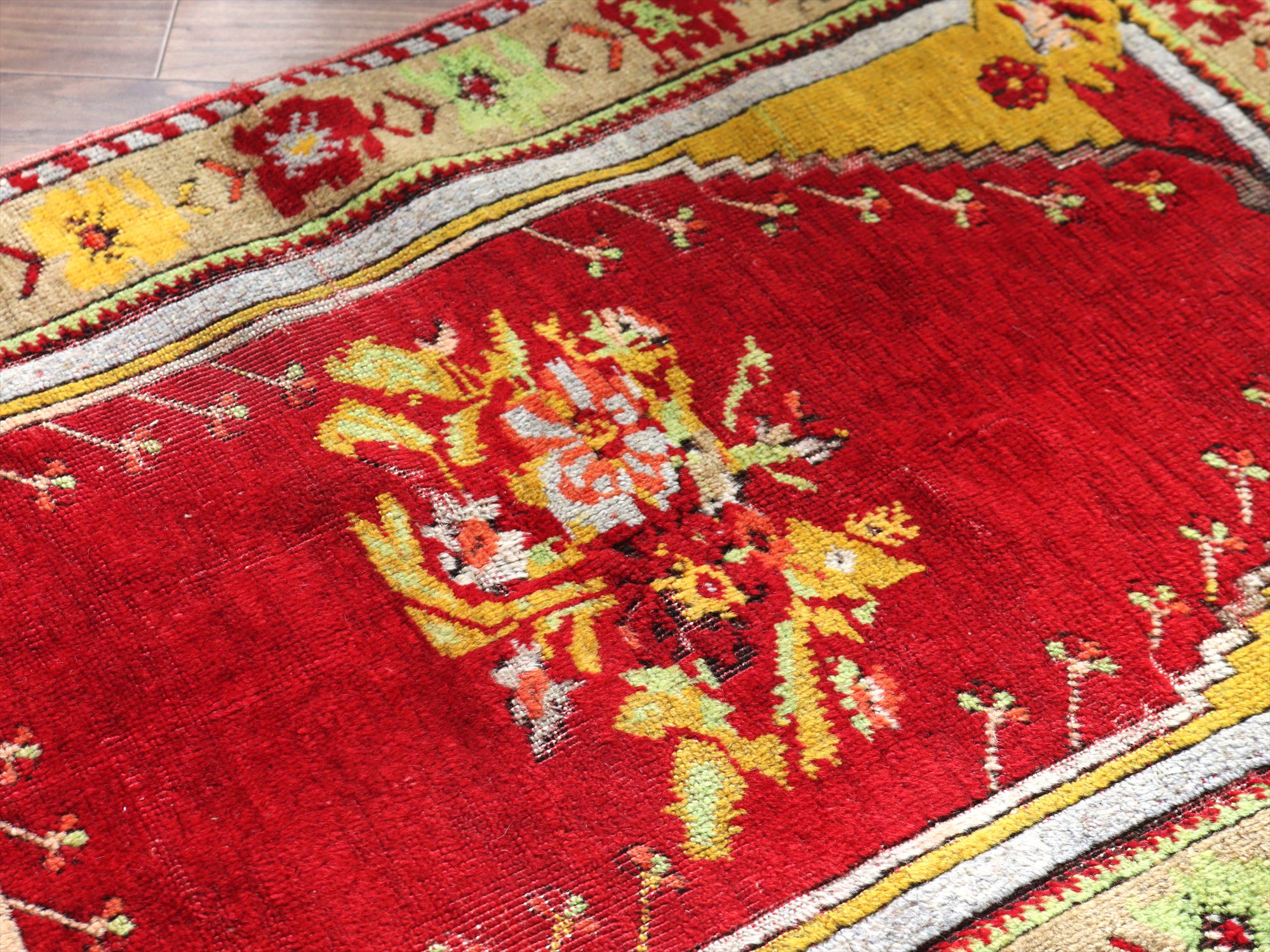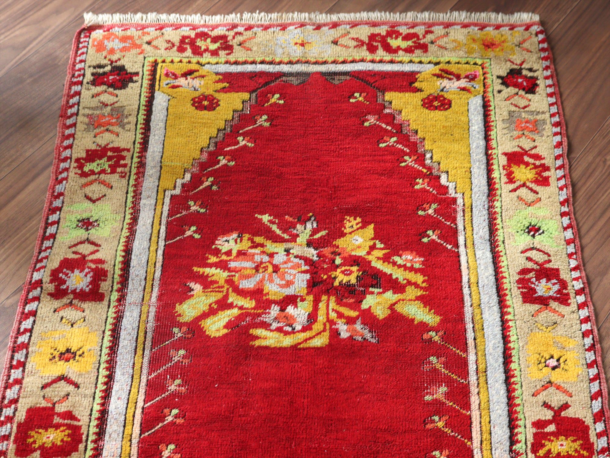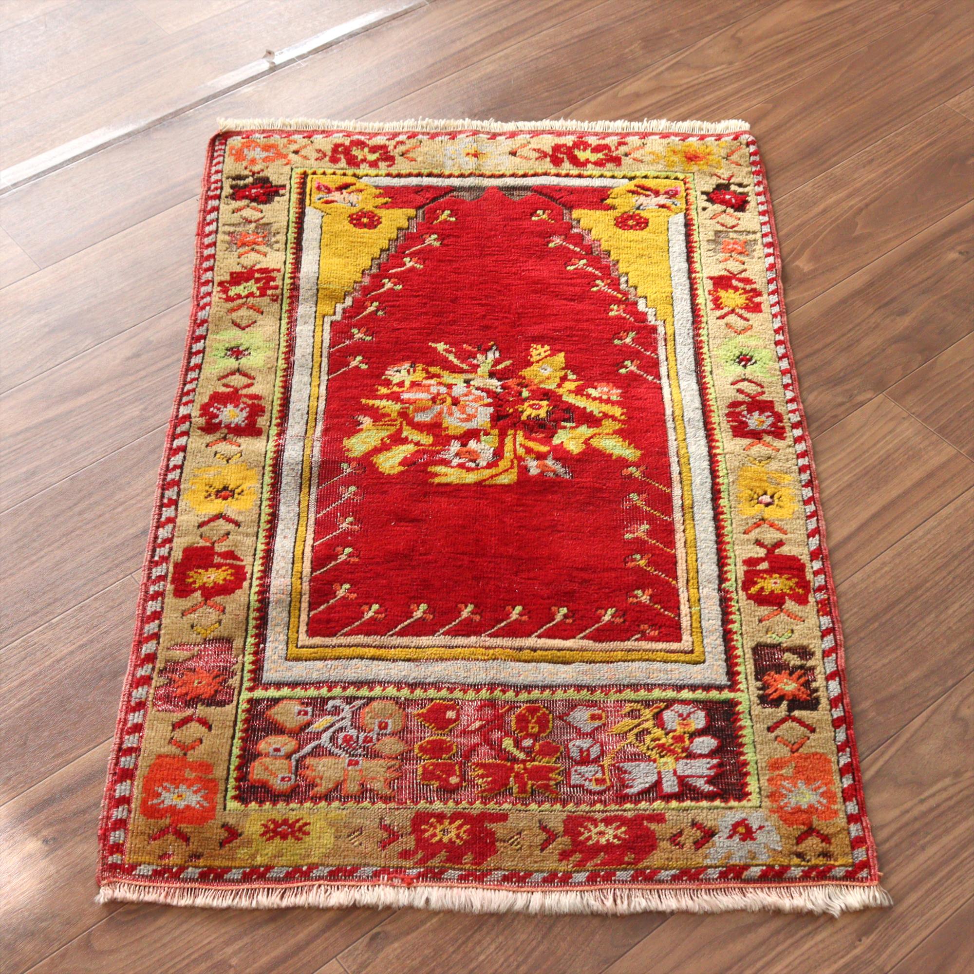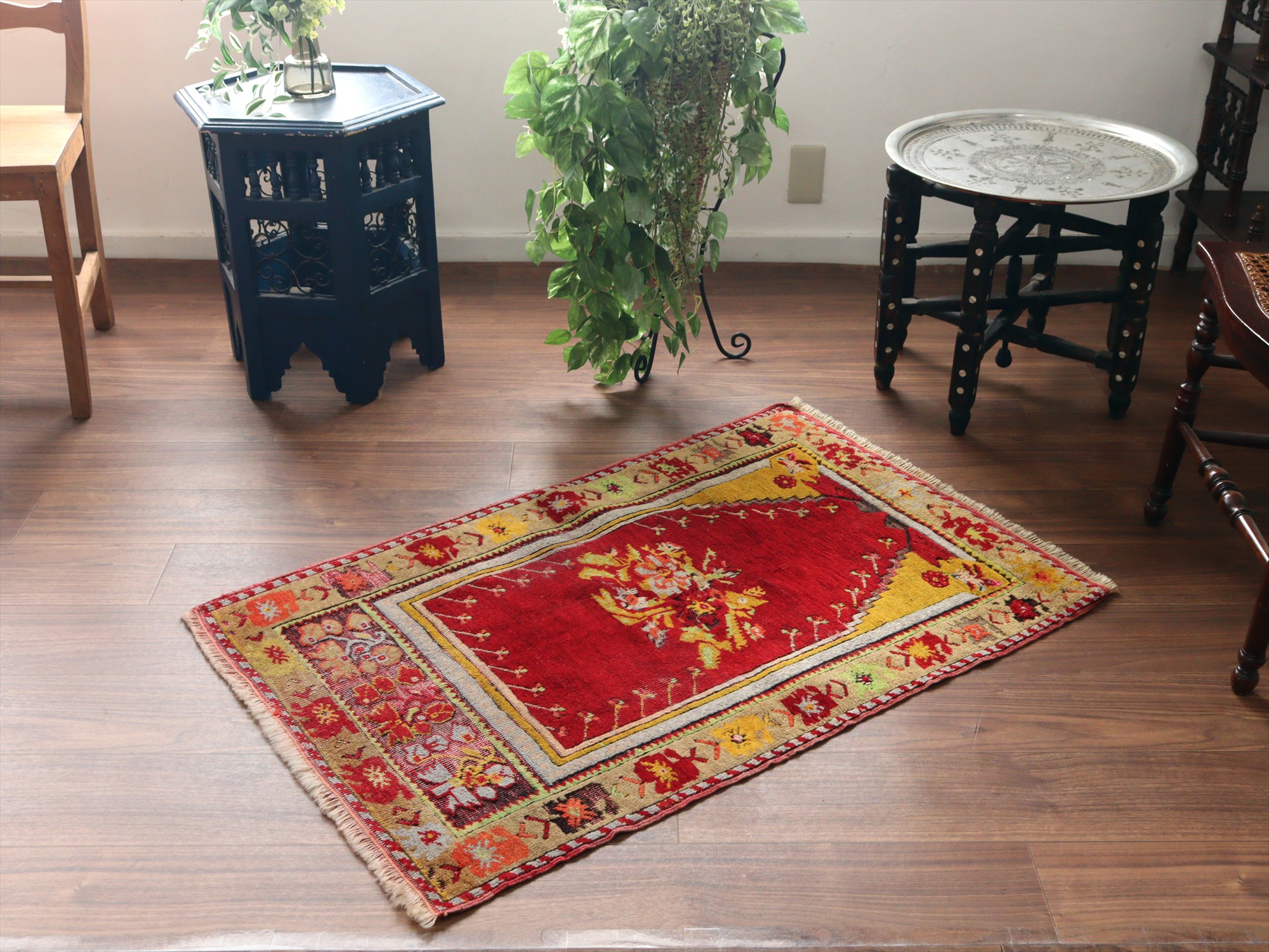 - トルコ絨毯 赤いミフラープ106×69cm フラワーデザイン オールドラグ
