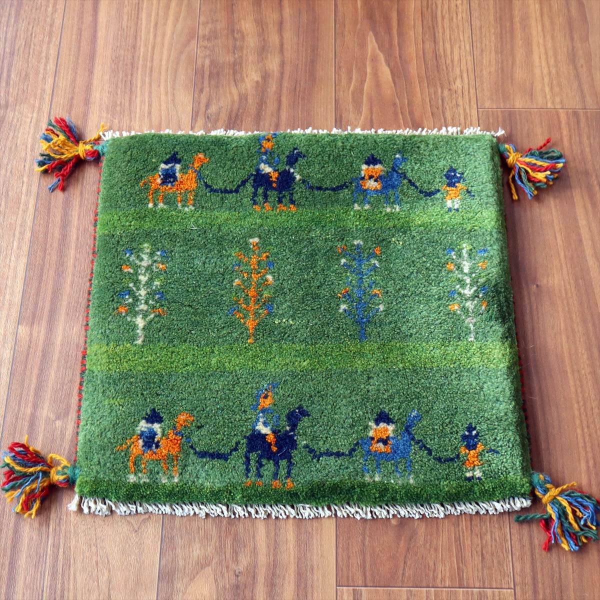 ギャッベ イラン産手織り 座布団サイズ 39×41cm グリーン ラクダのキャラバンとと生命の樹