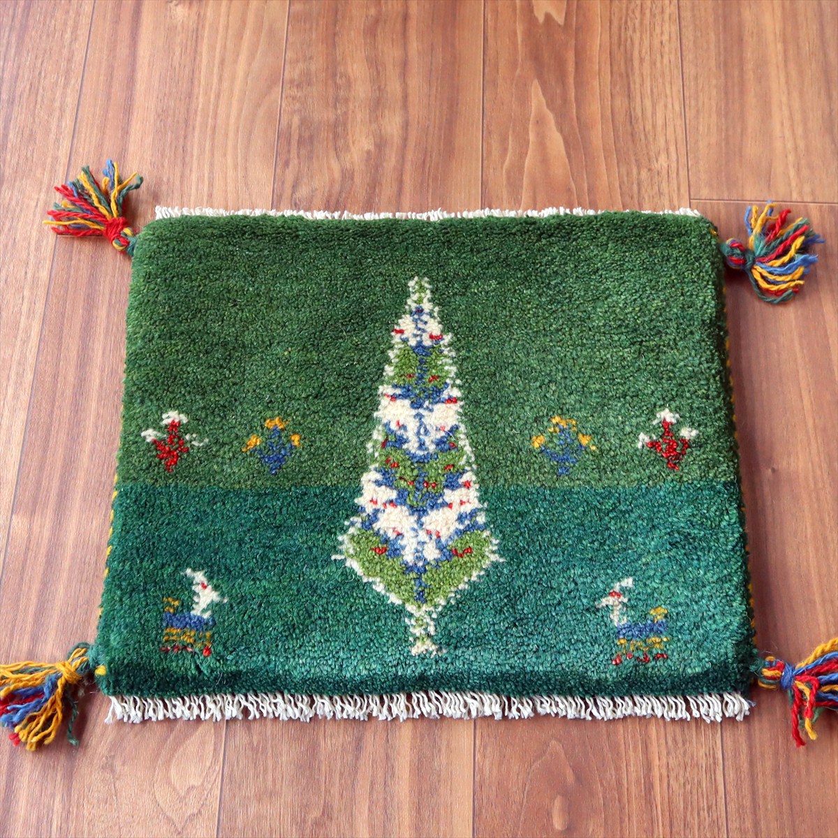 - ギャッベ イラン産手織り 座布団サイズ 34×41cm グリーン 動物と糸杉